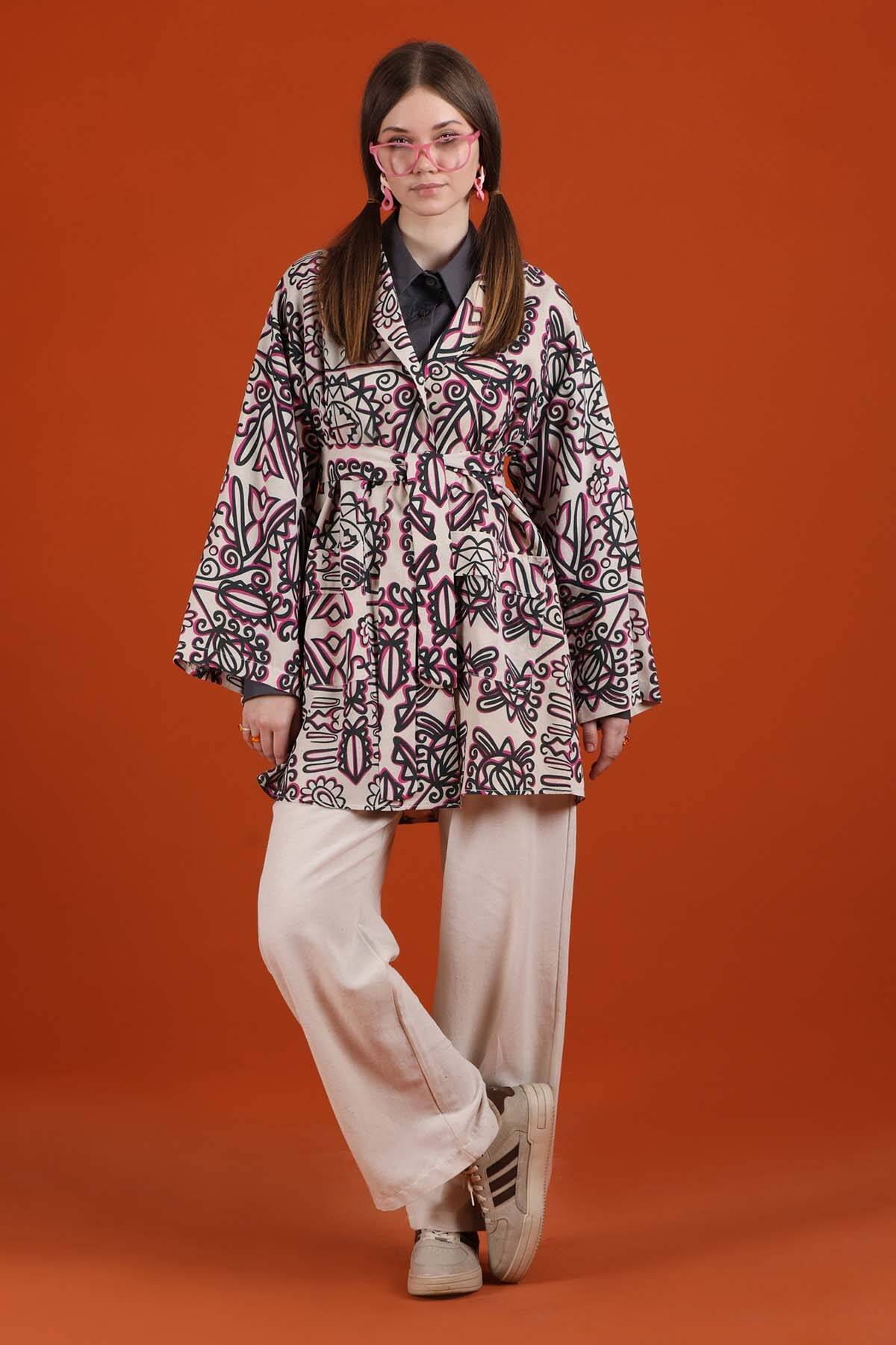 Belden kuşaklı,düğmesiz. Pantolon beli düğmelidir,ceplidir. İç göstermez.