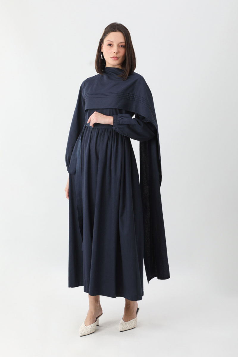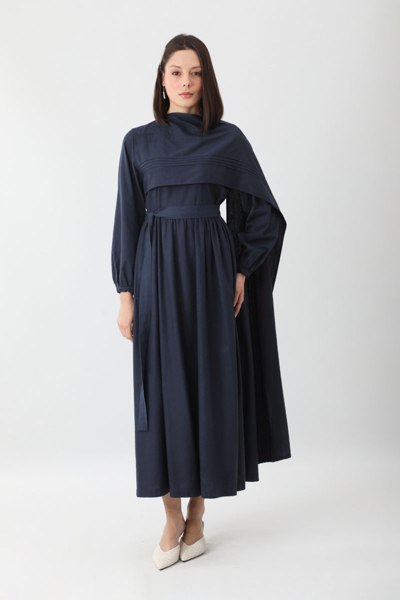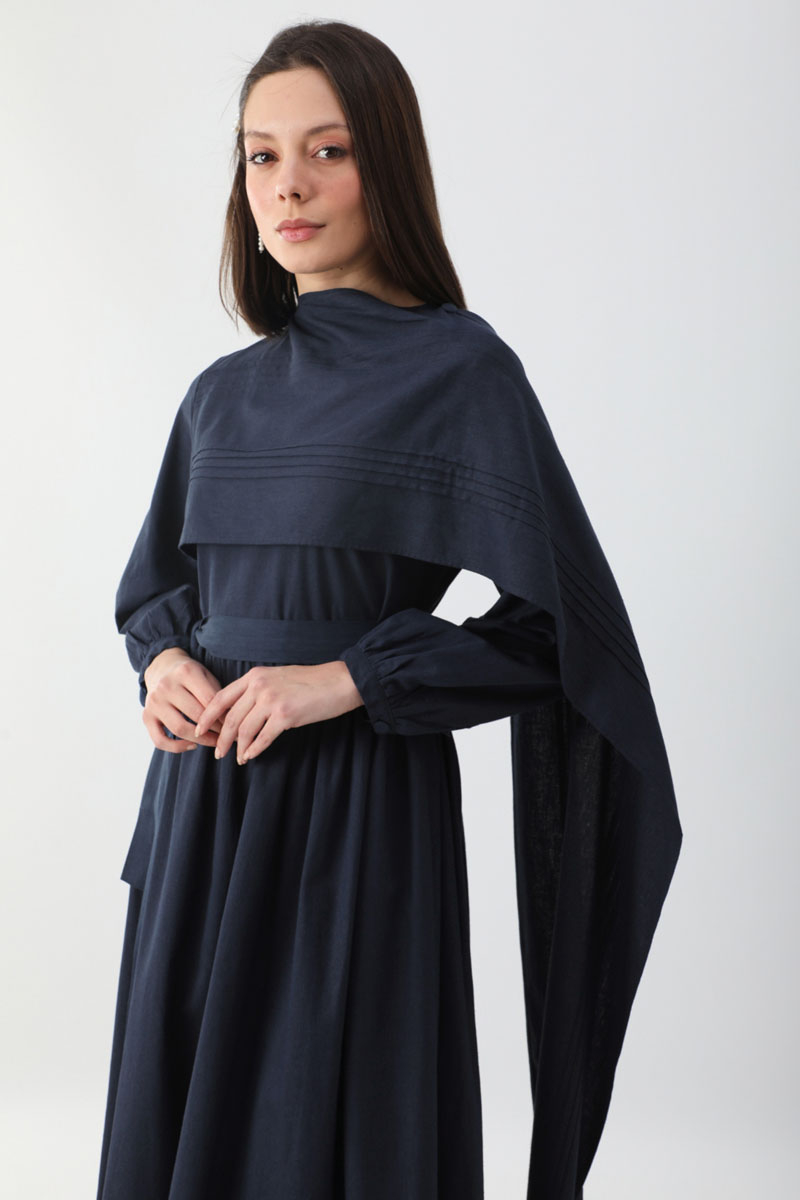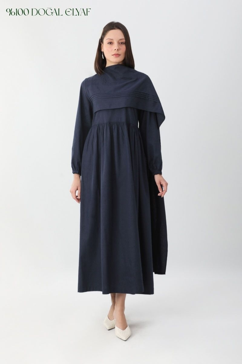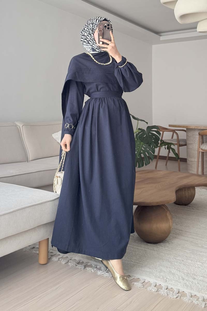 Ahuse Elbise Lacivert. Bisiklet yakadır, nervür parça detaylıdır omuzdan düğmelenebilir. Belden roba büzgü detaylıdır, kol ucu büzgü ve ince manşetlidir, beli kuşaklıdır,yandan ceplidir, astarsızdır, arkadan yarım gizili düğmelidir iç göstermez. Günlük kullanım ve özel günlerinizde tercih edebilirsiniz.