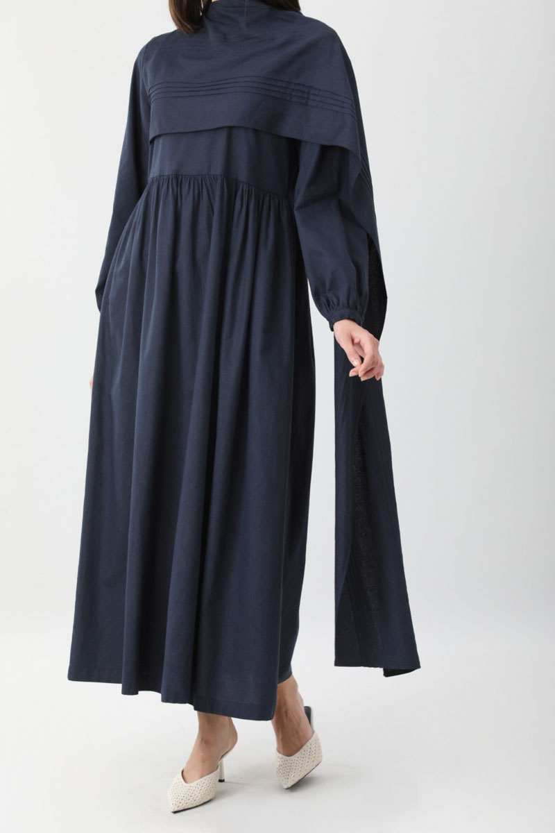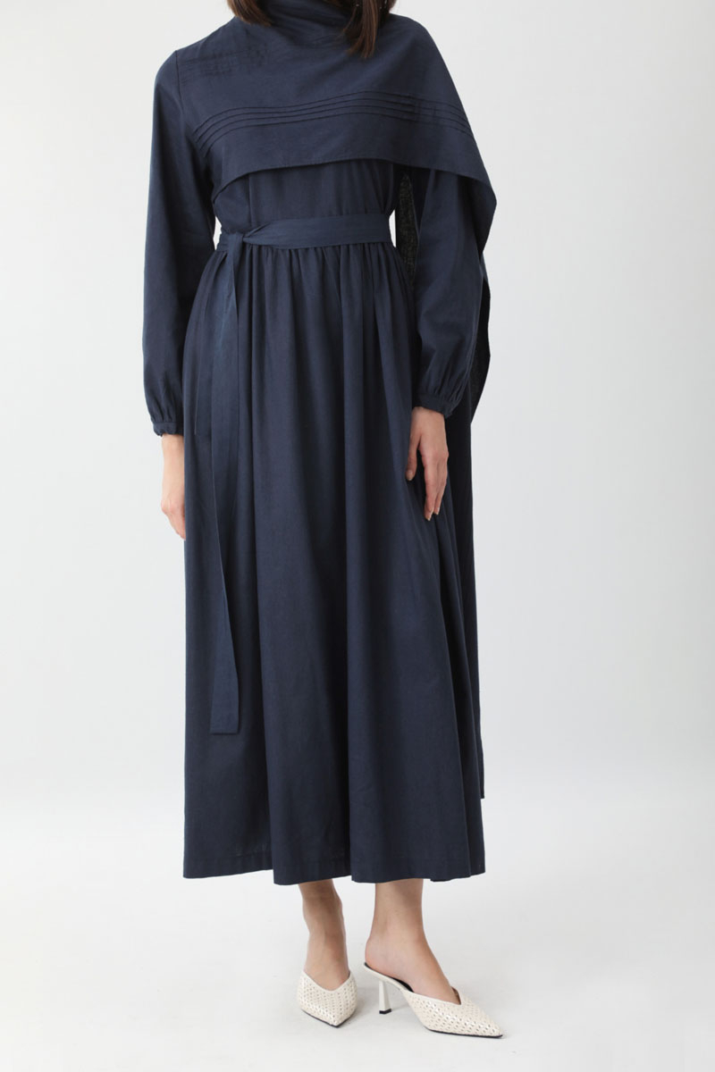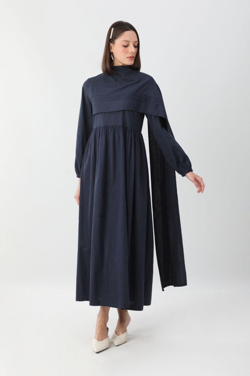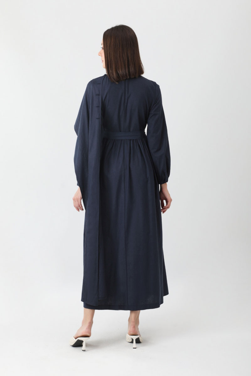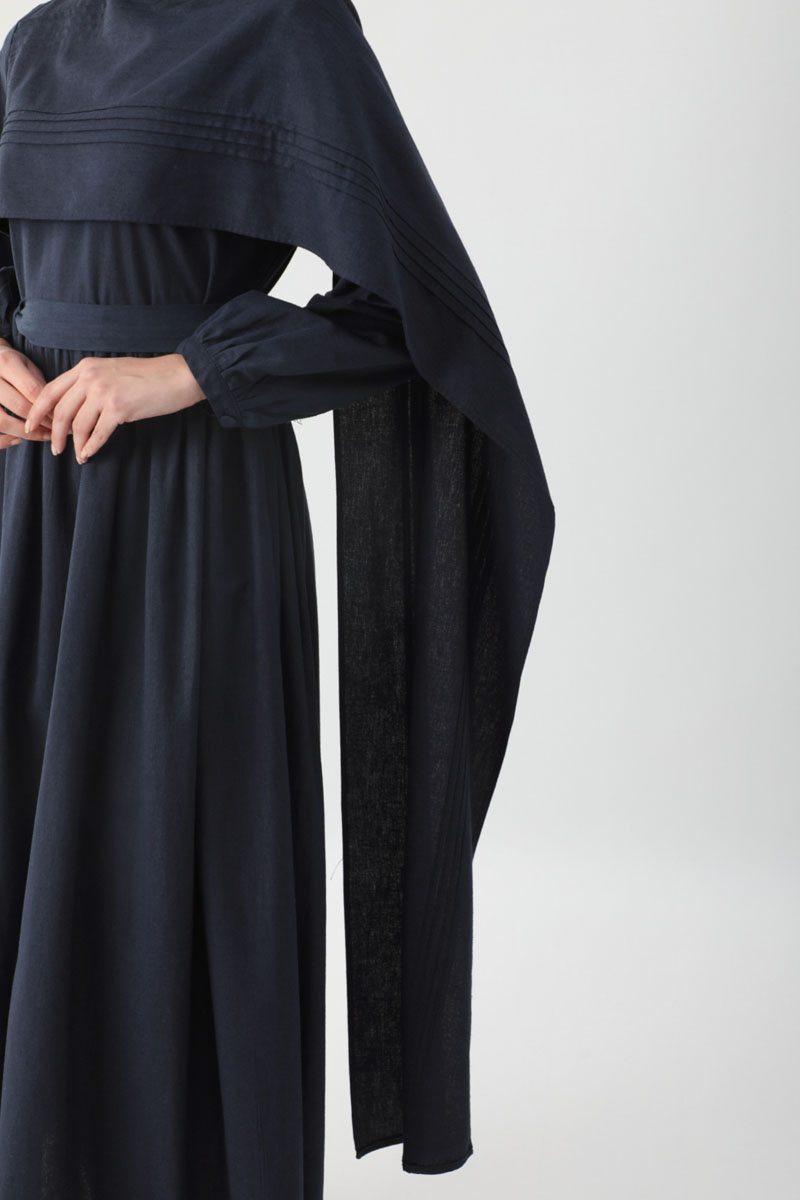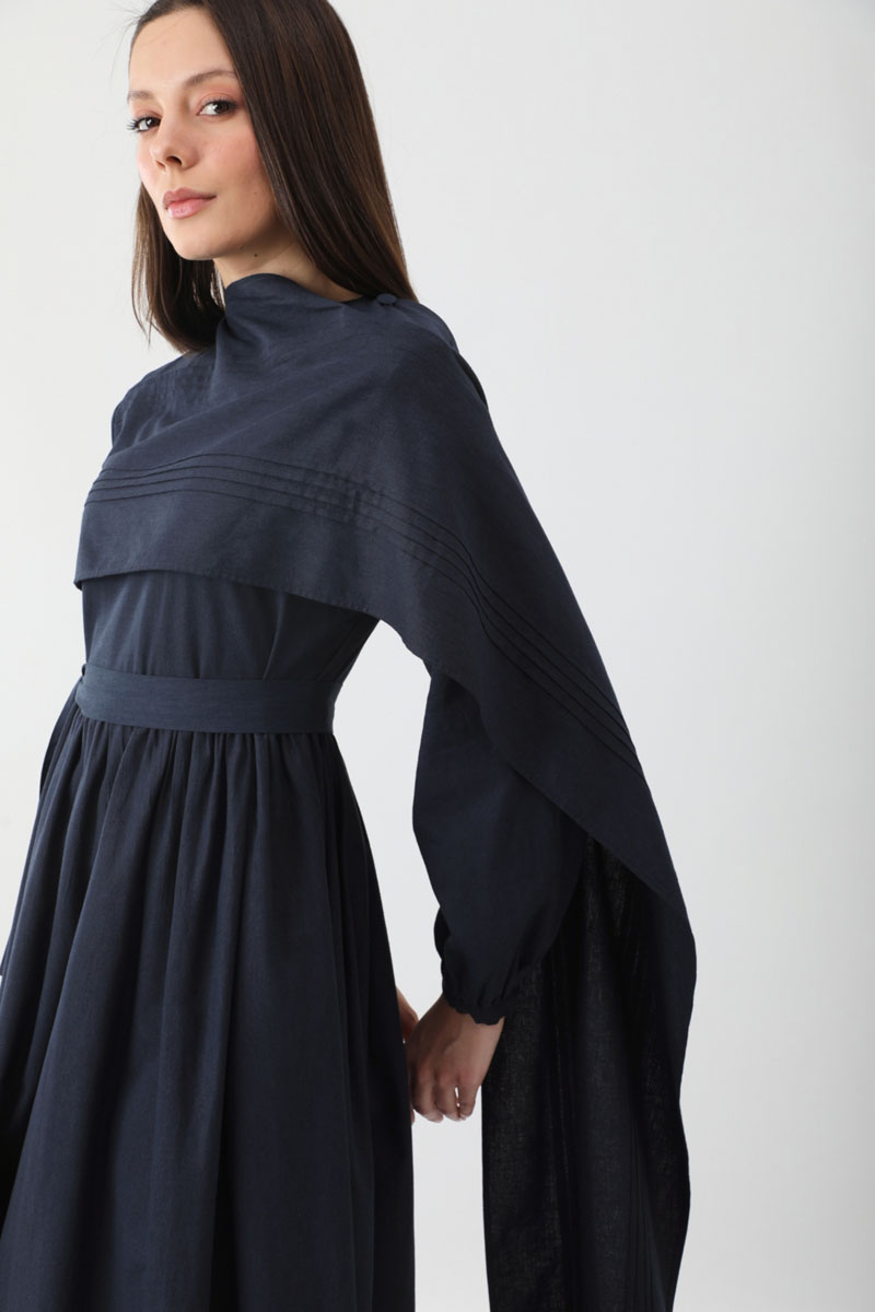 Ahuse Elbise Lacivert. Bisiklet yakadır, nervür parça detaylıdır omuzdan düğmelenebilir. Belden roba büzgü detaylıdır, kol ucu büzgü ve ince manşetlidir, beli kuşaklıdır,yandan ceplidir, astarsızdır, arkadan yarım gizili düğmelidir iç göstermez. Günlük kullanım ve özel günlerinizde tercih edebilirsiniz.