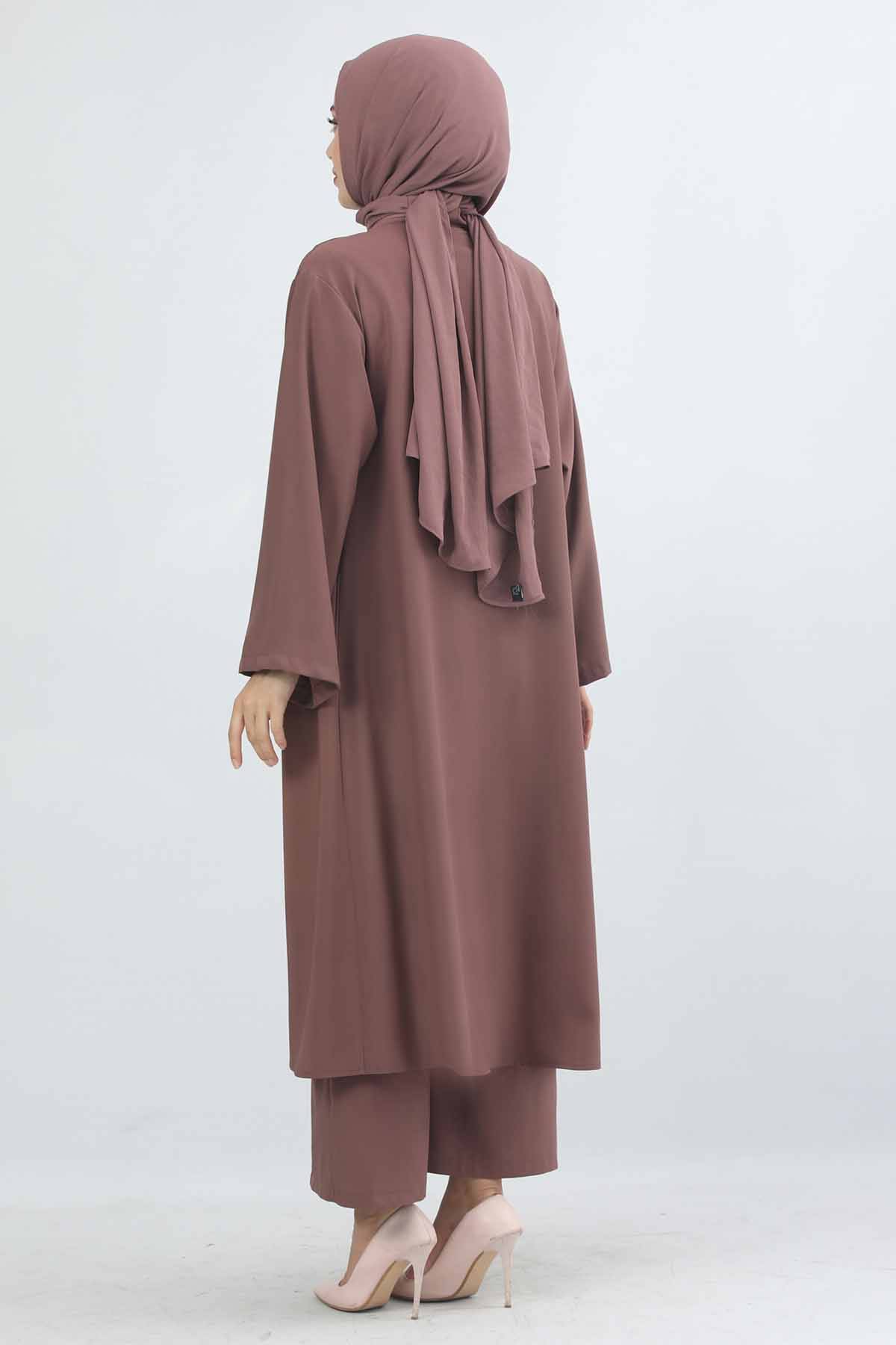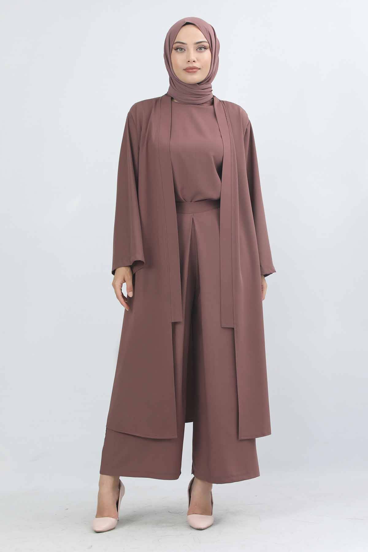 Aisha sıfır kol bluz, kimono ve pantolon olmak üzere üçlü takımdan oluşmaktadır. Astarlı değildir İç göstermez tesettür giyime oldukça uygundur. Ürün tam kalıptır.