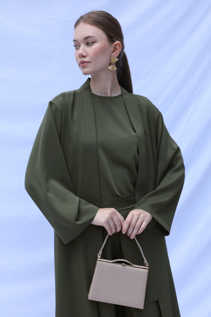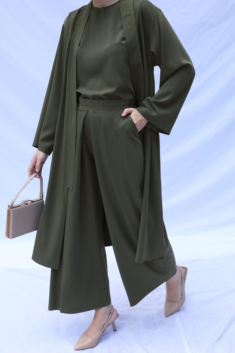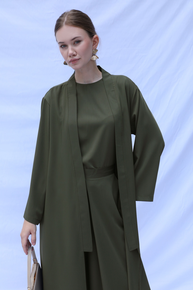 Aisha sıfır kol bluz, kimono ve pantolon olmak üzere üçlü takımdan oluşmaktadır. Astarlı değildir İç göstermez tesettür giyime oldukça uygundur. Ürün tam kalıptır.