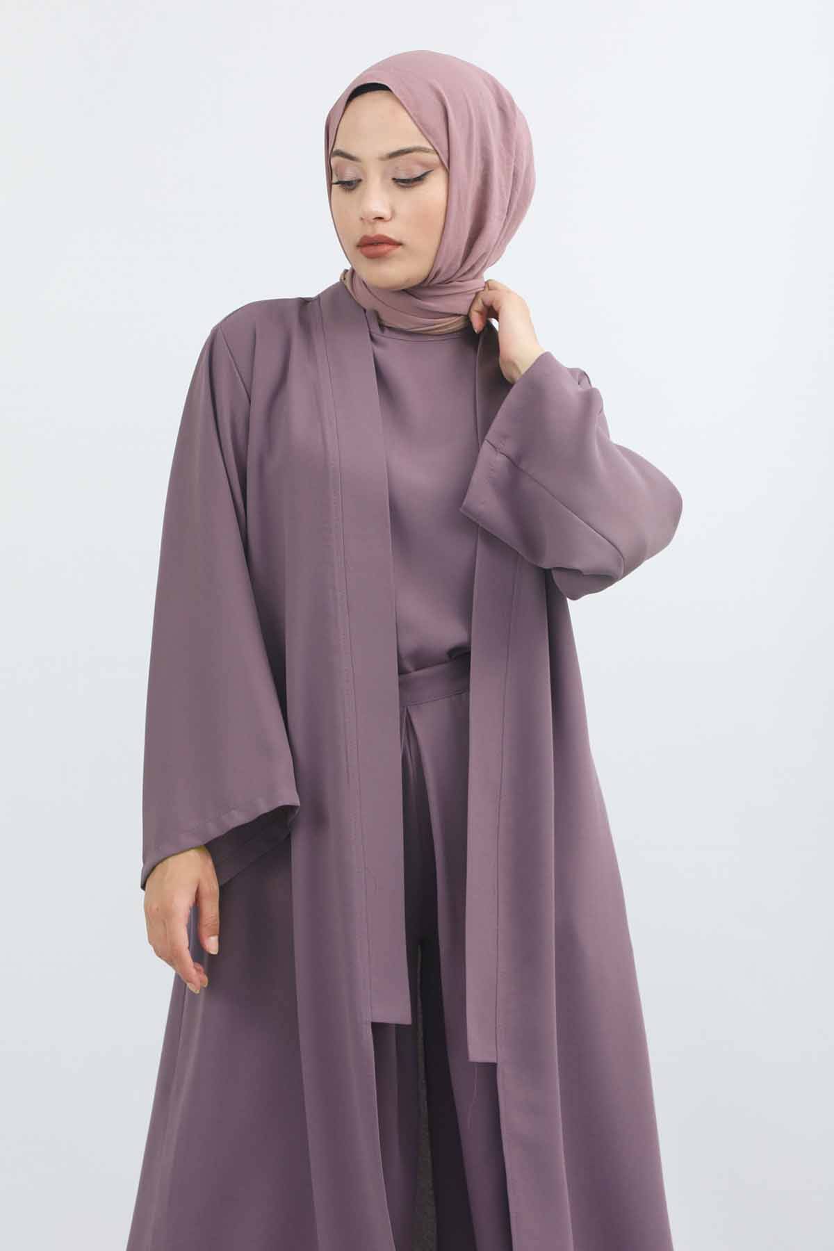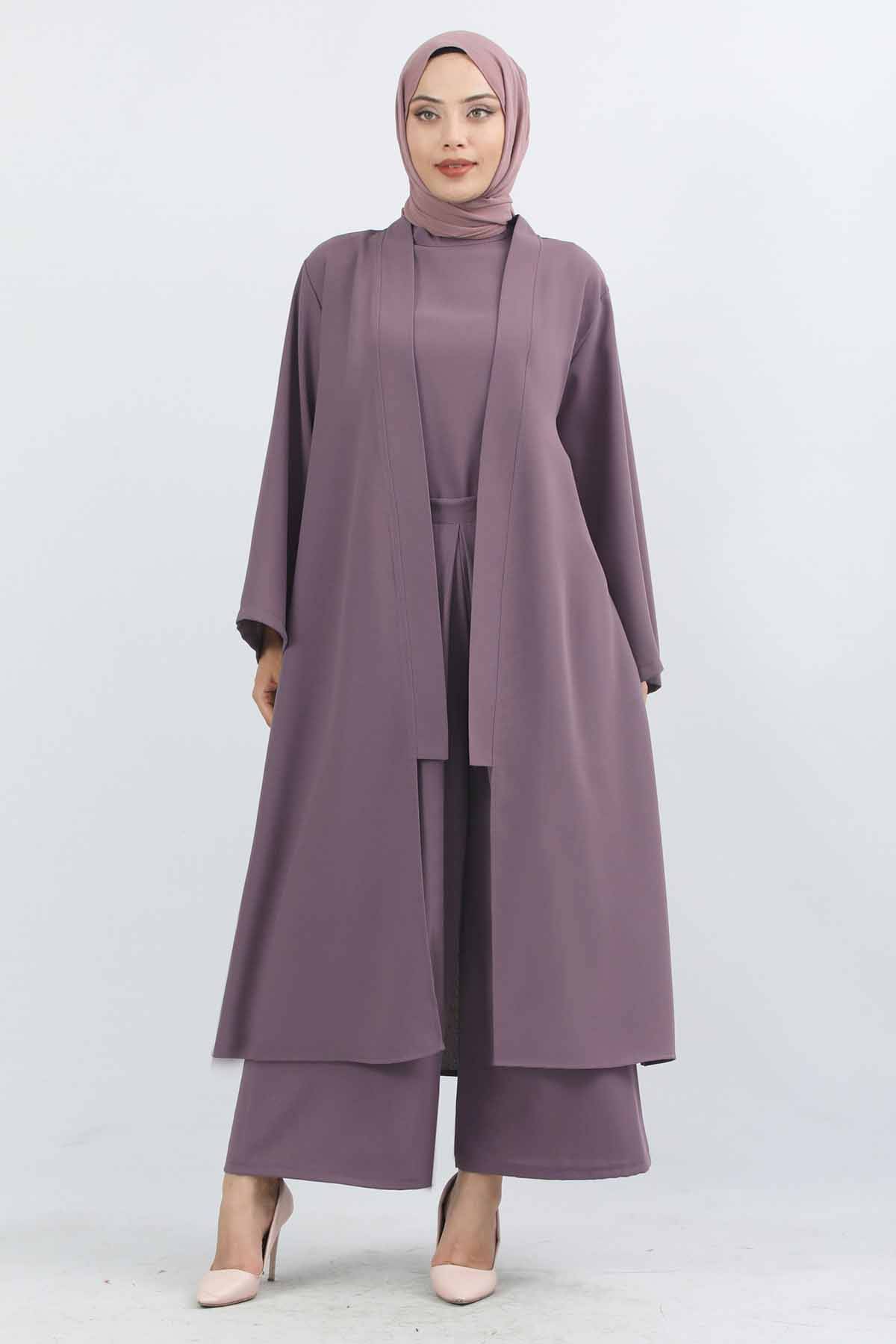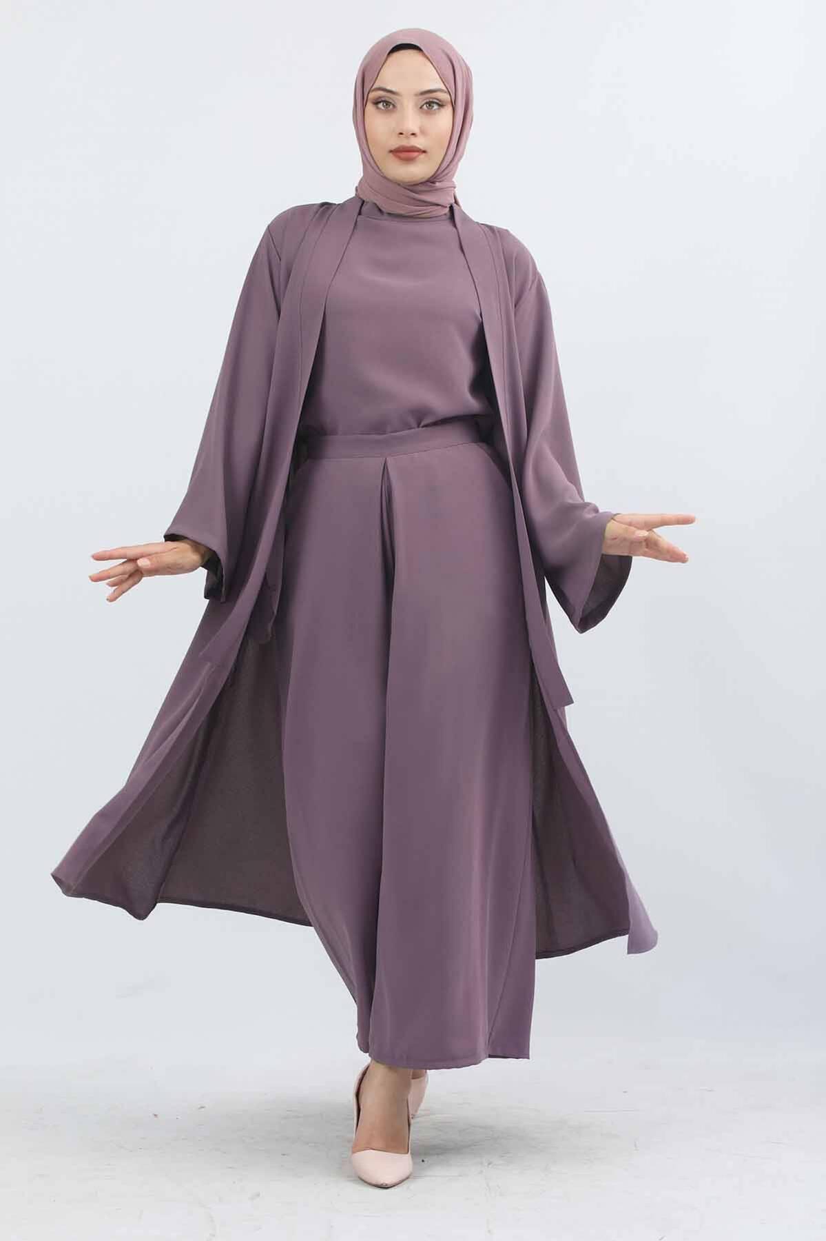 Aisha sıfır kol bluz, kimono ve pantolon olmak üzere üçlü takımdan oluşmaktadır. Astarlı değildir İç göstermez tesettür giyime oldukça uygundur. Ürün tam kalıptır.