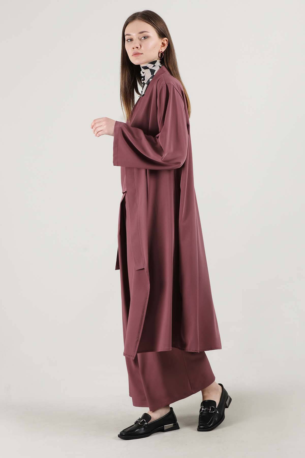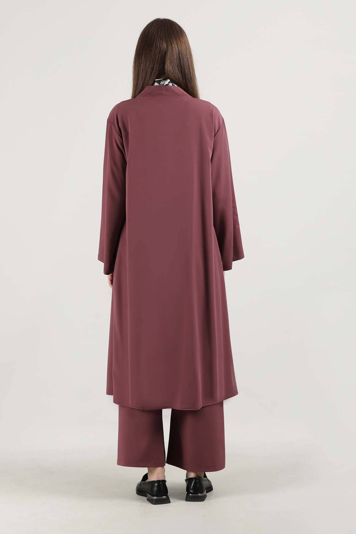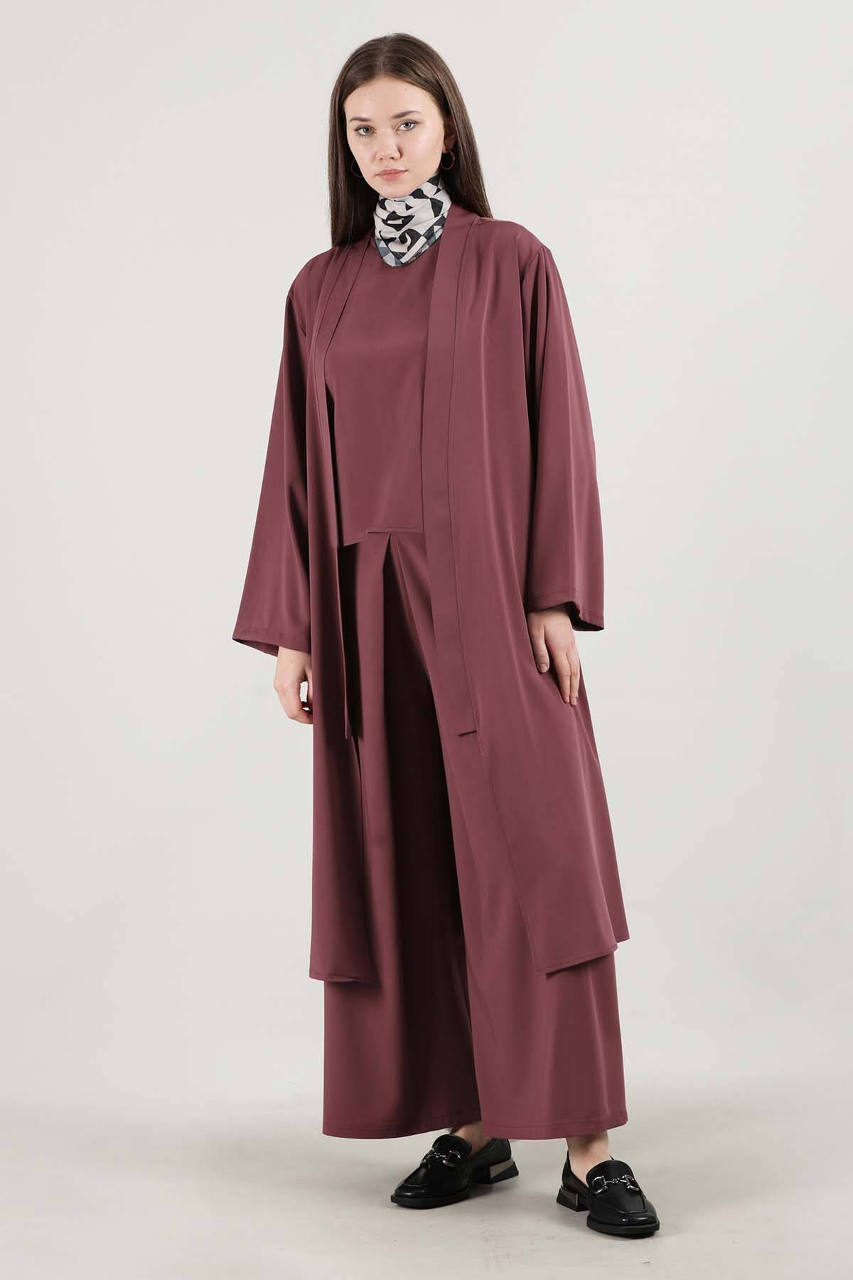 Aisha sıfır kol bluz, kimono ve pantolon olmak üzere üçlü takımdan oluşmaktadır. Astarlı değildir İç göstermez tesettür giyime oldukça uygundur. Ürün tam kalıptır.