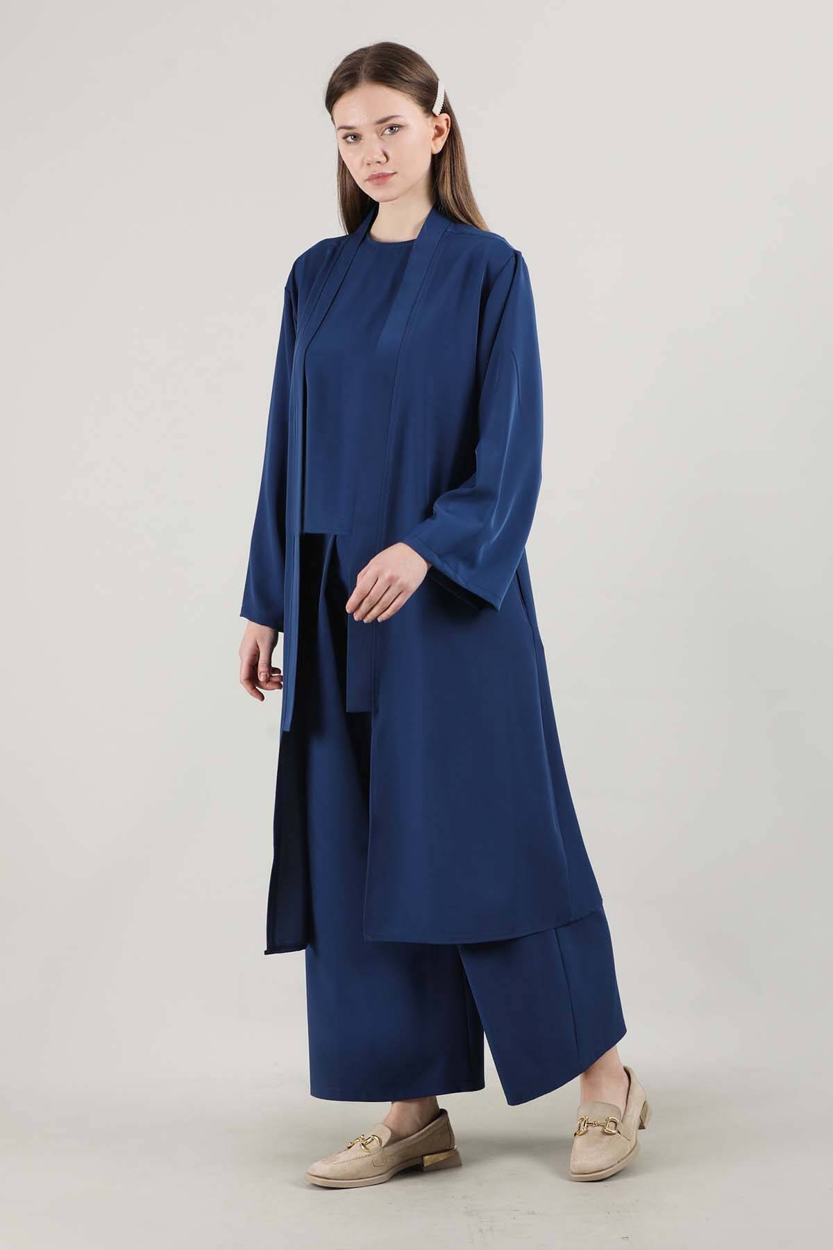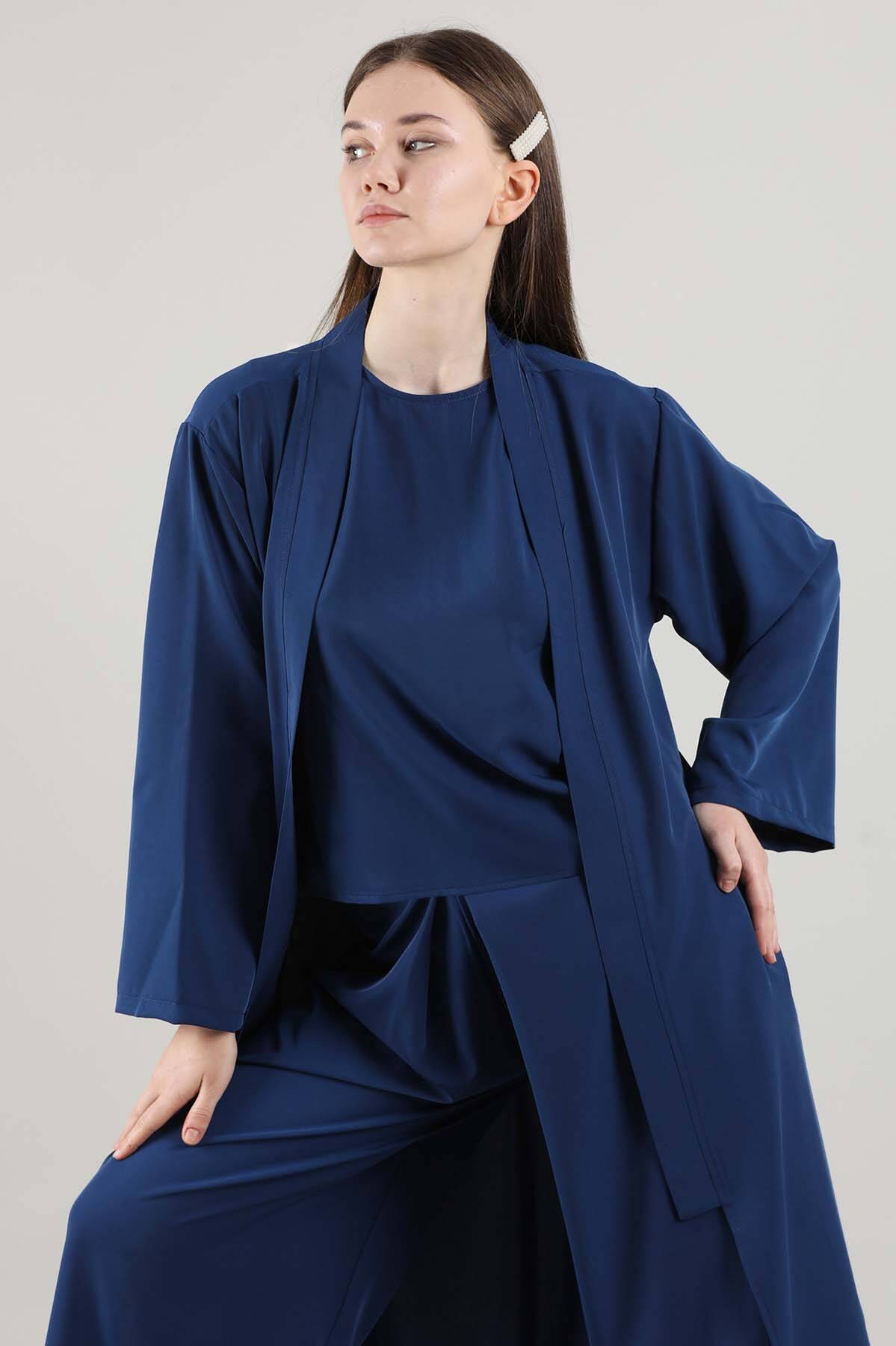 Aisha sıfır kol bluz, kimono ve pantolon olmak üzere üçlü takımdan oluşmaktadır. Astarlı değildir İç göstermez tesettür giyime oldukça uygundur. Ürün tam kalıptır.