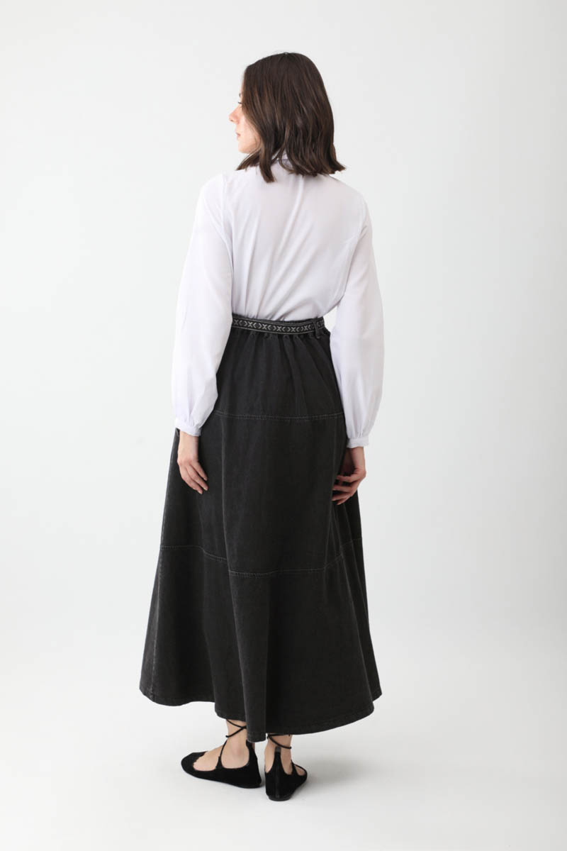 Akel Denim Etek Siyah. Yüksek beldir, parça dikiş detaylıdır, Arka bel lastiklidir, yandan cepli ve gizli fermuarlıdır, kuşağı etnik desenlidir, astarsızdır. Günlük kullanım ve özel günlerinizde tercih edebilirsiniz.