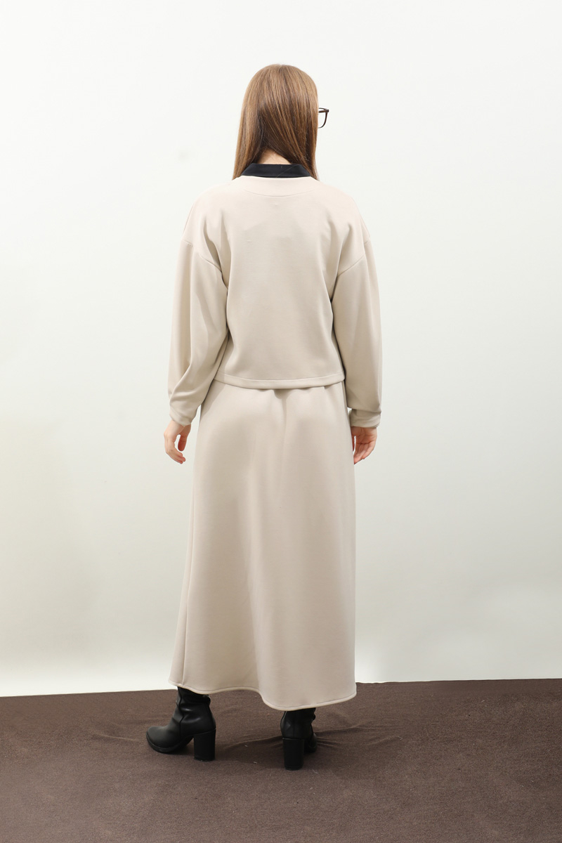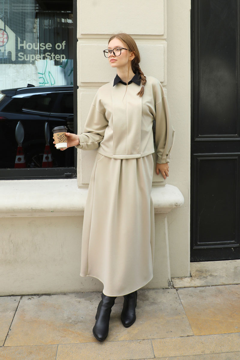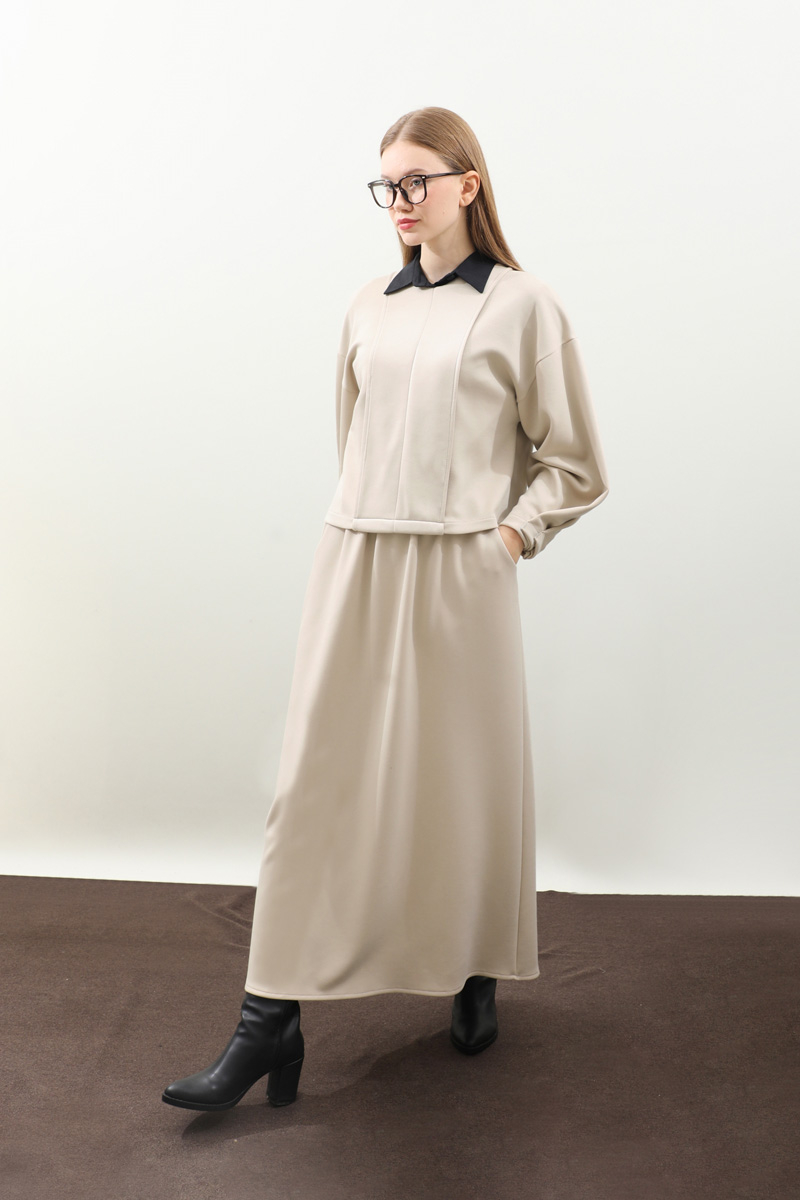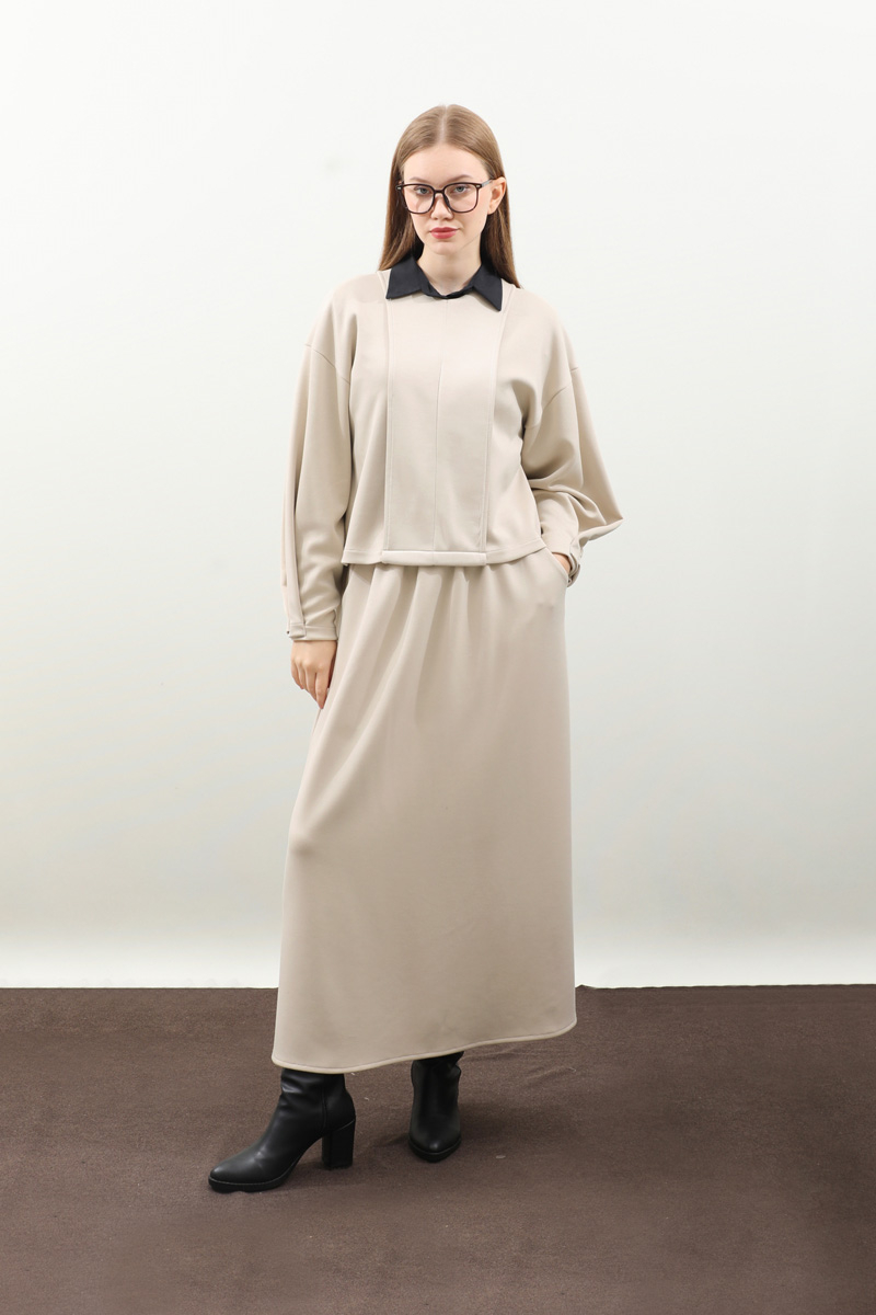 Aller Etek Takım Taş. V yakadır, önden aller parça detaylıdır, düşük omuzludur, Düşük omuzludur. Balon kol olup bilekten pile detaylıdır. Etek belden lastiklidir. ceplidir, astarsızdır. İç göstermez.Günlük kullanım ve özel günlerinizde tercih edebilirsiniz.