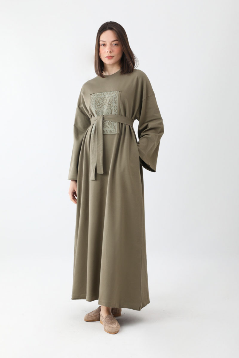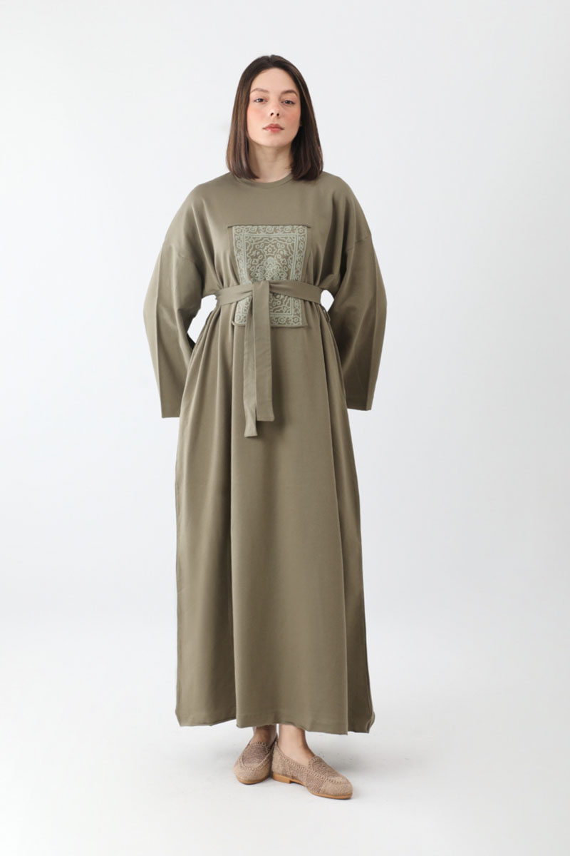 Anadolu Desen Baskılı Sweat Elbise Haki. Bisiklet yakadır, düşük omuzludur, önden parça detaylı olup anadolu desenlidir, yandan ceplidir, astarsızdır, kuşaklıdır, Günlük kullanım ve özel günlerinizde tercih edebilirsiniz.