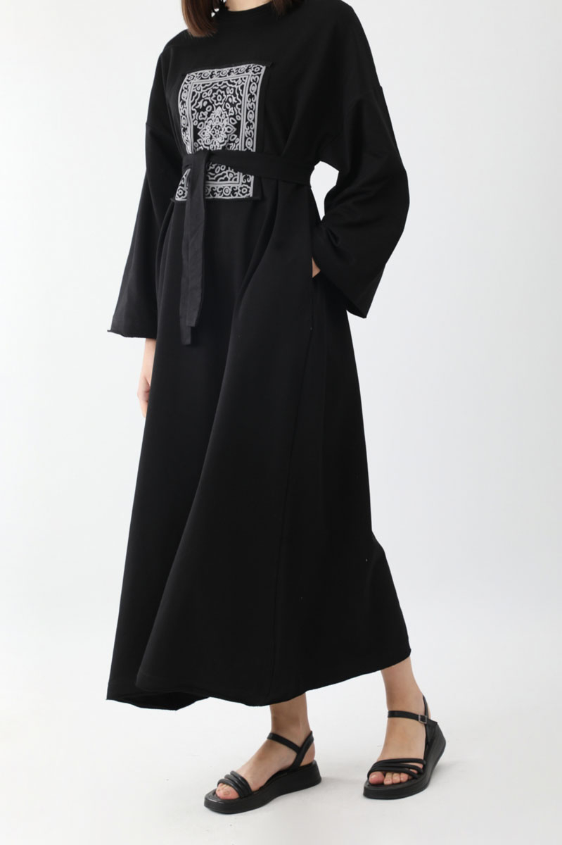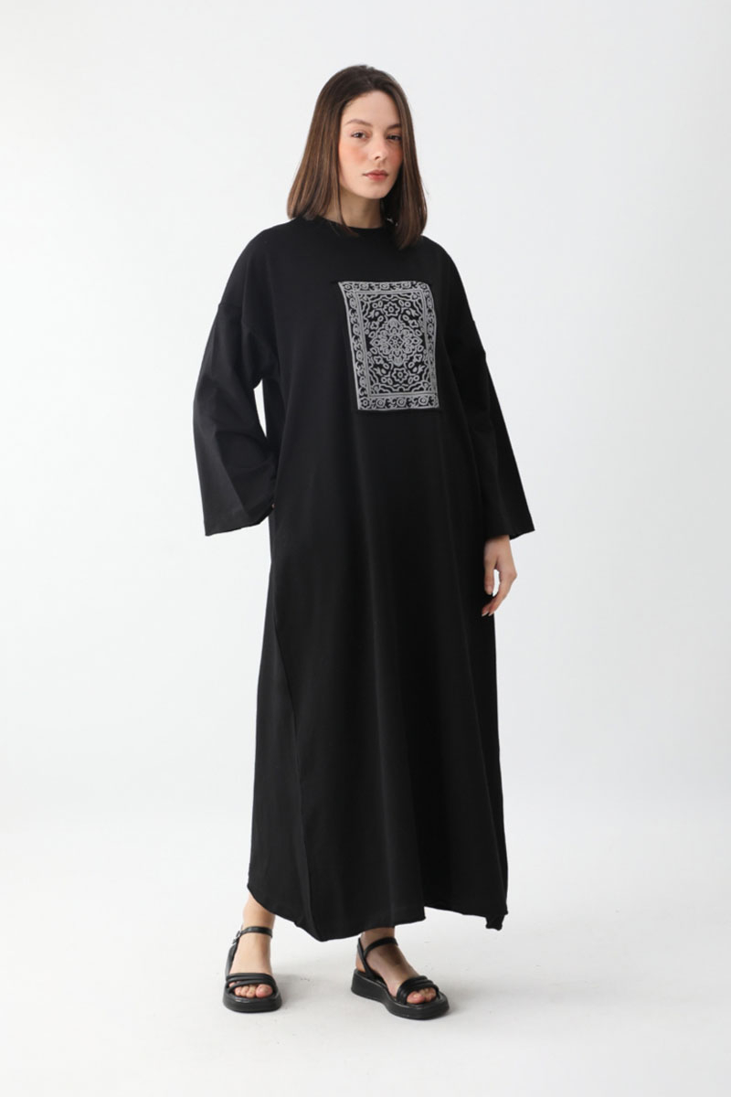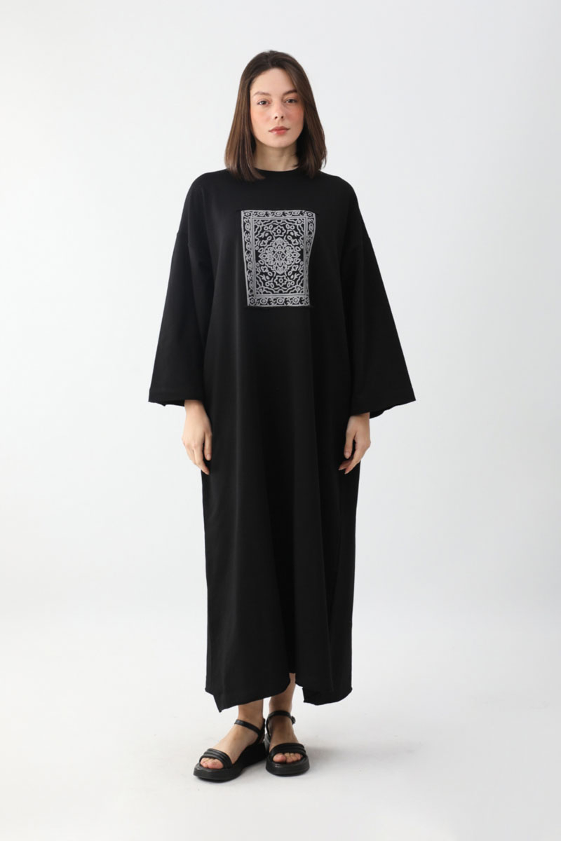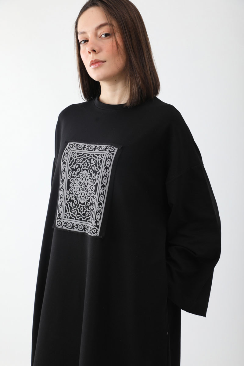 Anadolu Desen Baskılı Sweat Elbise Siyah