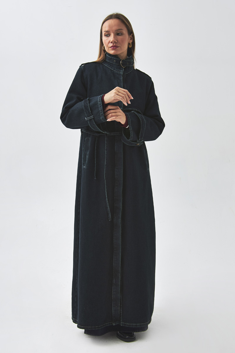 Apolet Detaylı Denim Trençkot Koyu Mavi, zamansız tasarımıyla günlük stilinize modern bir hava katıyor. Denim kumaşın güçlü dokusu ve trençkot formunun klasik çizgileri, şehir yaşamında hem şıklık hem de konfor sunar. Yüksek yaka tasarımı, apolet detayları ve beldeki kuşak kemeri sayesinde farklı kullanım alternatifleri sunarak gardırobunuzun favori parçası olmaya adaydır.