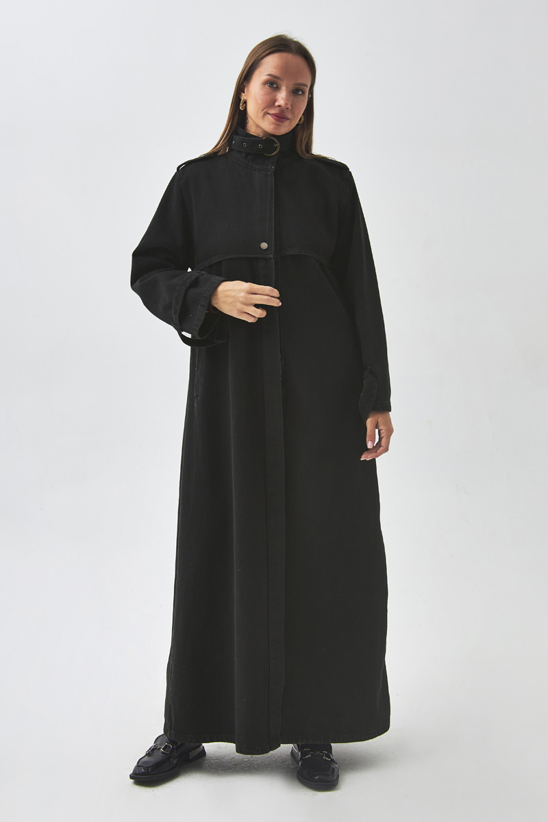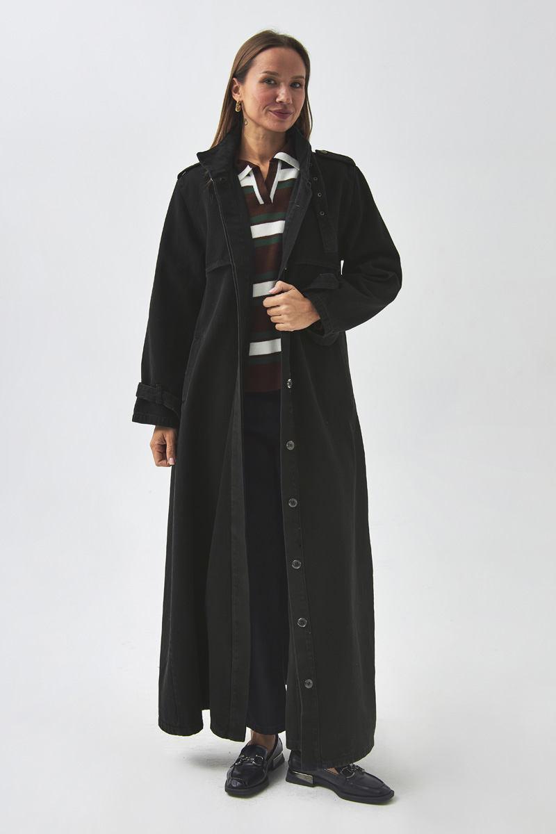 With its timeless design, this denim trenchcoat brings a modern touch to your everyday style. The durable denim fabric combined with the classic trench silhouette offers both elegance and comfort in urban settings. Featuring a high collar, epaulette details, and a waist belt, it provides versatile styling options — making it a strong contender for a staple piece in your wardrobe.