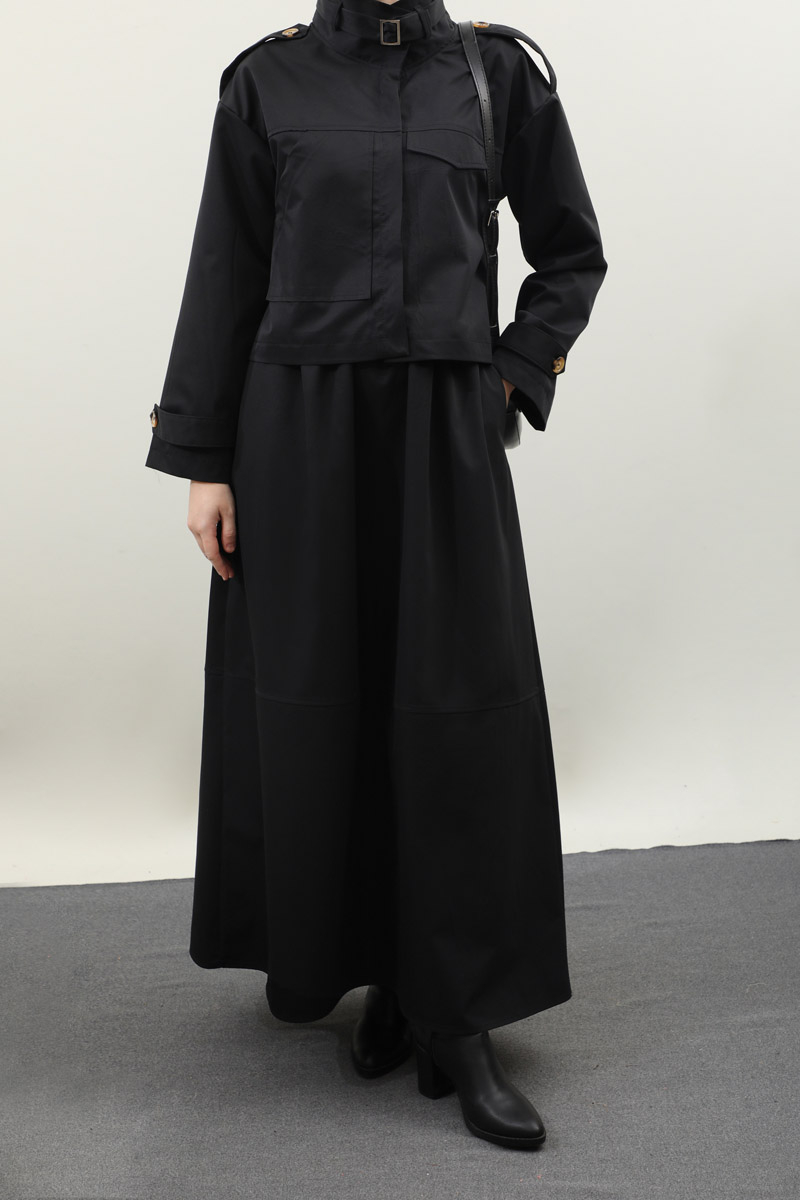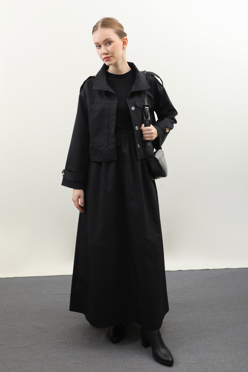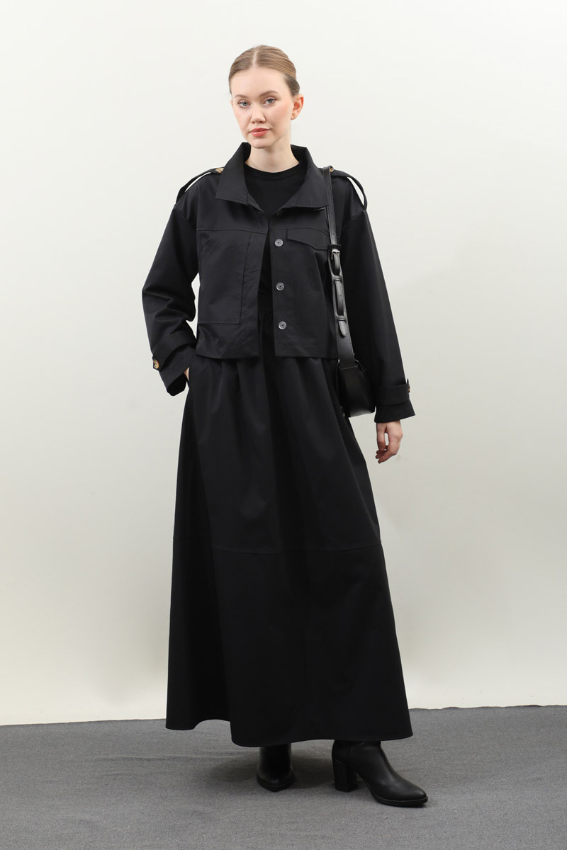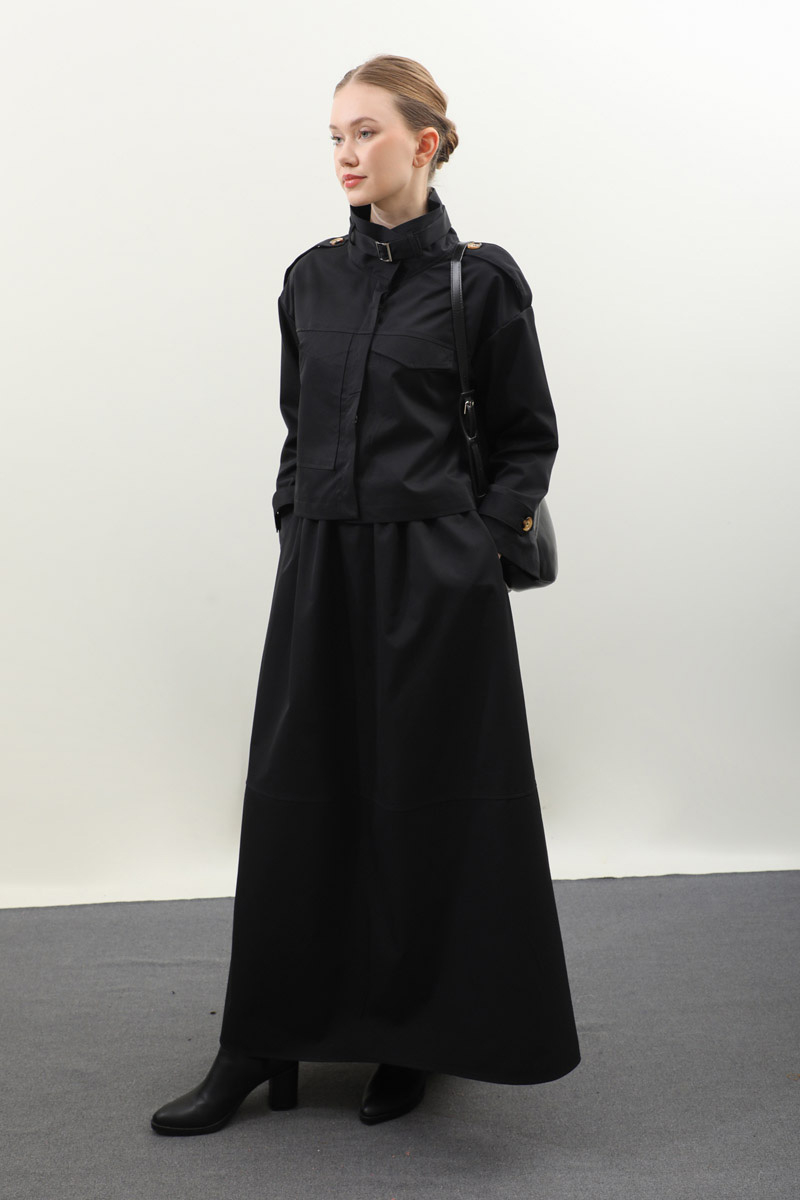 Apolet Detaylı Etek Takım Siyah. Yakadan kemer ve toka detaylıdır, omuzdan apolet detaylıdır, düşük kolludur, Önden düğmelidir, Tasarım cep detaylıdır, Bilekten kemer detaylıdır, Etek belden lastikli olup yandan ceplidir astarlıdır.. Günlük kullanım ve özel günlerinizde tercih edebilirsiniz.
