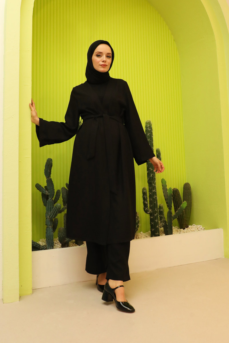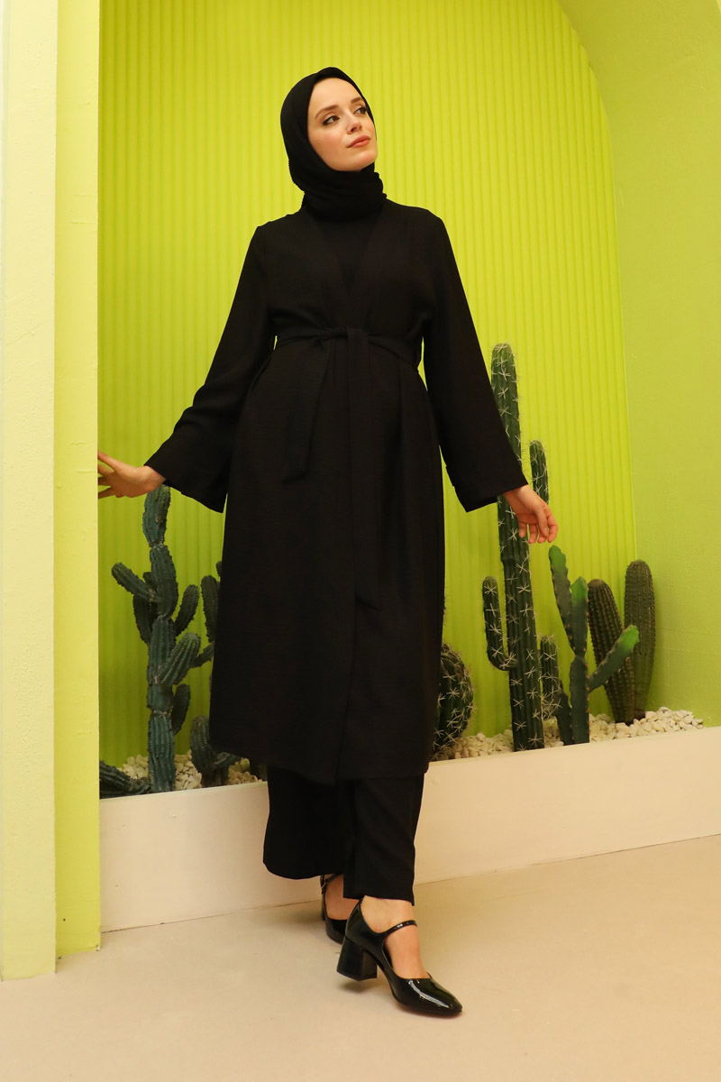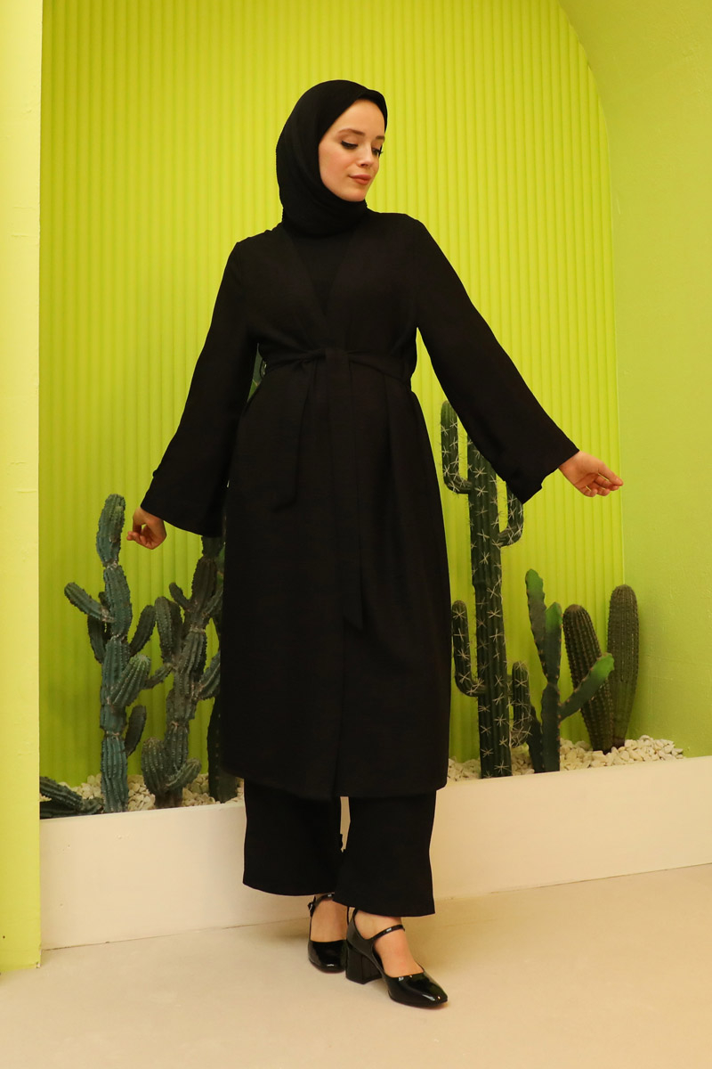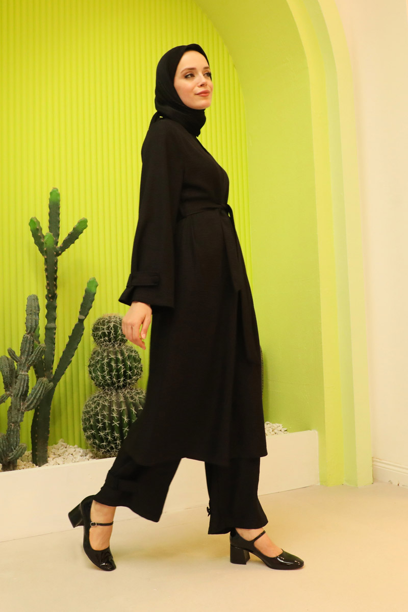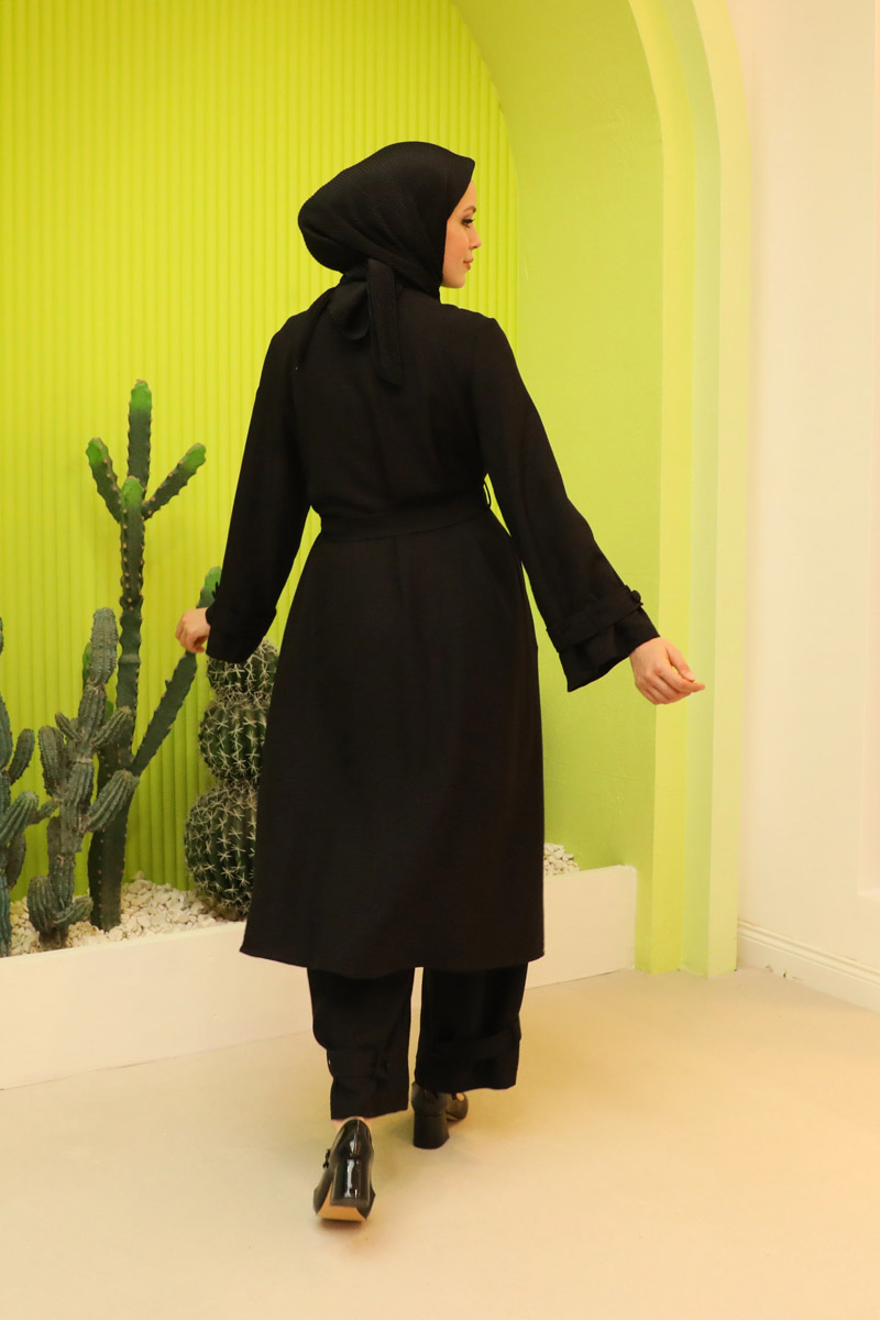 Apolet Detaylı Kuşaklı Takım Siyah. Kolu arkası ve paça arkası apolet detaylıdır. Yan ceplidir. Pantolon beli lastiklidir. Kuşaklıdır. Özel günlerinizde tercih edebilirsiniz.