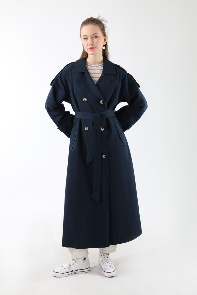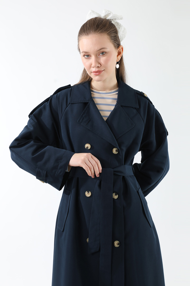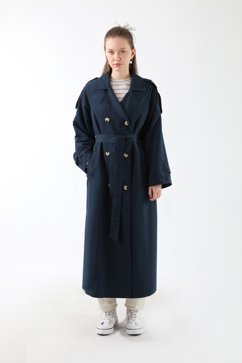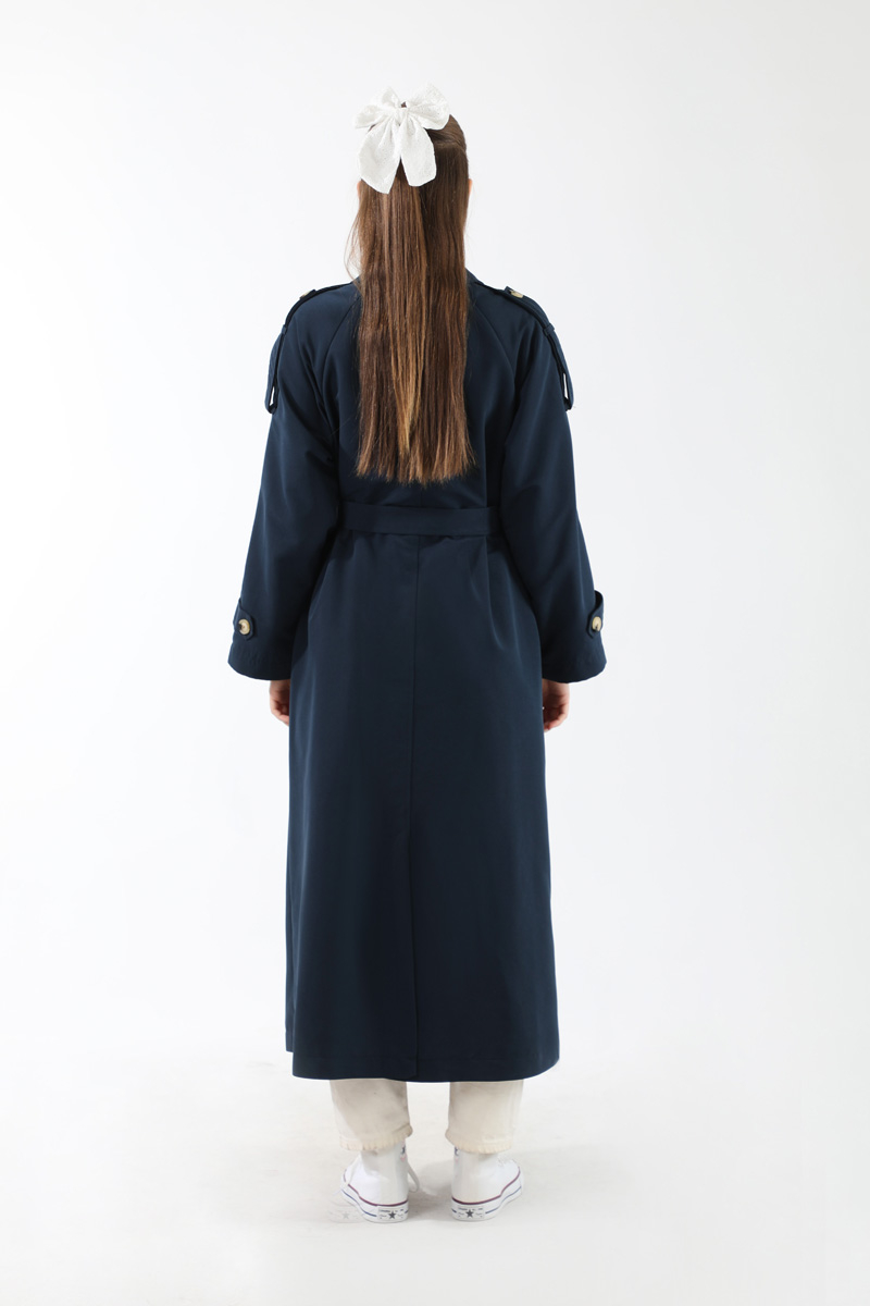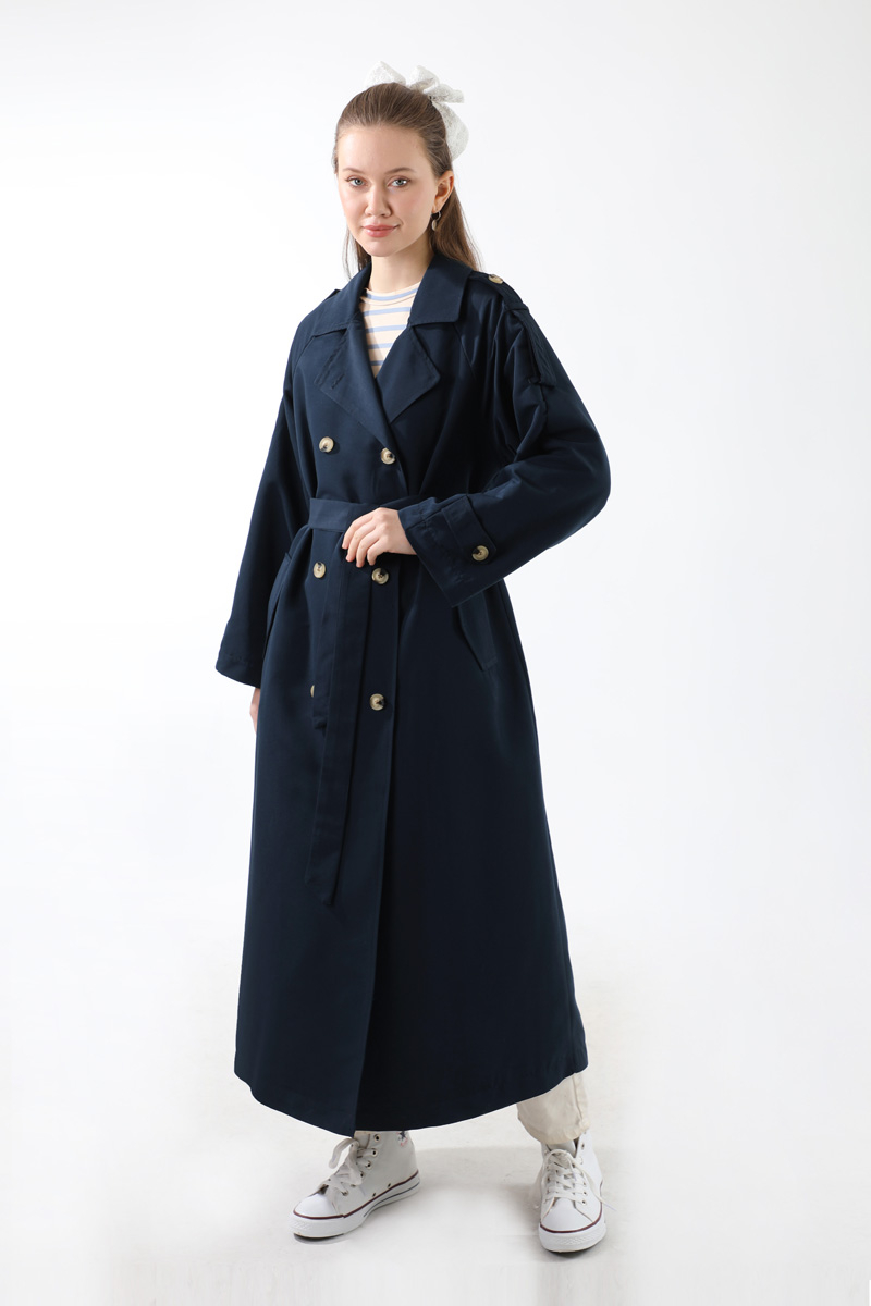 Apolet Detaylı Uzun Trenç Lacivert, klasik trençkot görünümünü modern detaylarla buluşturuyor. Omuz kısmındaki apolet tasarımı ve kruvaze düğme kapamasıyla güçlü bir siluet sunarken, belden bağlamalı kemeri formu kişiselleştirmenizi sağlar. Tok dokulu kumaşı sayesinde duruşunu korur ve uzun boyu ile zarif bir görünüm kazandırır. Mevsim geçişlerinde konfor ve şıklığı bir arada arayanlar için ideal bir dış giyim parçasıdır.