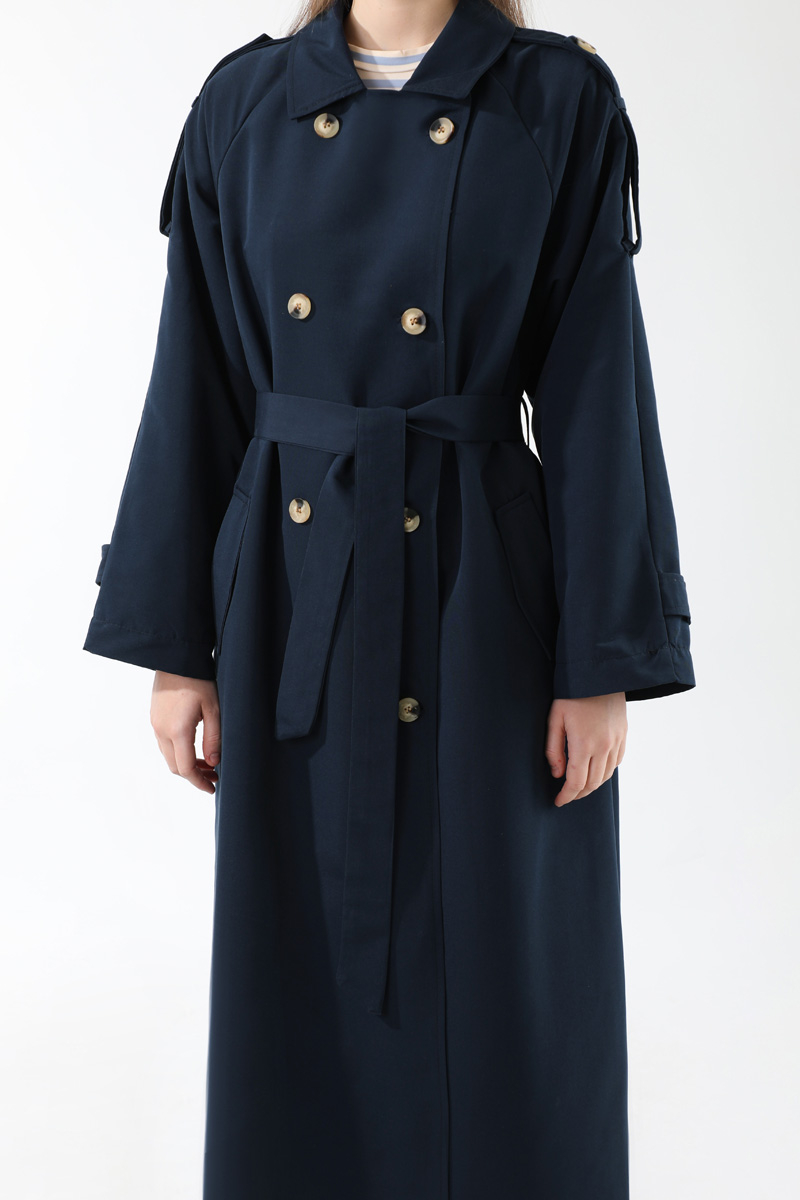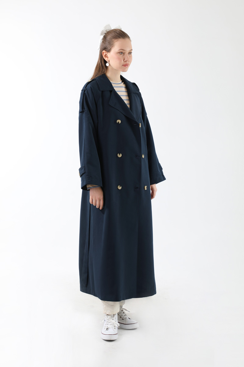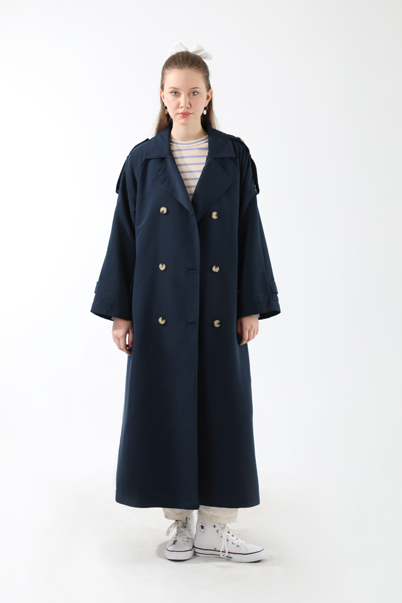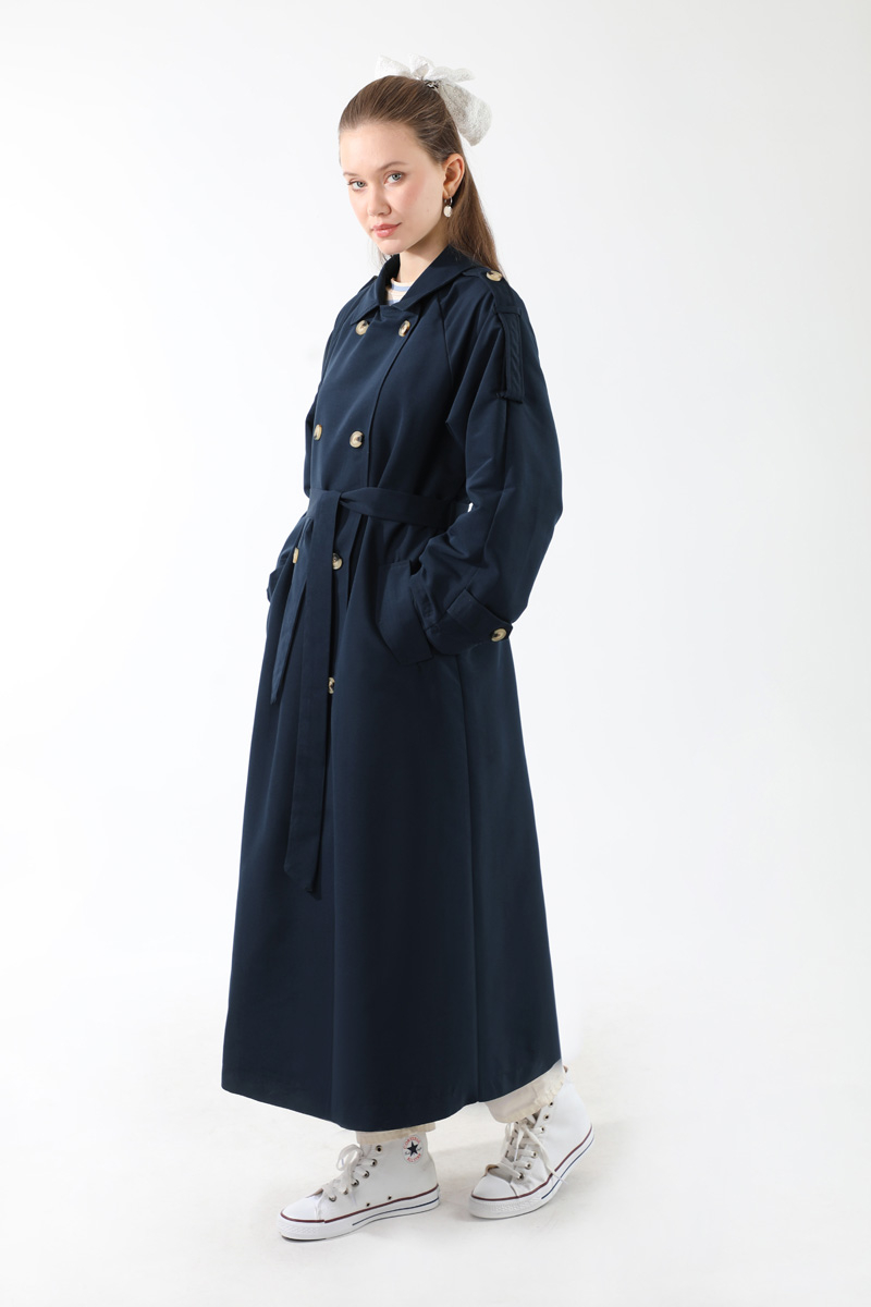 Apolet Detaylı Uzun Trenç Lacivert, klasik trençkot görünümünü modern detaylarla buluşturuyor. Omuz kısmındaki apolet tasarımı ve kruvaze düğme kapamasıyla güçlü bir siluet sunarken, belden bağlamalı kemeri formu kişiselleştirmenizi sağlar. Tok dokulu kumaşı sayesinde duruşunu korur ve uzun boyu ile zarif bir görünüm kazandırır. Mevsim geçişlerinde konfor ve şıklığı bir arada arayanlar için ideal bir dış giyim parçasıdır.