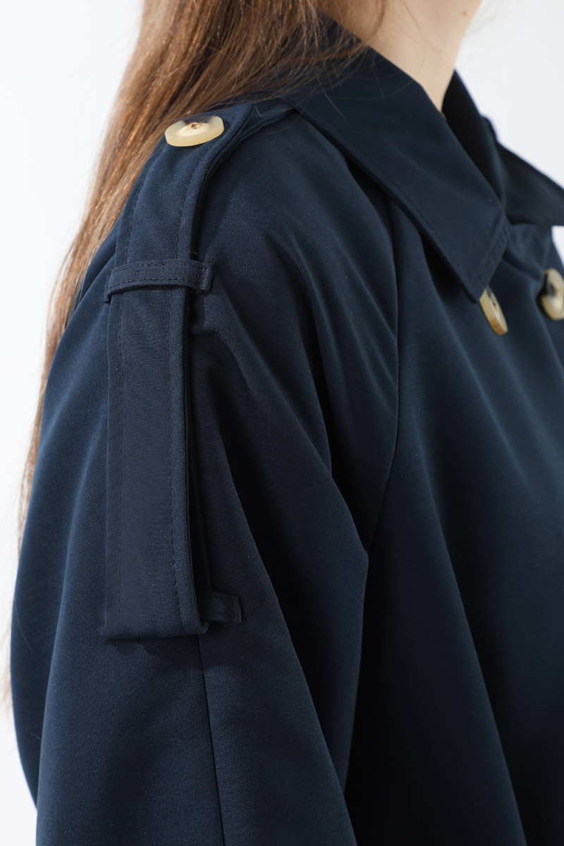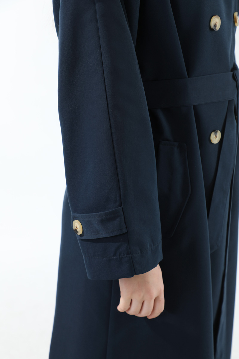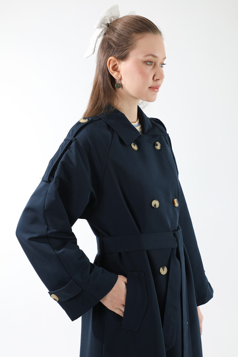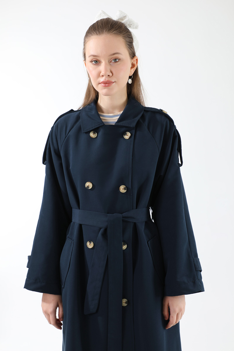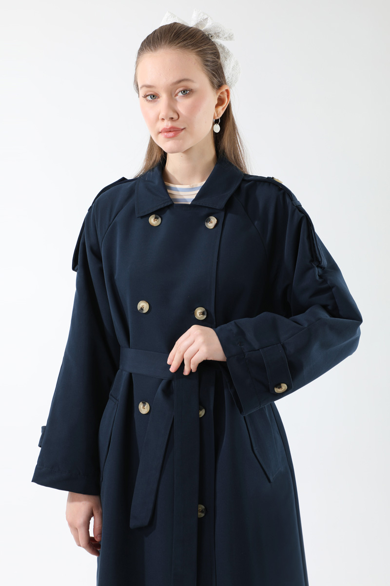 Apolet Detaylı Uzun Trenç Lacivert, klasik trençkot görünümünü modern detaylarla buluşturuyor. Omuz kısmındaki apolet tasarımı ve kruvaze düğme kapamasıyla güçlü bir siluet sunarken, belden bağlamalı kemeri formu kişiselleştirmenizi sağlar. Tok dokulu kumaşı sayesinde duruşunu korur ve uzun boyu ile zarif bir görünüm kazandırır. Mevsim geçişlerinde konfor ve şıklığı bir arada arayanlar için ideal bir dış giyim parçasıdır.