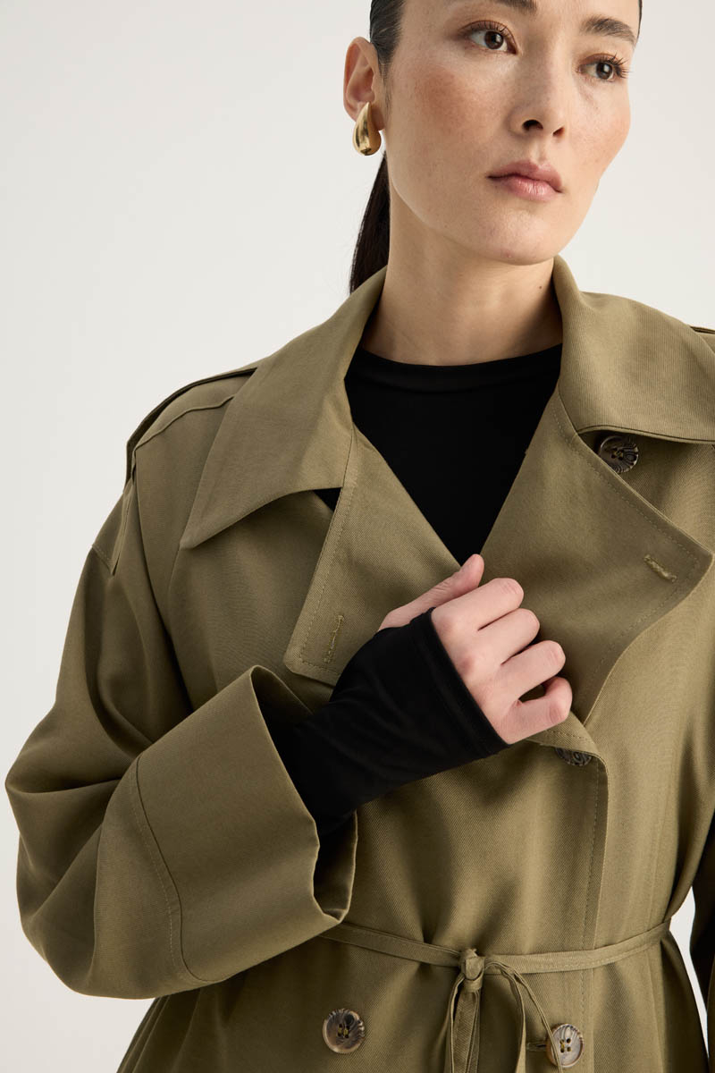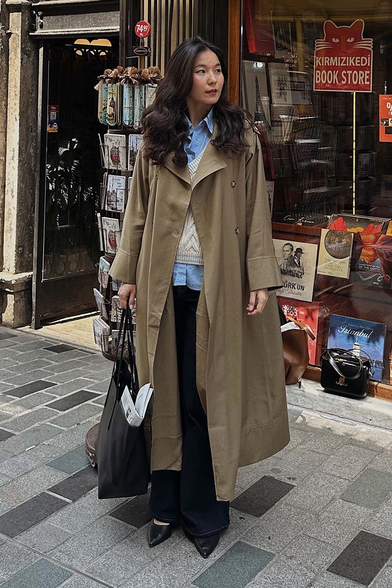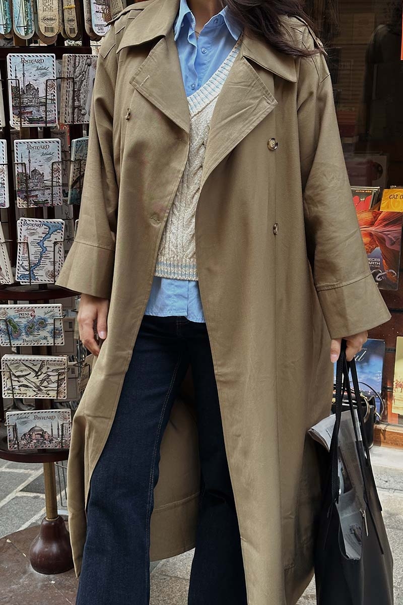 Apoletli Kruvaze Trençkot Haki. Kruvaze yakadır, önden düğmelidir, omuzdan apolet detaylıdır, düşük omuzludur, duble kolludur, yandan ceplidir, beli biye bağlamalıdır, etek ucu yanları parça dikiş detaylıdır, astarsızdır. bol kalıptır. Günlük kullanım ve özel günlerinizde tercih edebilirsiniz.
