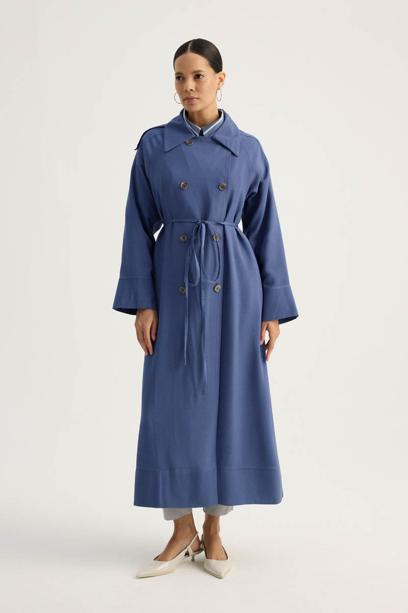 Apoletli Kruvaze Trençkot İndigo. Kruvaze yakadır, önden düğmelidir, omuzdan apolet detaylıdır, düşük omuzludur, duble kolludur, yandan ceplidir, beli biye bağlamalıdır, etek ucu yanları parça dikiş detaylıdır, astarsızdır. bol kalıptır. Günlük kullanım ve özel günlerinizde tercih edebilirsiniz.