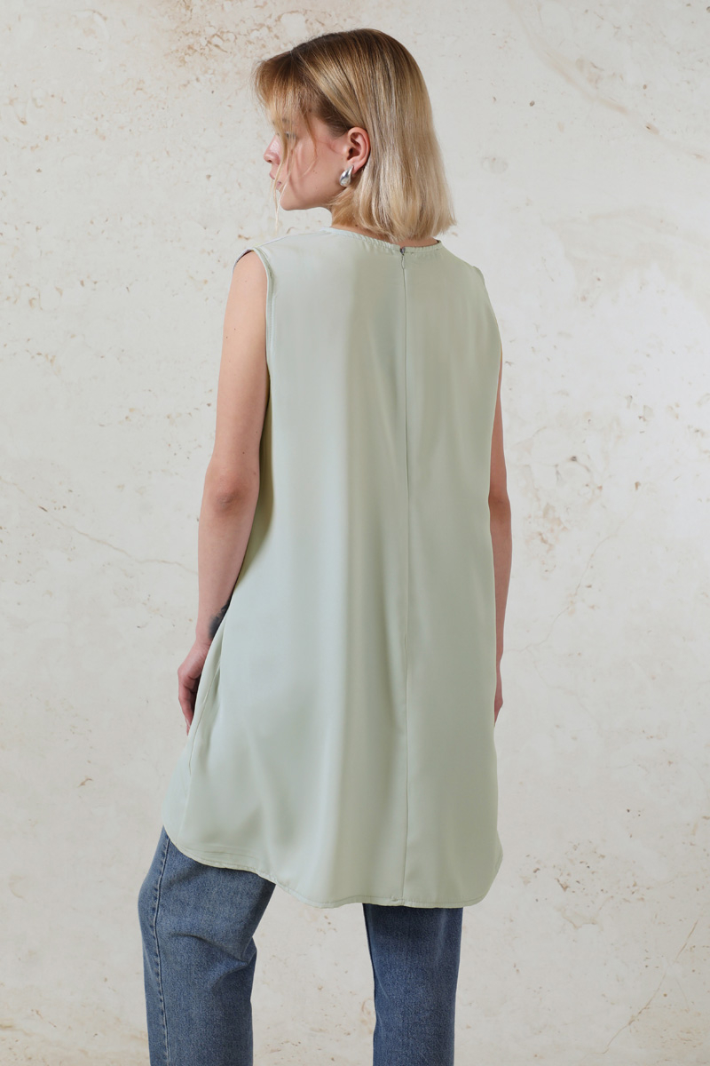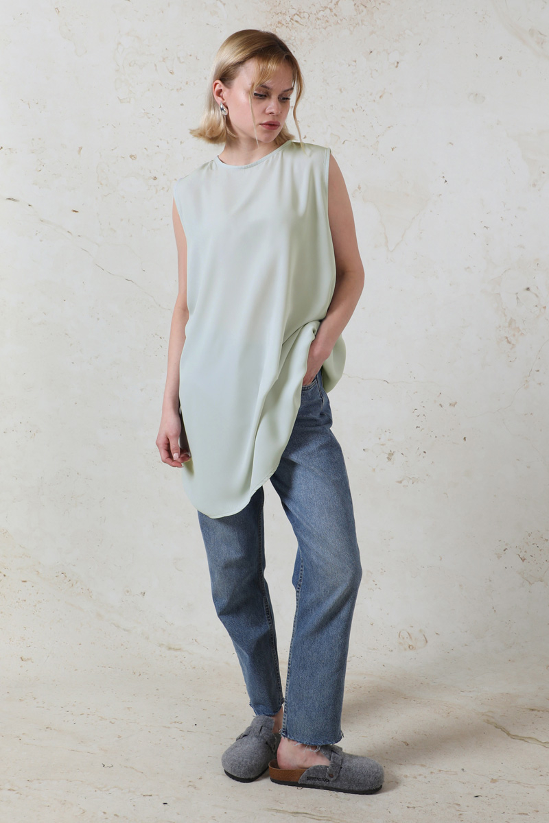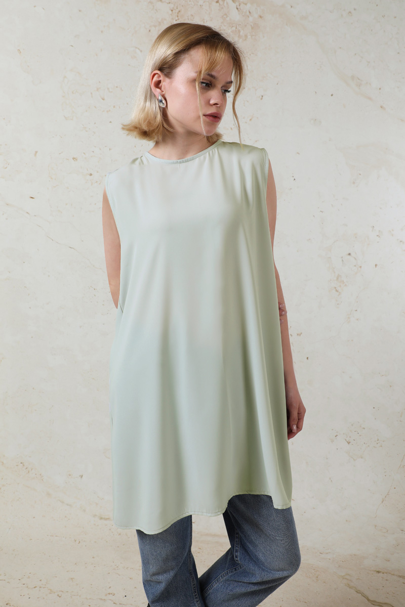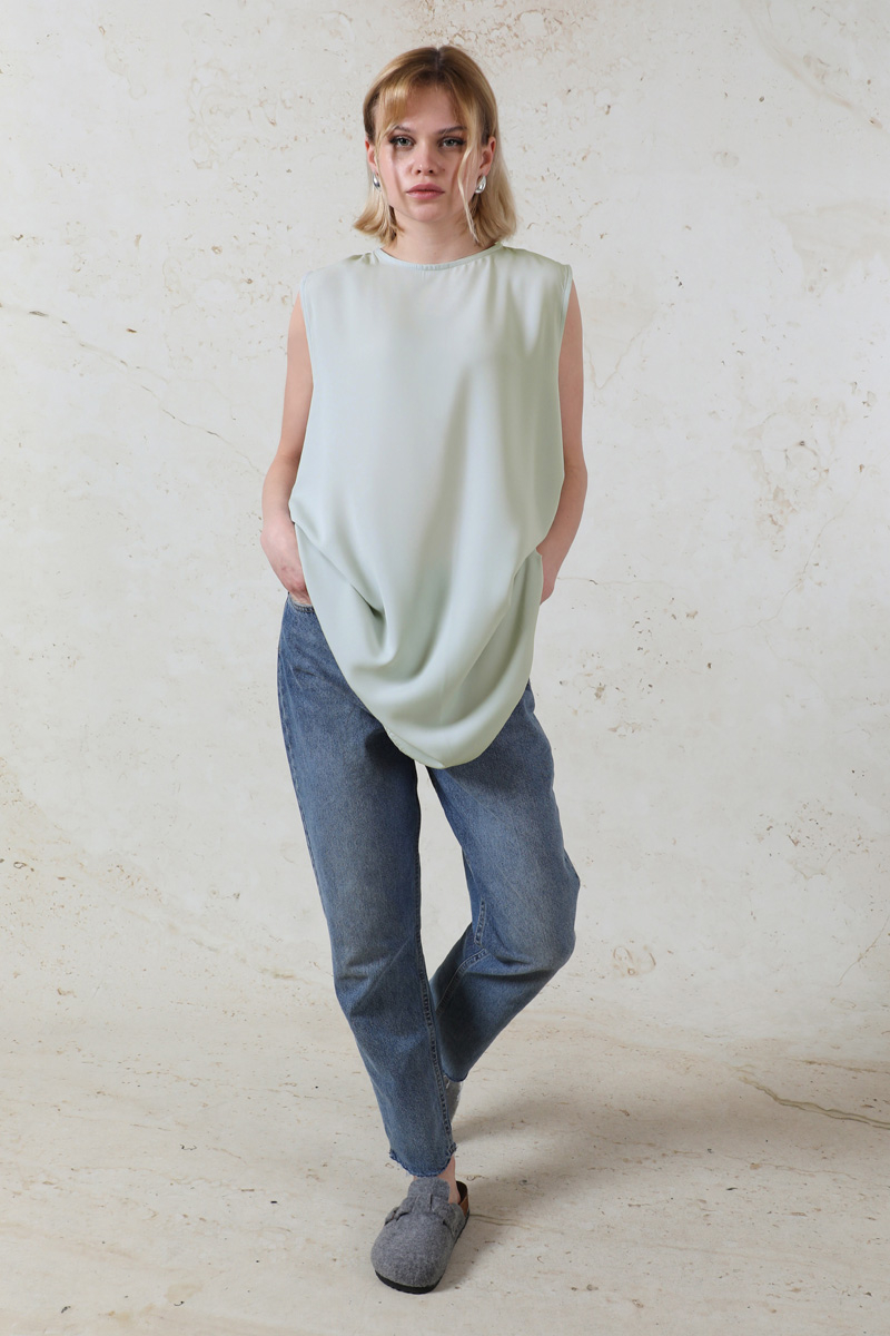 Ara Boy İçlik Gri. Bisiklet yaka, sıfır kol. Kumaşı medine ipeği ince, yazlık, dökümlü kumaştır. Salaş bir duruşu vardır.