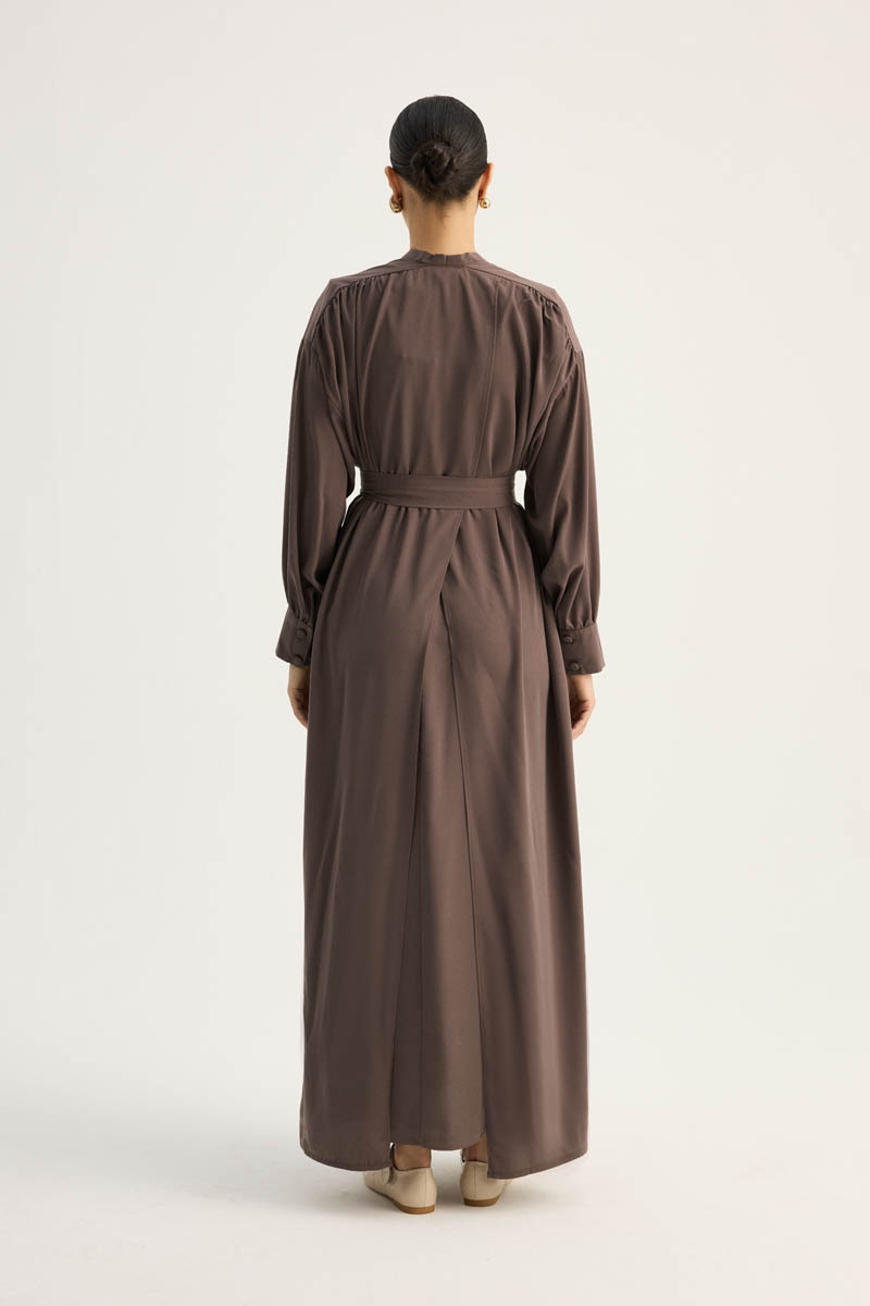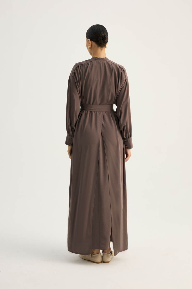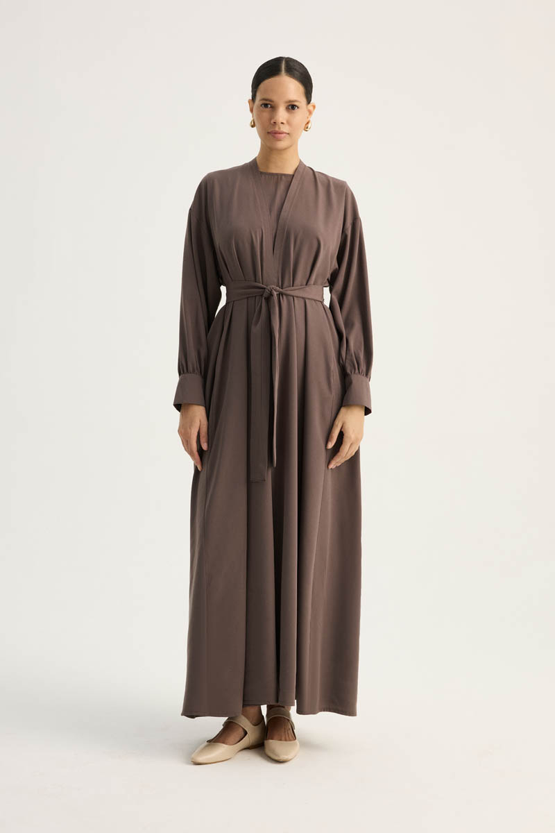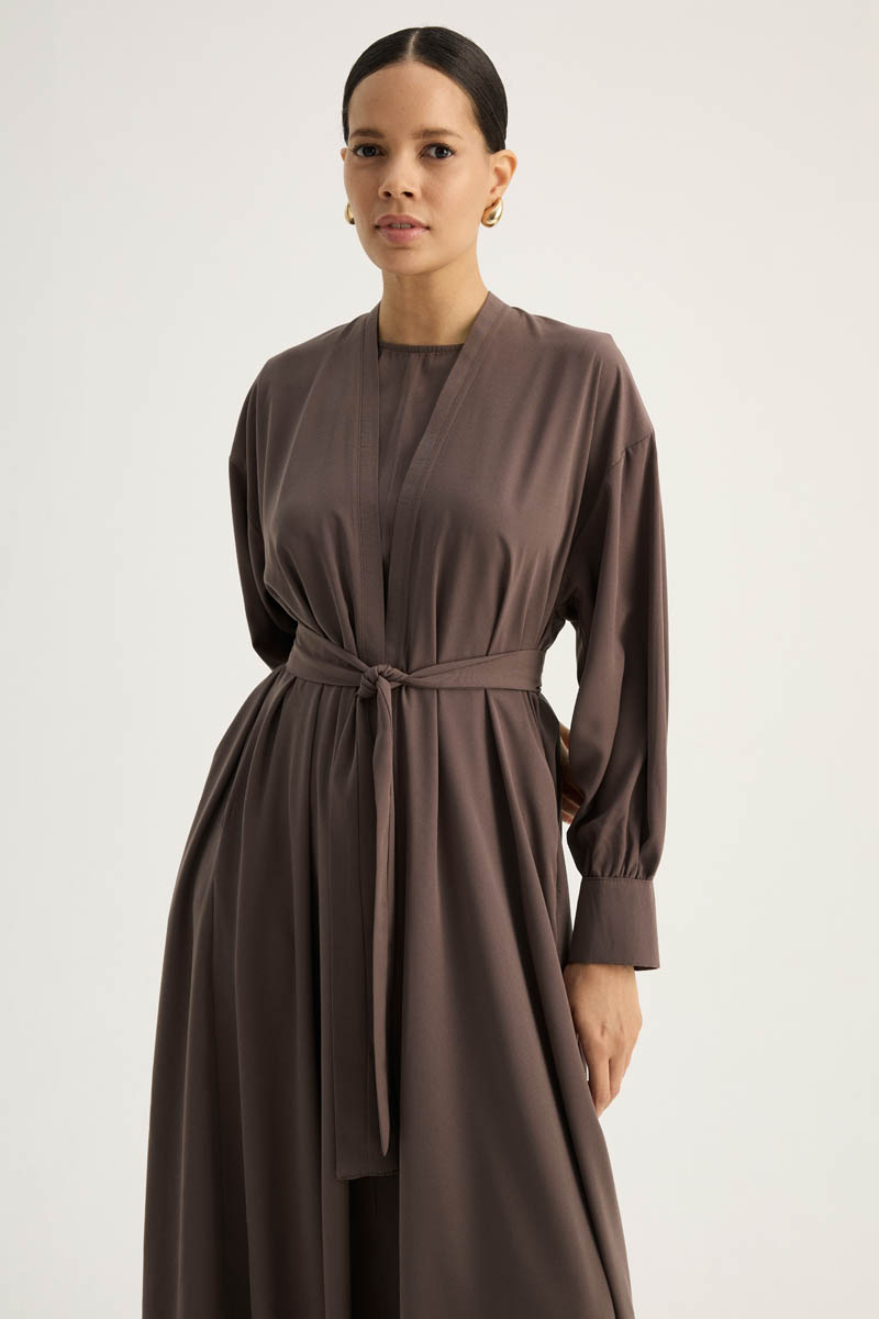 Arka Parçalı Abaya Takım Taş. İç elbise bisiklet yakadır, sıfır kolludur, belden büzgülüdür, abaya düşük kolludur, arka omuzu düzgü detaylıdır, arkadan parça detaylıdır, bilekten manşetlidir, yandan ceplidir, kuşaklıdır, astarsızdır, Günlük kullanım ve özel günlerinizde tercih edebilirsiniz.