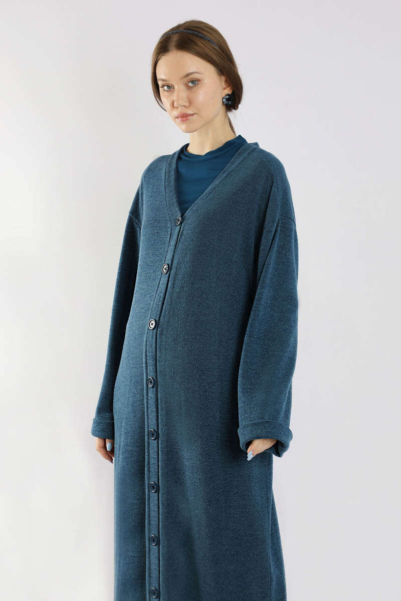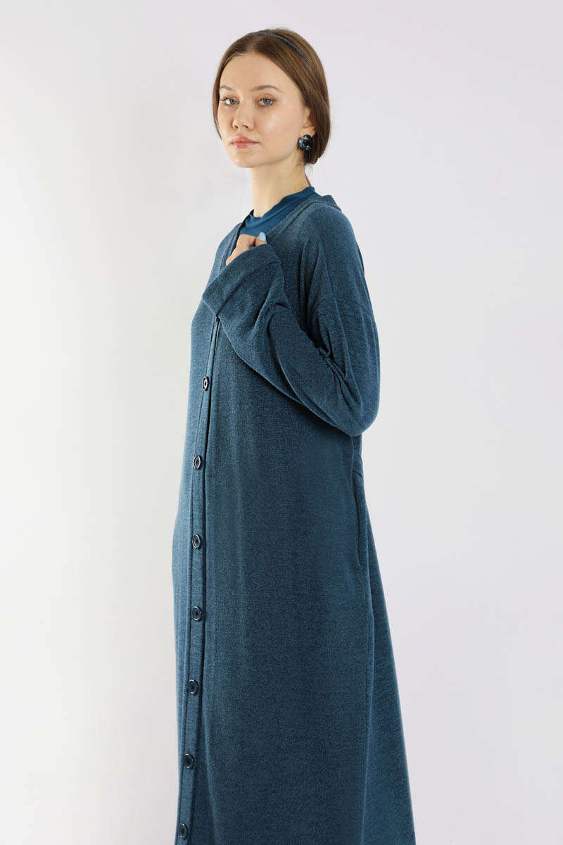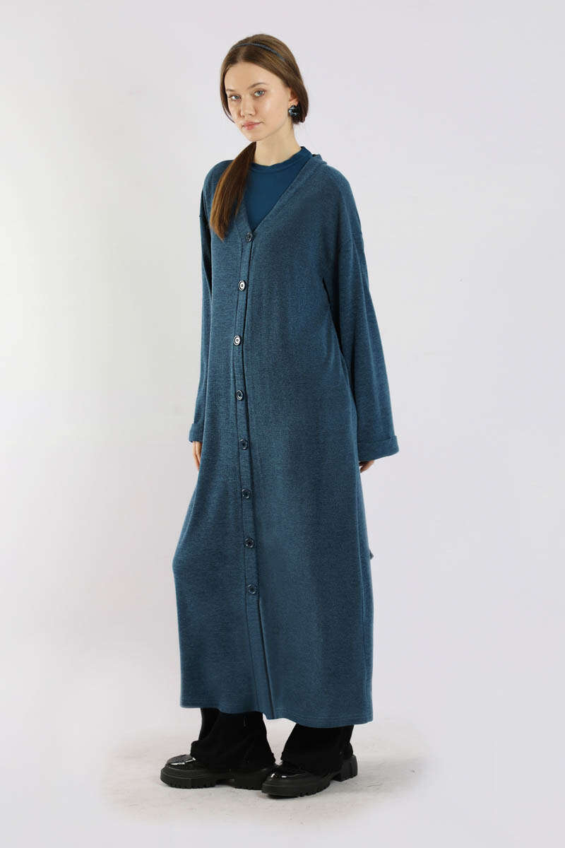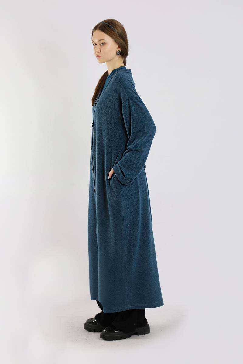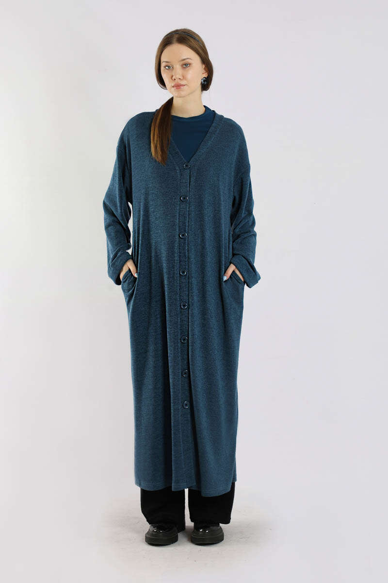 Arkadan Kuşaklı Triko Hırka İndigo. Önden düğmelidir. Yandan ceplidir. Düşük omuzludur. Duble kolludur. Oversize kalıptır. Bedene dikili tokalı kuşak detaylıdır. Günlük kullanım ve özel günlerinizde tercih edebilirsiniz.