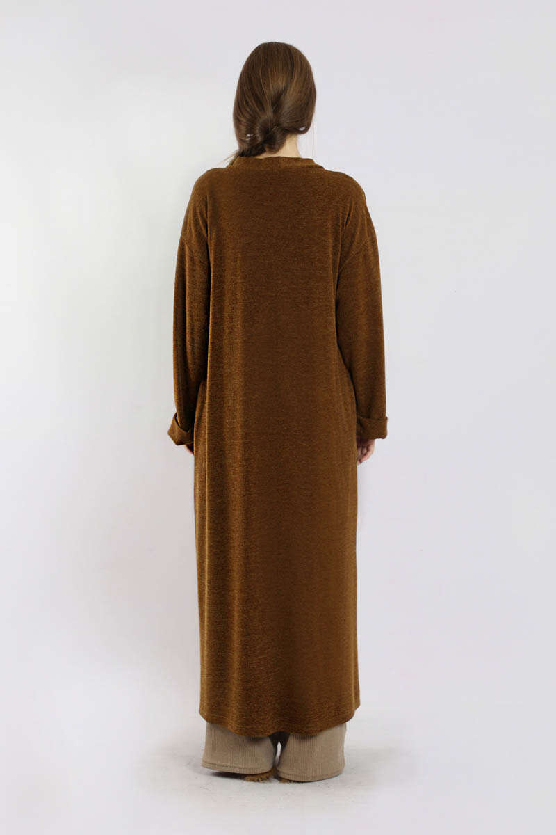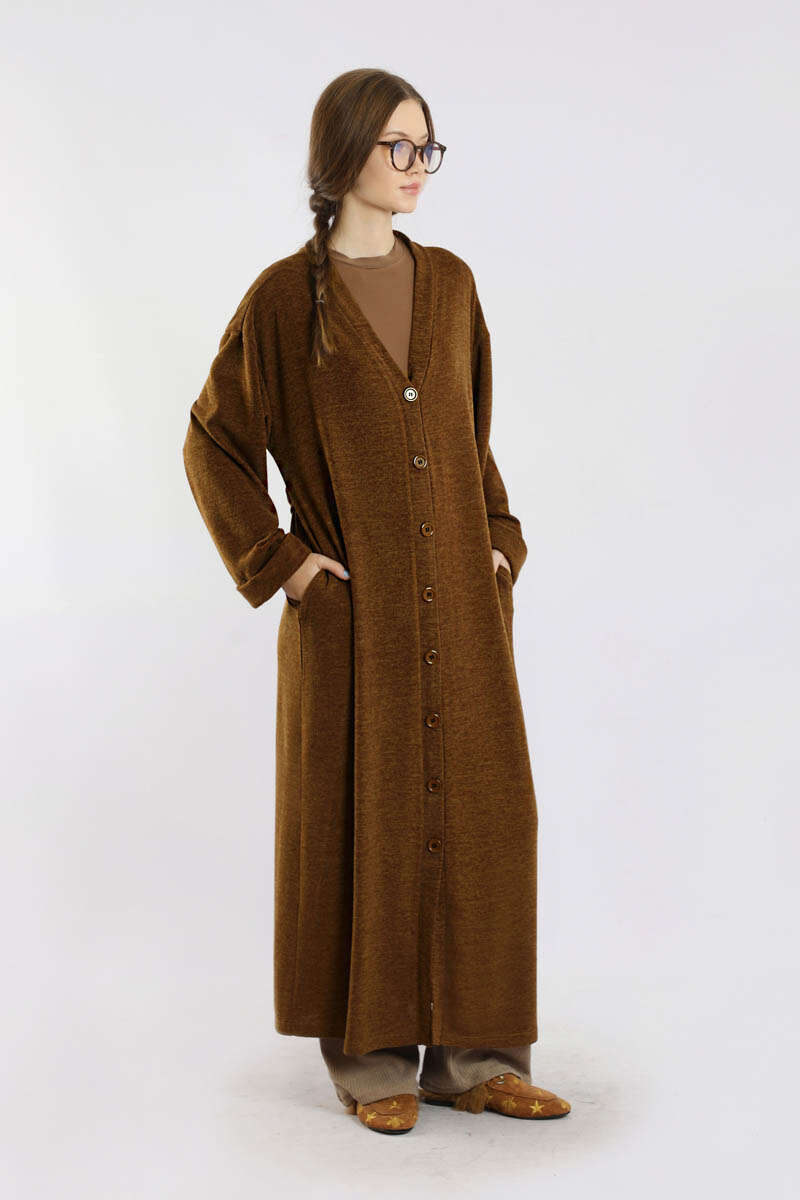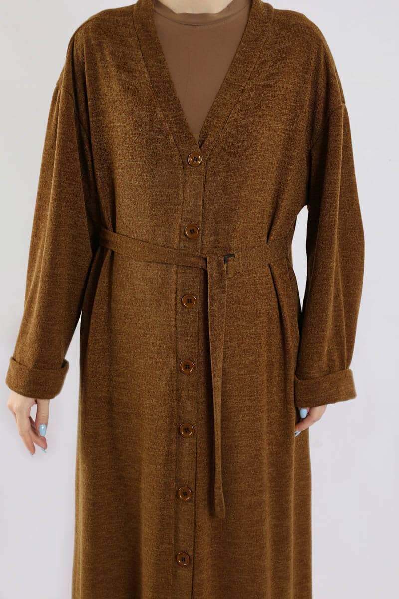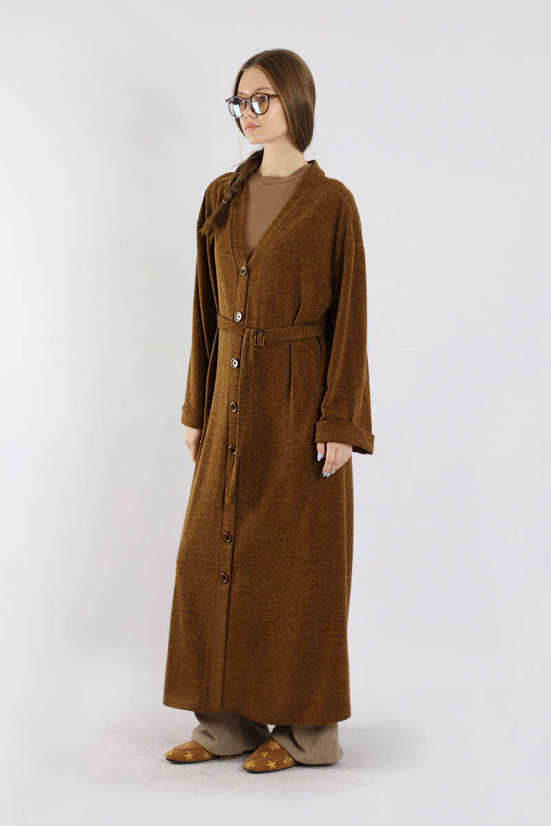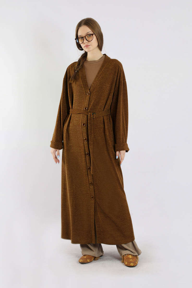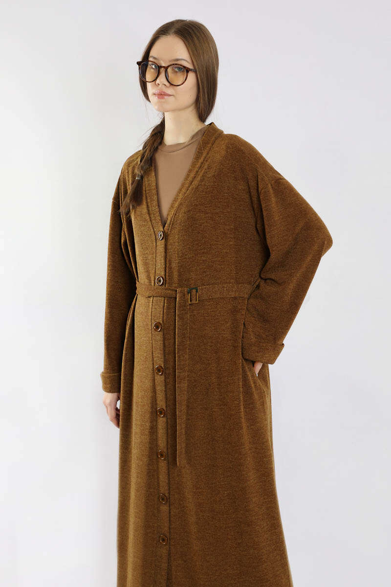 Arkadan Kuşaklı Triko Hırka Taba. Önden düğmelidir. Yandan ceplidir. Düşük omuzludur. Duble kolludur. Oversize kalıptır. Bedene dikili tokalı kuşak detaylıdır. Günlük kullanım ve özel günlerinizde tercih edebilirsiniz.
