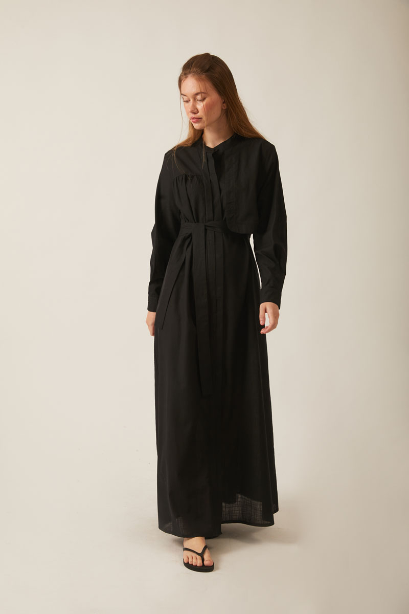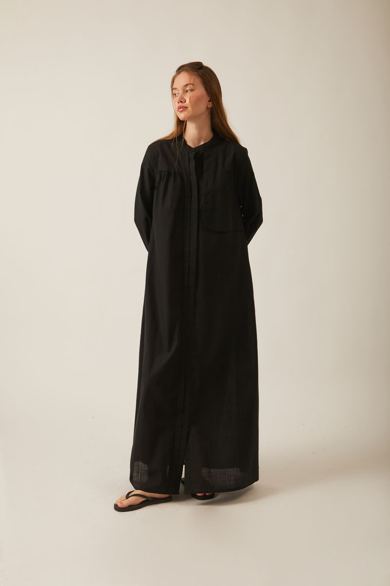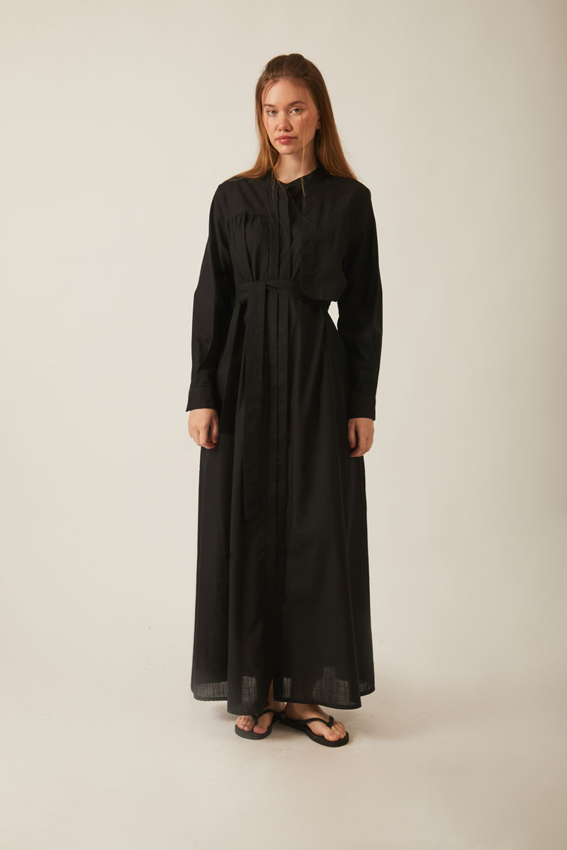 Asimetrik Düğmeli Elbise Siyah, Şıklık ve rahatlığı bir araya getiren bu flamlı keten elbise ile doğal dokuların ferahlığını hissedin. Otantik görünümünü modern bir tasarımla buluşturuyor. Gün boyu konforlu bir kullanım sunar. Vücuda oturmayan rahat kesimi, hareket özgürlüğü sağlarken, belindeki kendi kumaşından kuşağı ile istenilen şekilde bele oturarak zarif bir silüet oluşturur.