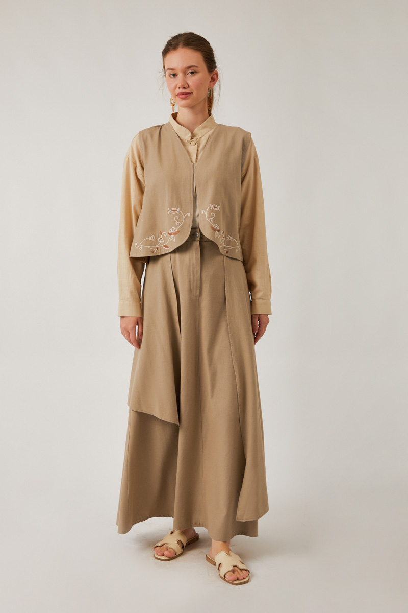 Asimetrik Etekli Yelek Takım Vizon