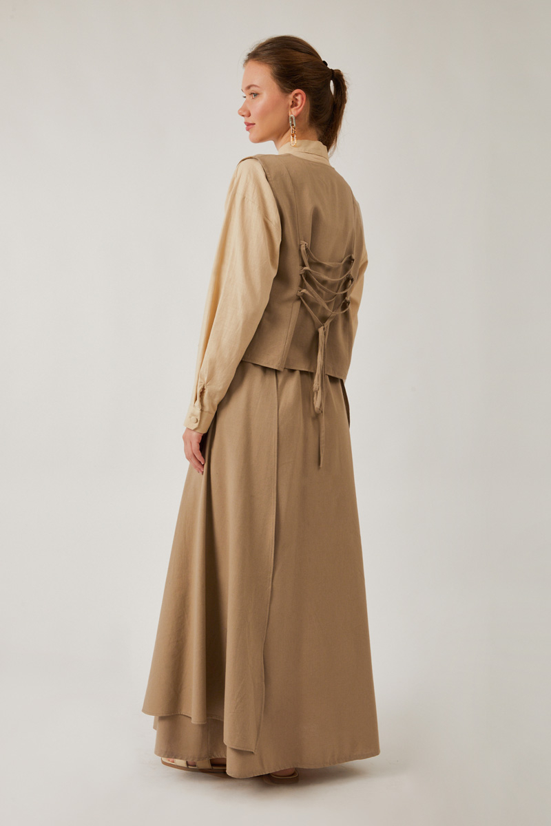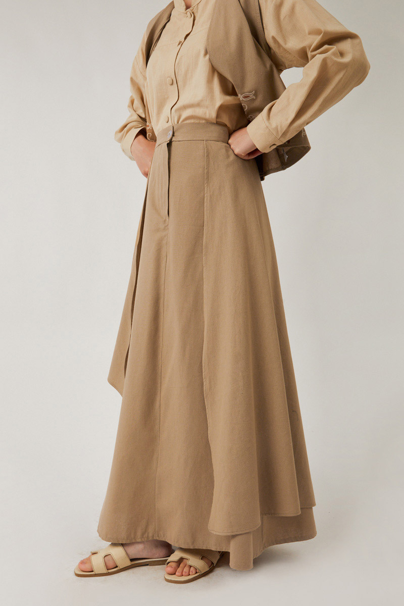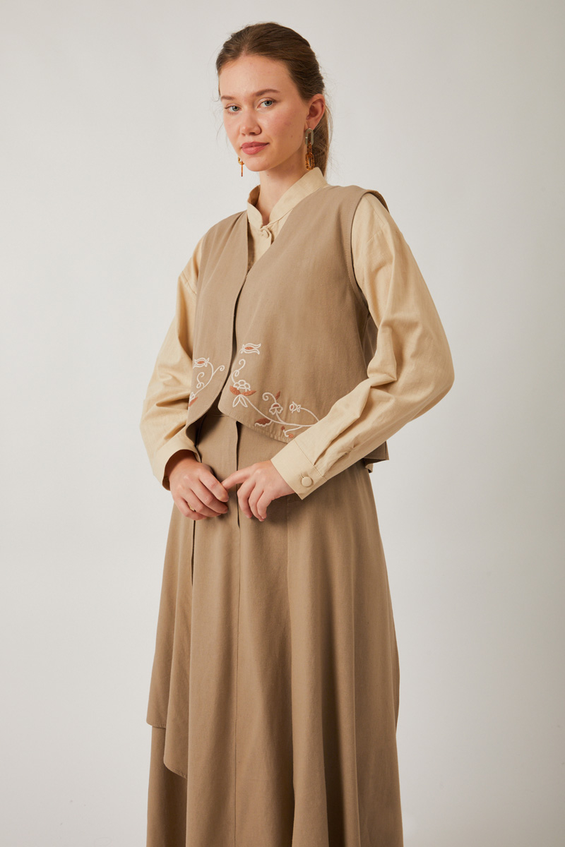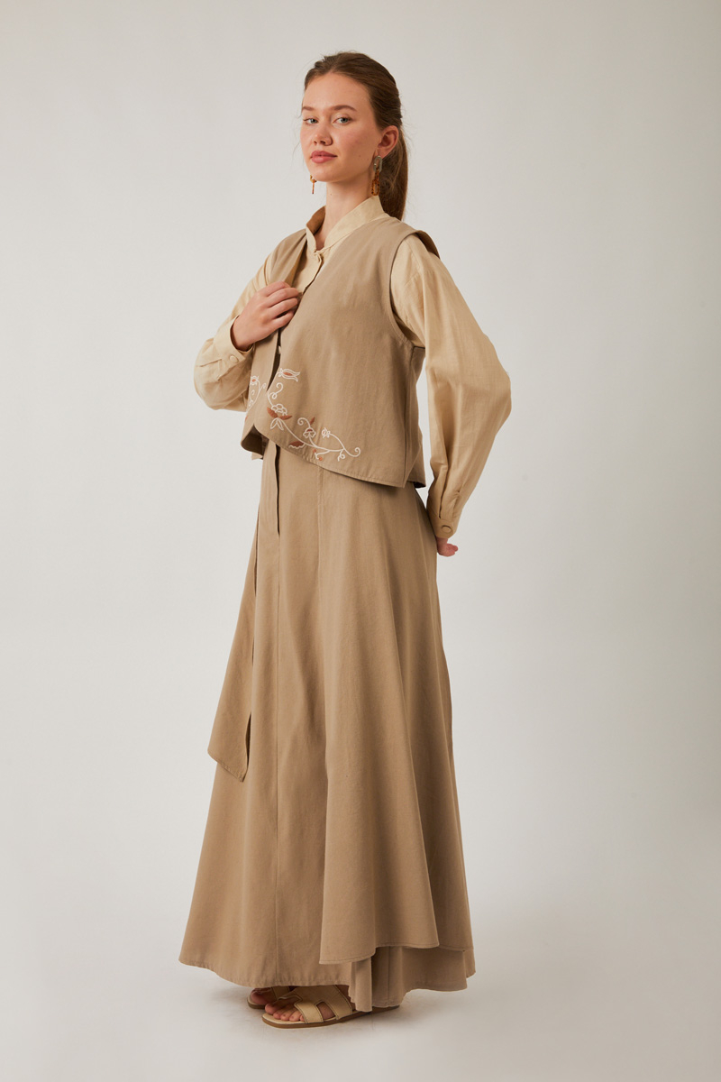 Asimetrik Etekli Yelek Takım Vizon, hafif yapısı sayesinde özellikle bahar ve yaz aylarında hem günlük hem de daha özel davetlerde giyilebilir. Asimetrik etek ve işlemeli yelek, bu kombini sıradanlıktan uzaklaştırıp özgün bir stil yaratıyor.
