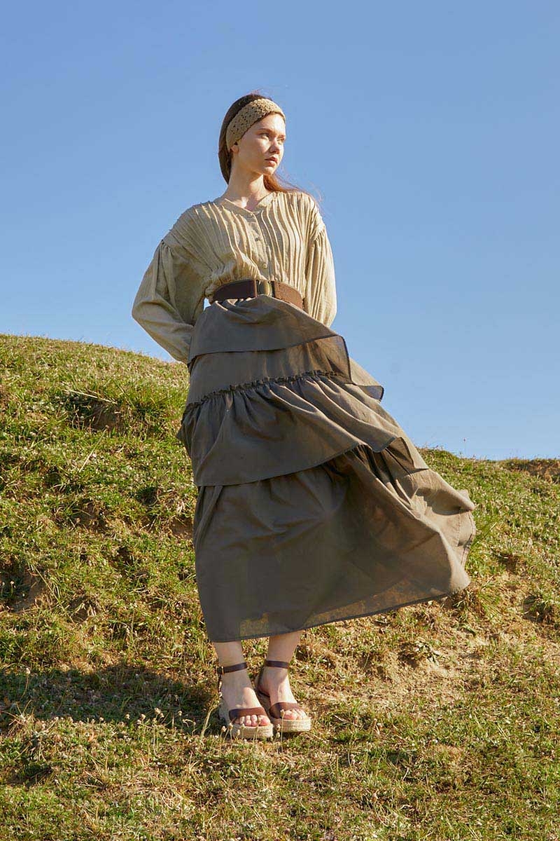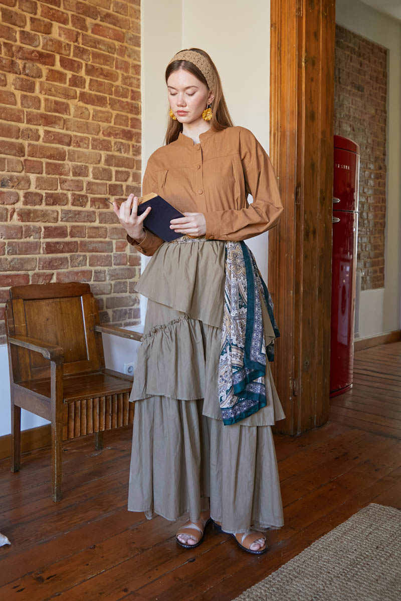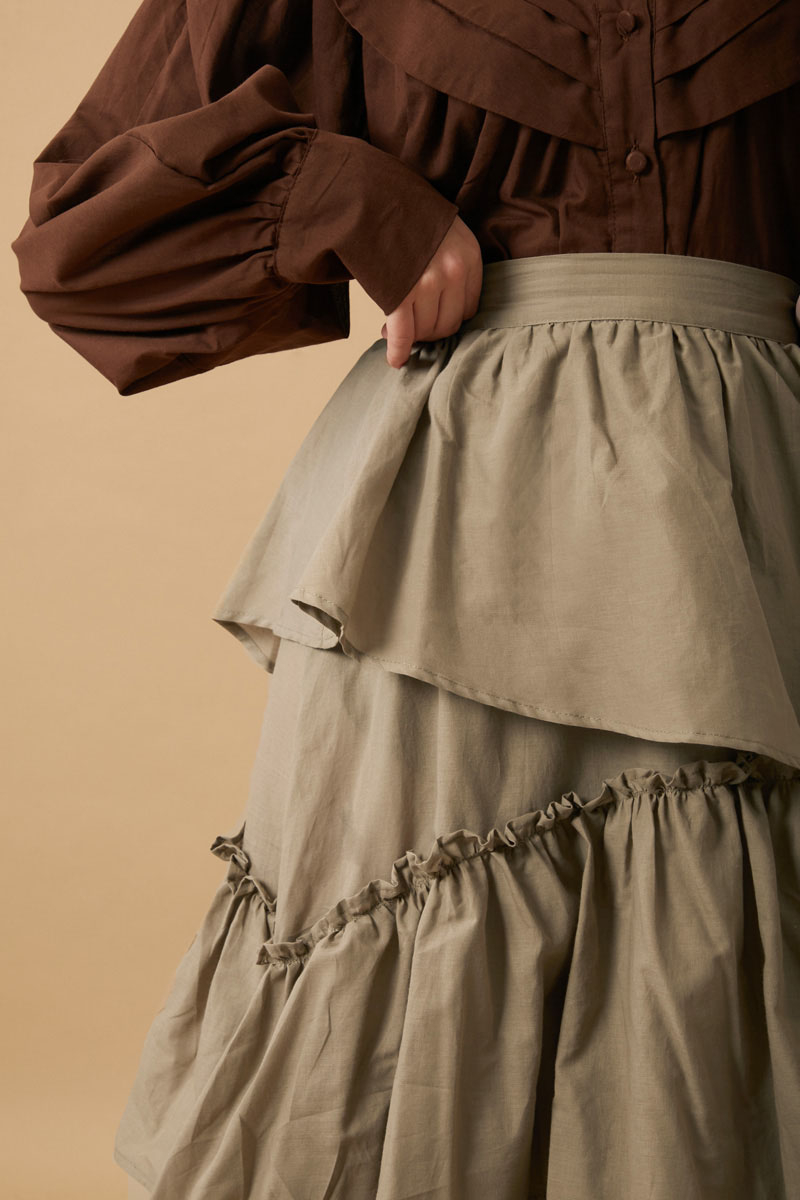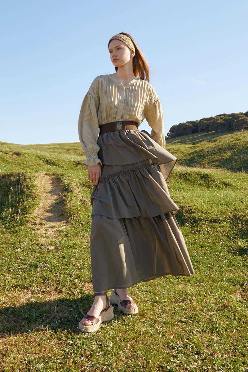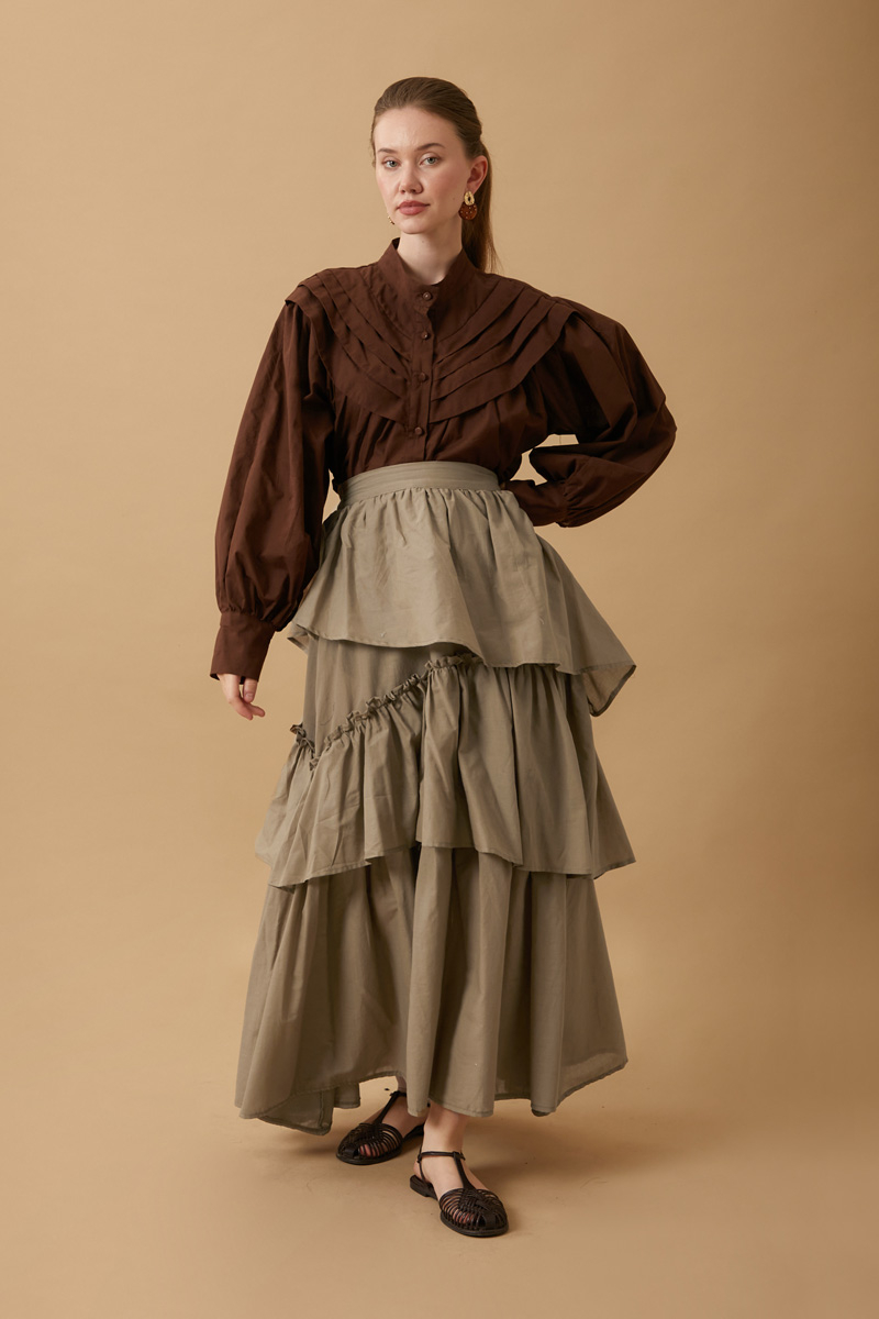 Hareketli tasarımıyla dikkat çeken bu kat kat volanlı etek, zarif ve