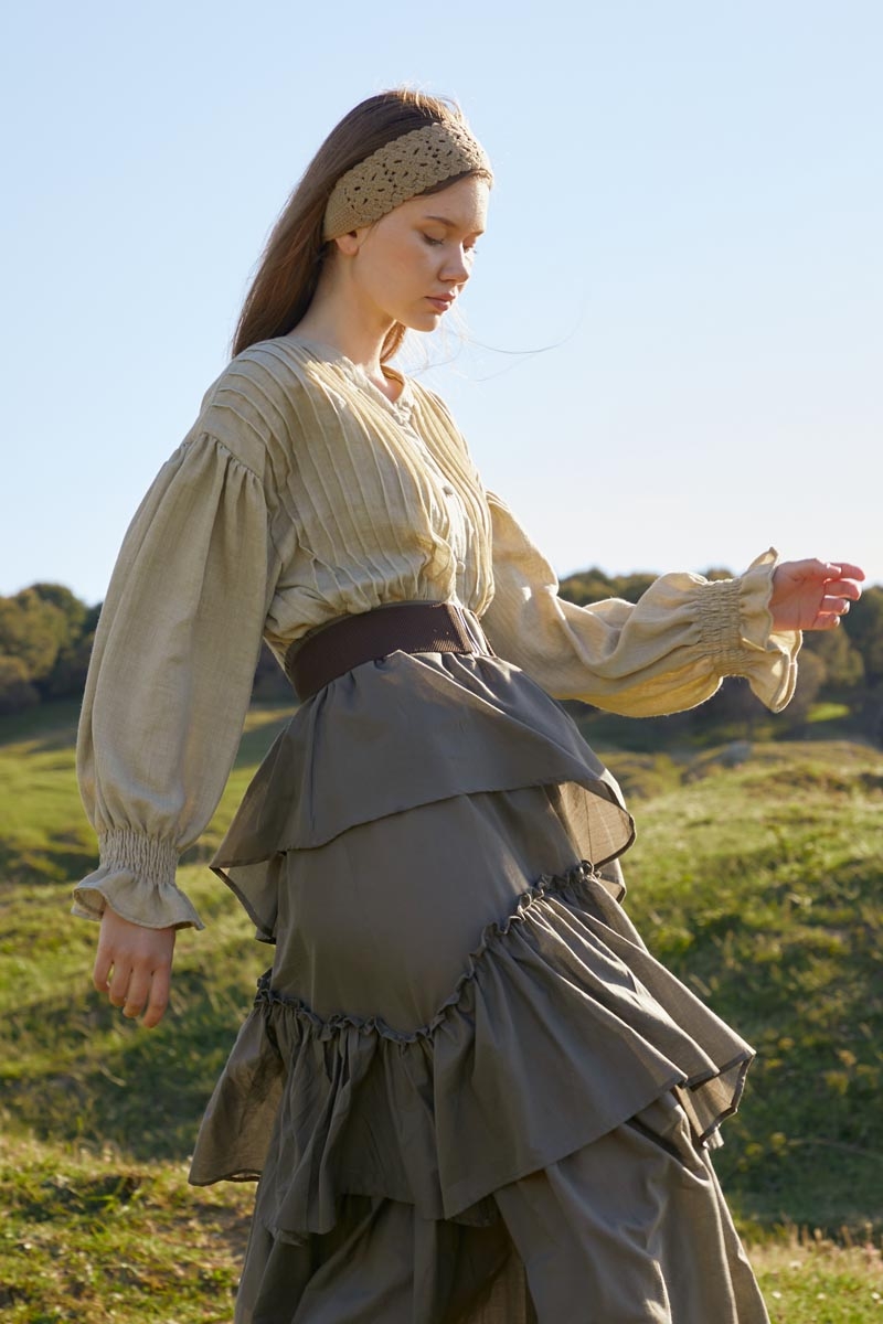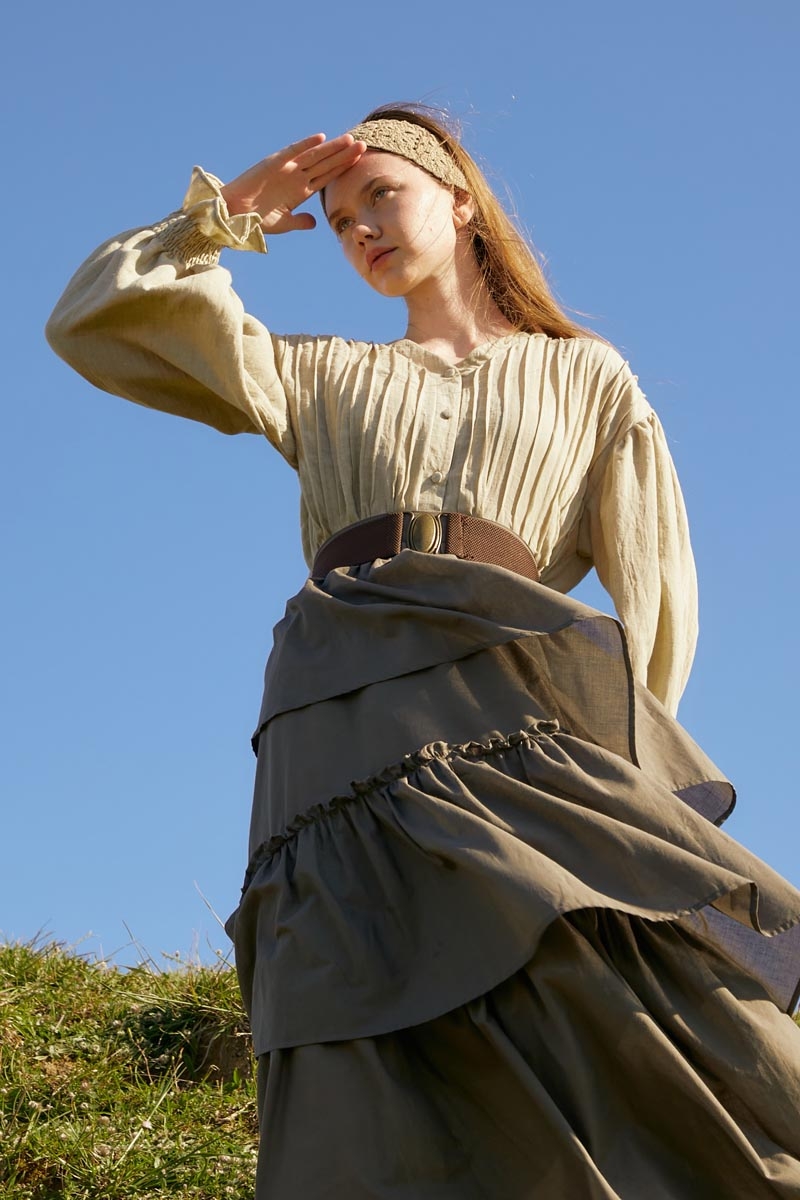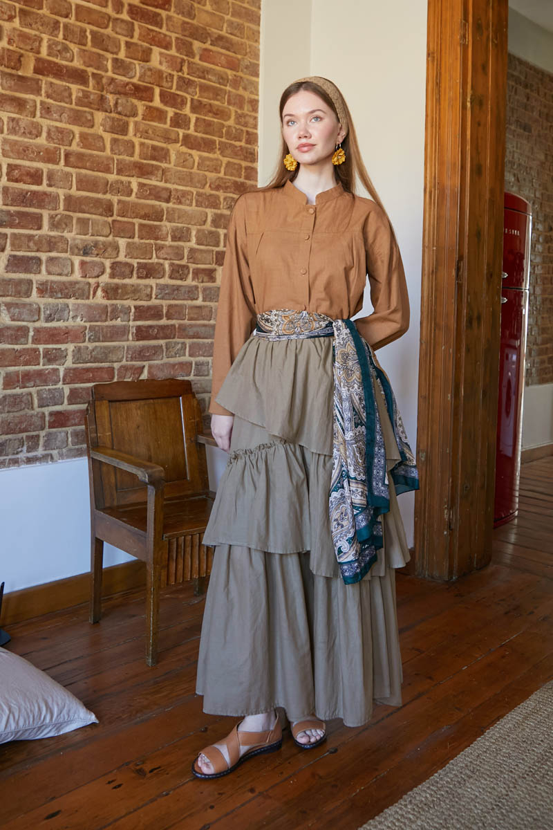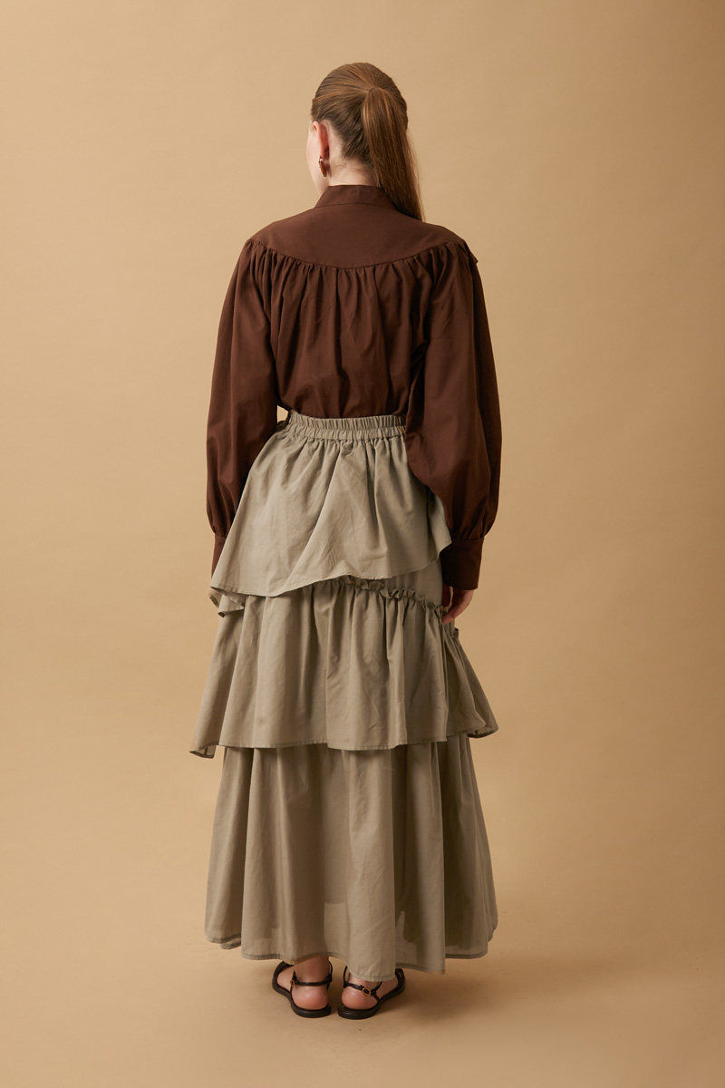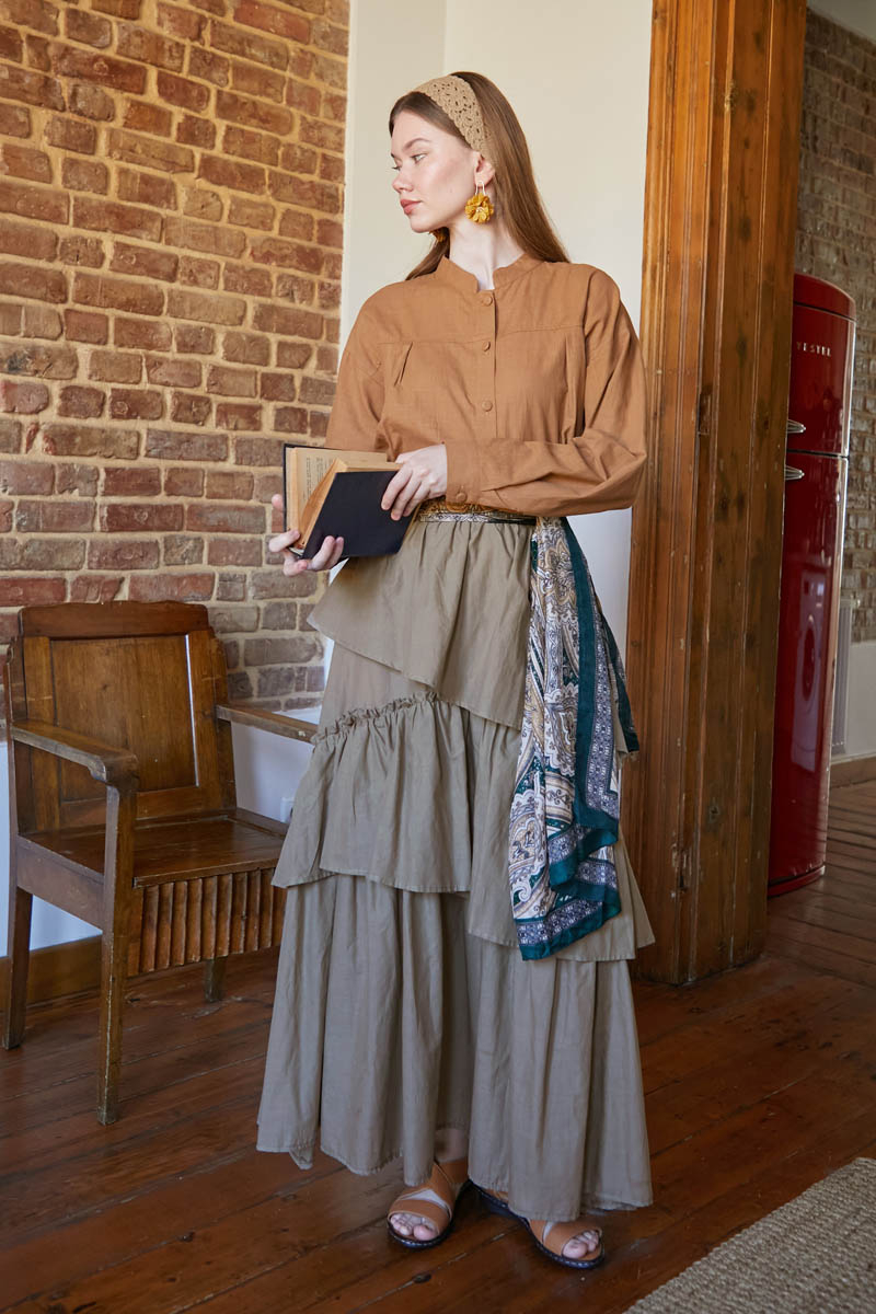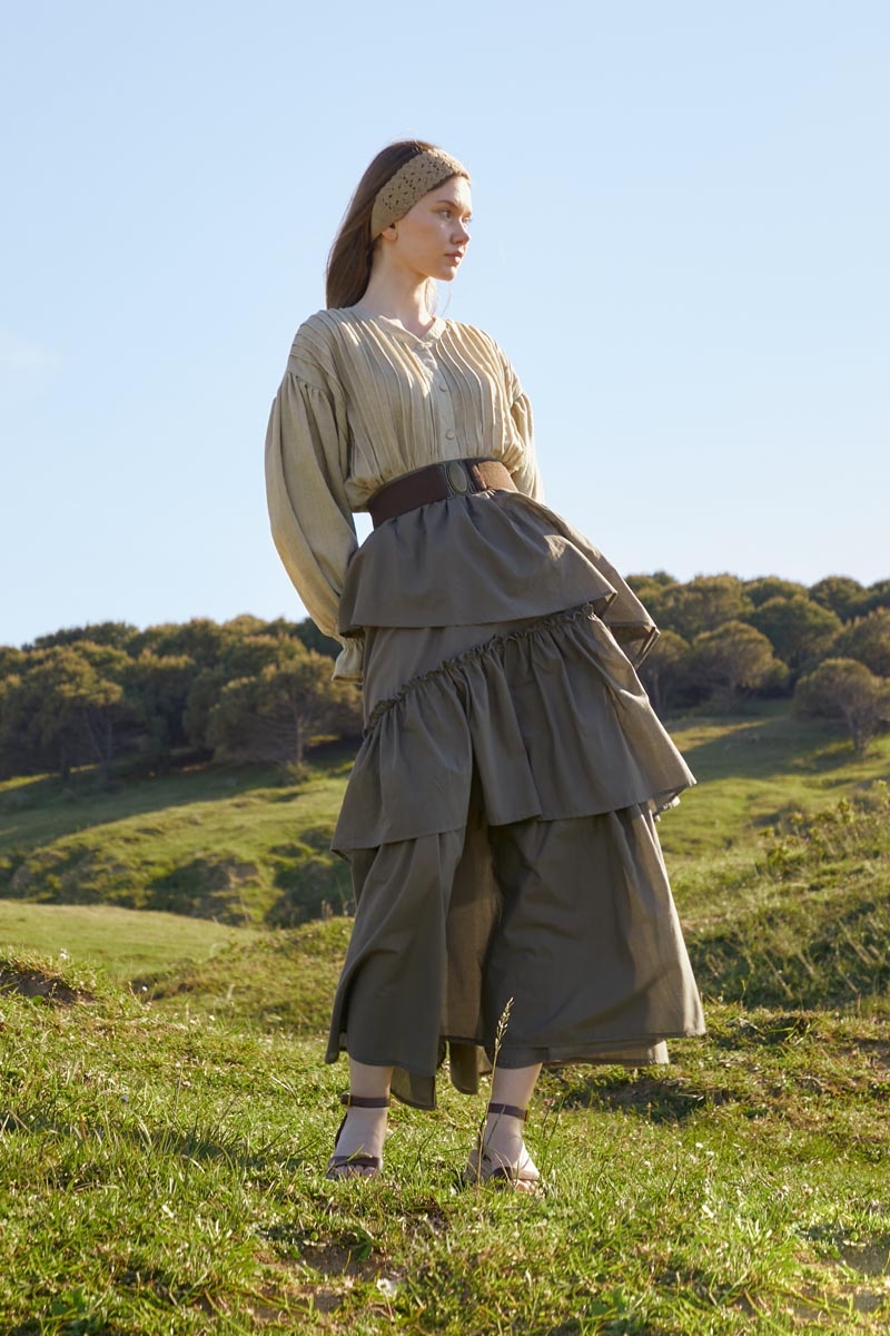 Hareketli tasarımıyla dikkat çeken bu kat kat volanlı etek, zarif ve