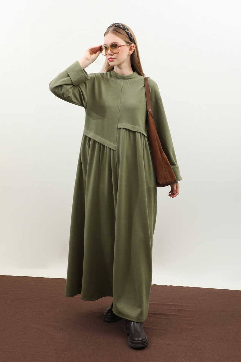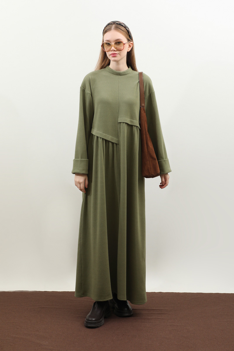Asimetrik Fitilli Elbise Haki. Bisiklet yakadır, düşük omuzludur, bilekten double katlamalıdır. Belden asimetrik detaylıdır, Ceplidir, astarsızdır, kuşaksızdır, iç göstermez. Günlük kullanım ve özel günlerinizde tercih edebilirsiniz.