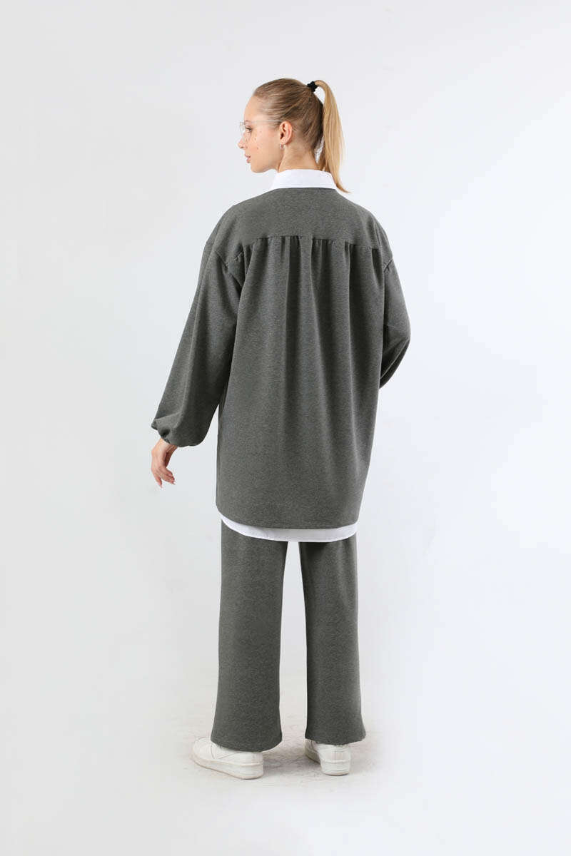 Asimetrik Gömlekli Tunik Takım Antrasit. Asimetrik tunik detaylıdır. İçten poplin gömlek detaylıdır ve gömlek bedene sabittir. Arkadan robalı ve büzgü detaylıdır. Manşeti lastiklidir. Pantolon bol paçadır. yandan ceplidir. Beli lastiklidir. Günlük kullanım ve özel günlerinizde tercih edebilirsiniz.