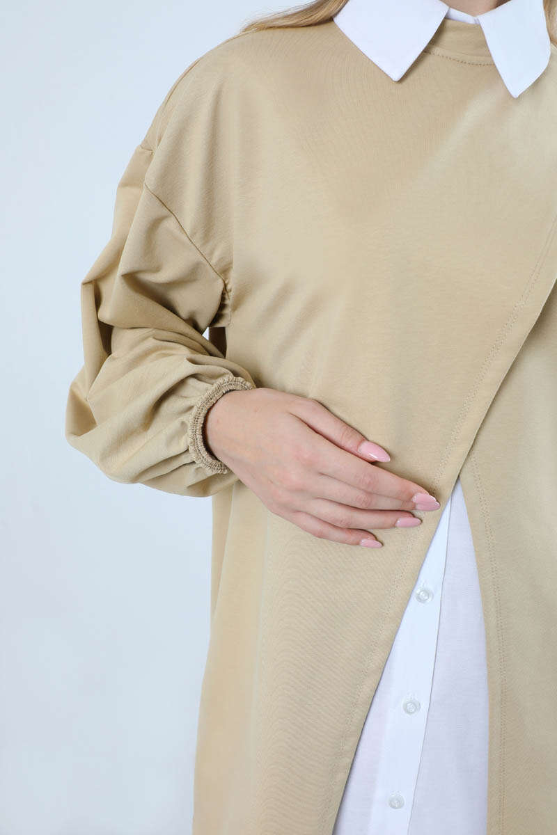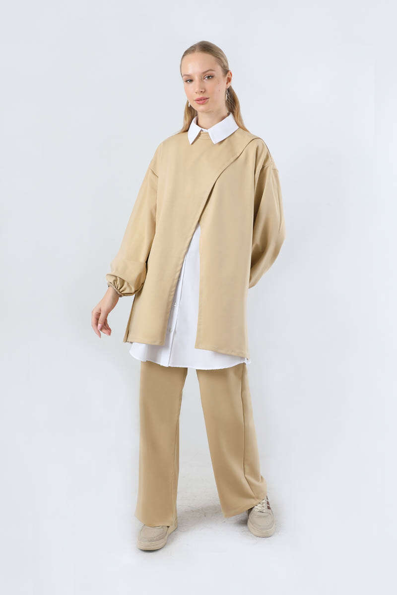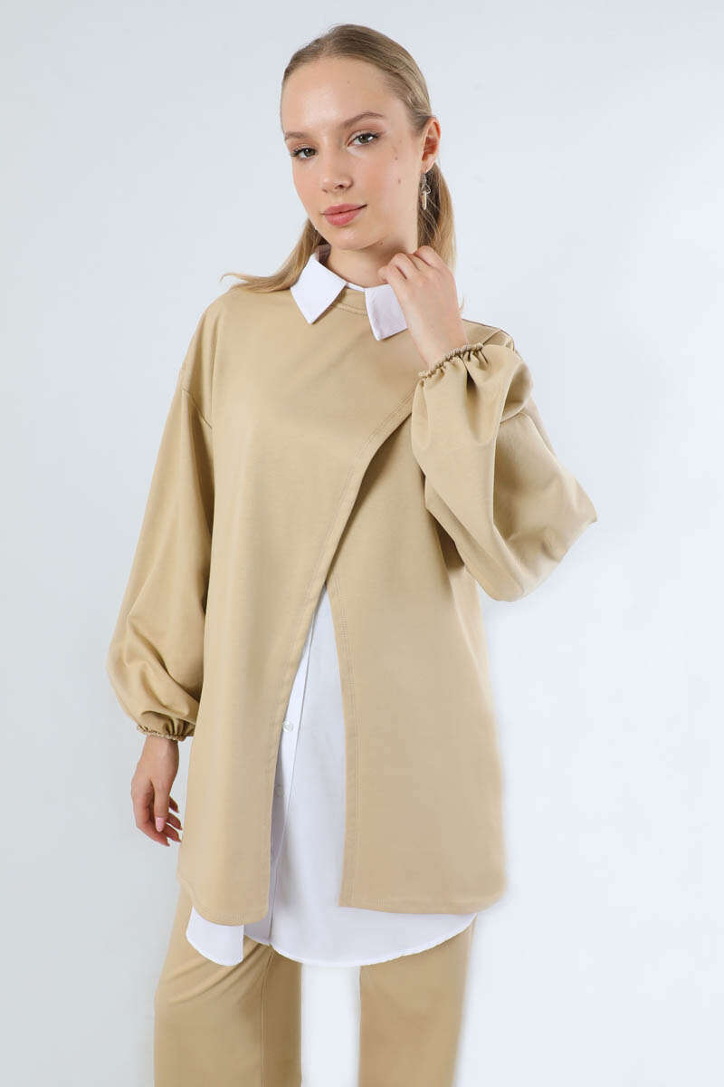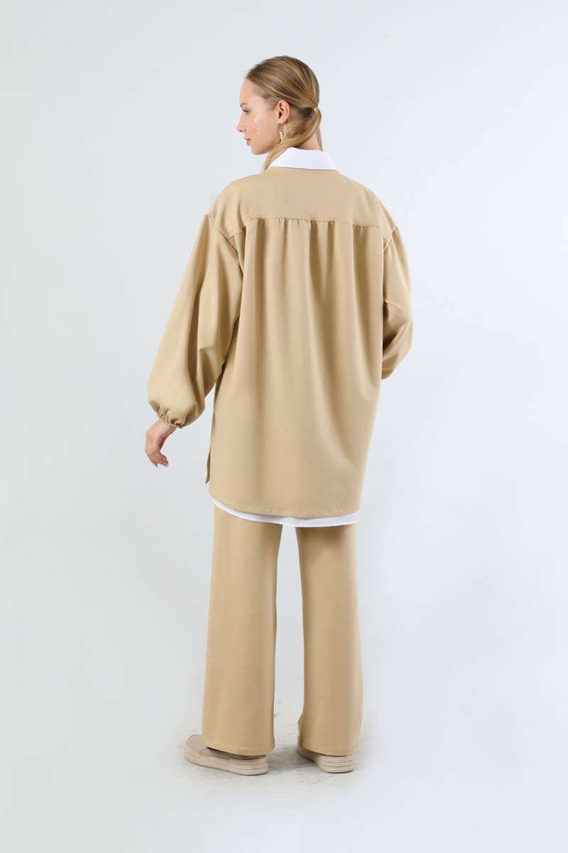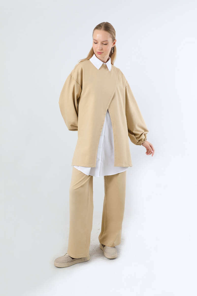 Asimetrik Gömlekli Tunik Takım Bej. Asimetrik tunik detaylıdır. İçten poplin gömlek detaylıdır ve gömlek bedene sabittir. Arkadan robalı ve büzgü detaylıdır. Manşeti lastiklidir. Pantolon bol paçadır. yandan ceplidir. Beli lastiklidir. Günlük kullanım ve özel günlerinizde tercih edebilirsiniz.