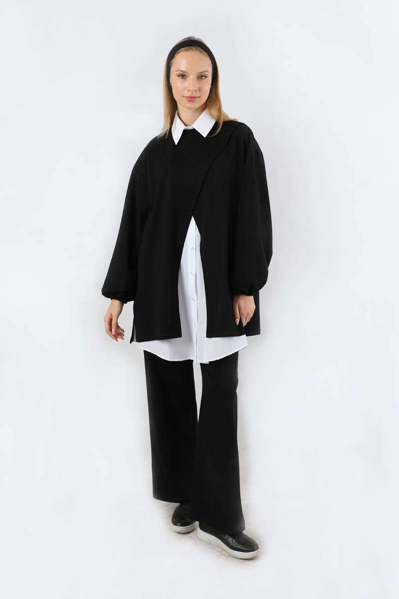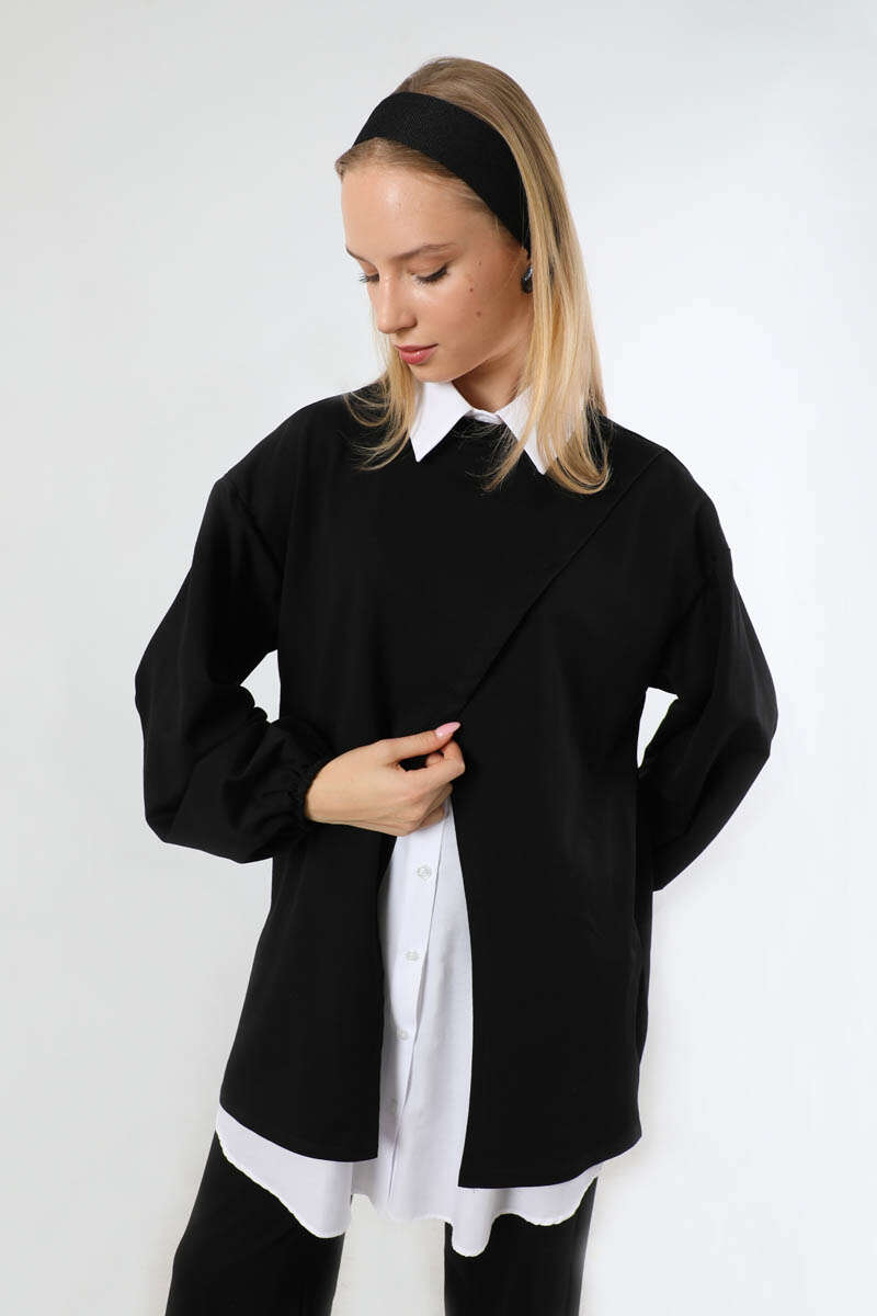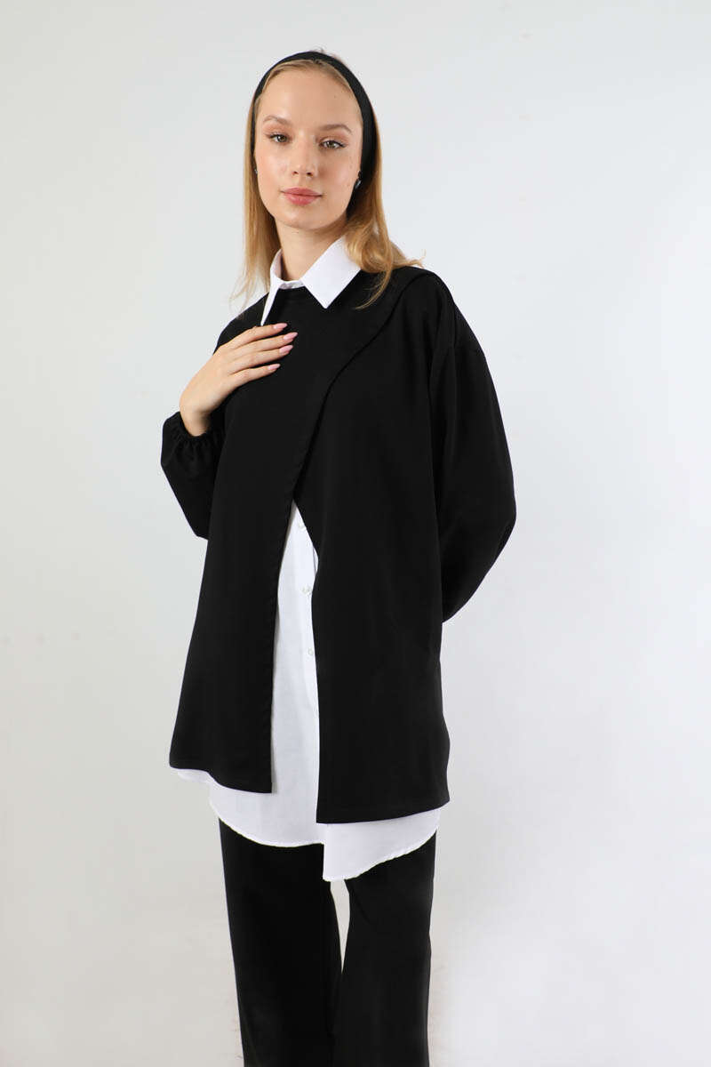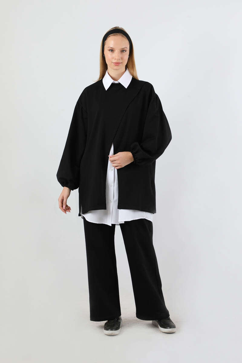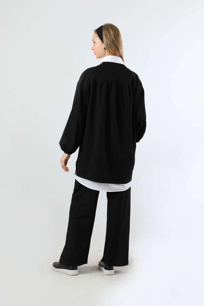 Asimetrik Gömlekli Tunik Takım Siyah. Asimetrik tunik detaylıdır. İçten poplin gömlek detaylıdır ve gömlek bedene sabittir. Arkadan robalı ve büzgü detaylıdır. Manşeti lastiklidir. Pantolon bol paçadır. yandan ceplidir. Beli lastiklidir. Günlük kullanım ve özel günlerinizde tercih edebilirsiniz.