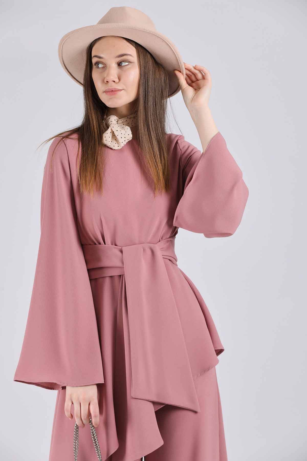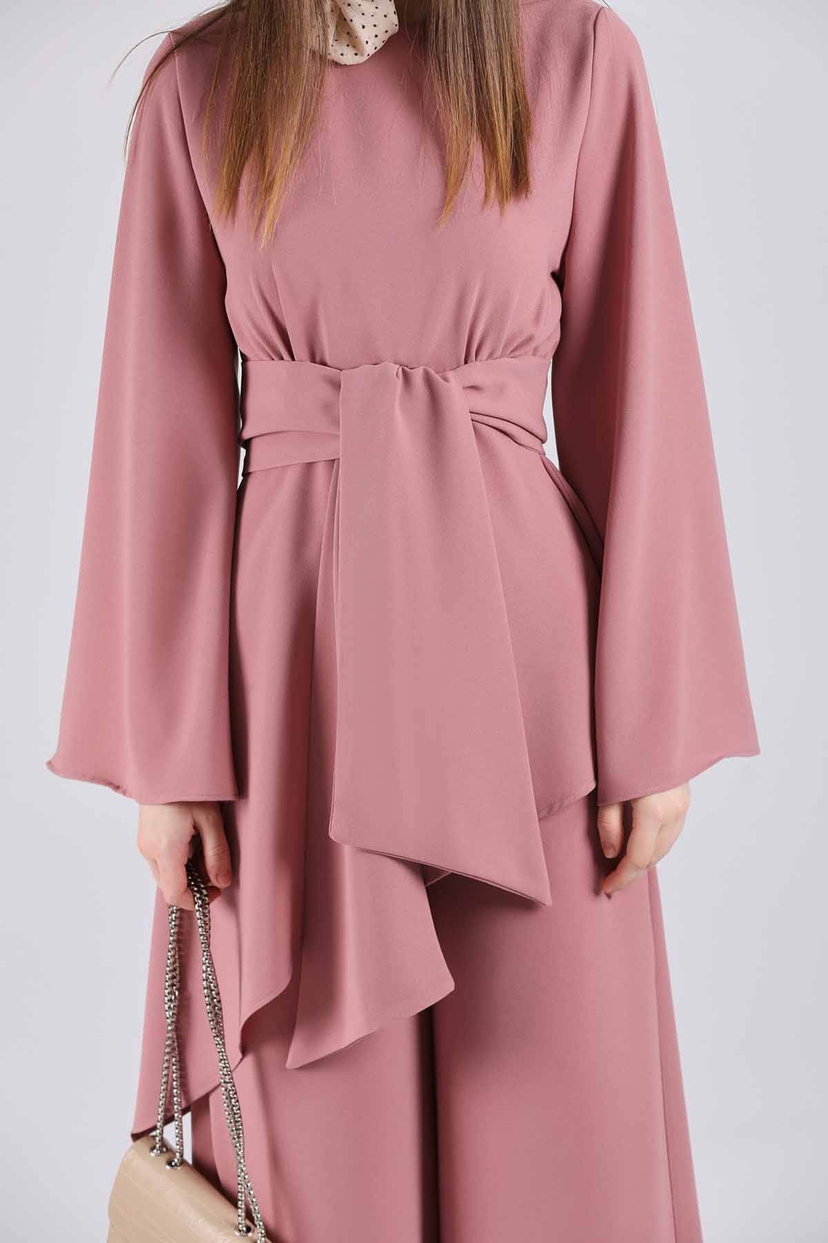 Asimetrik Kuşaklı Tunik Takım Gül Kurusu, cepleri aktiftir, Kuşaklıdır . yandan ceplidir. Tam kalıptır.