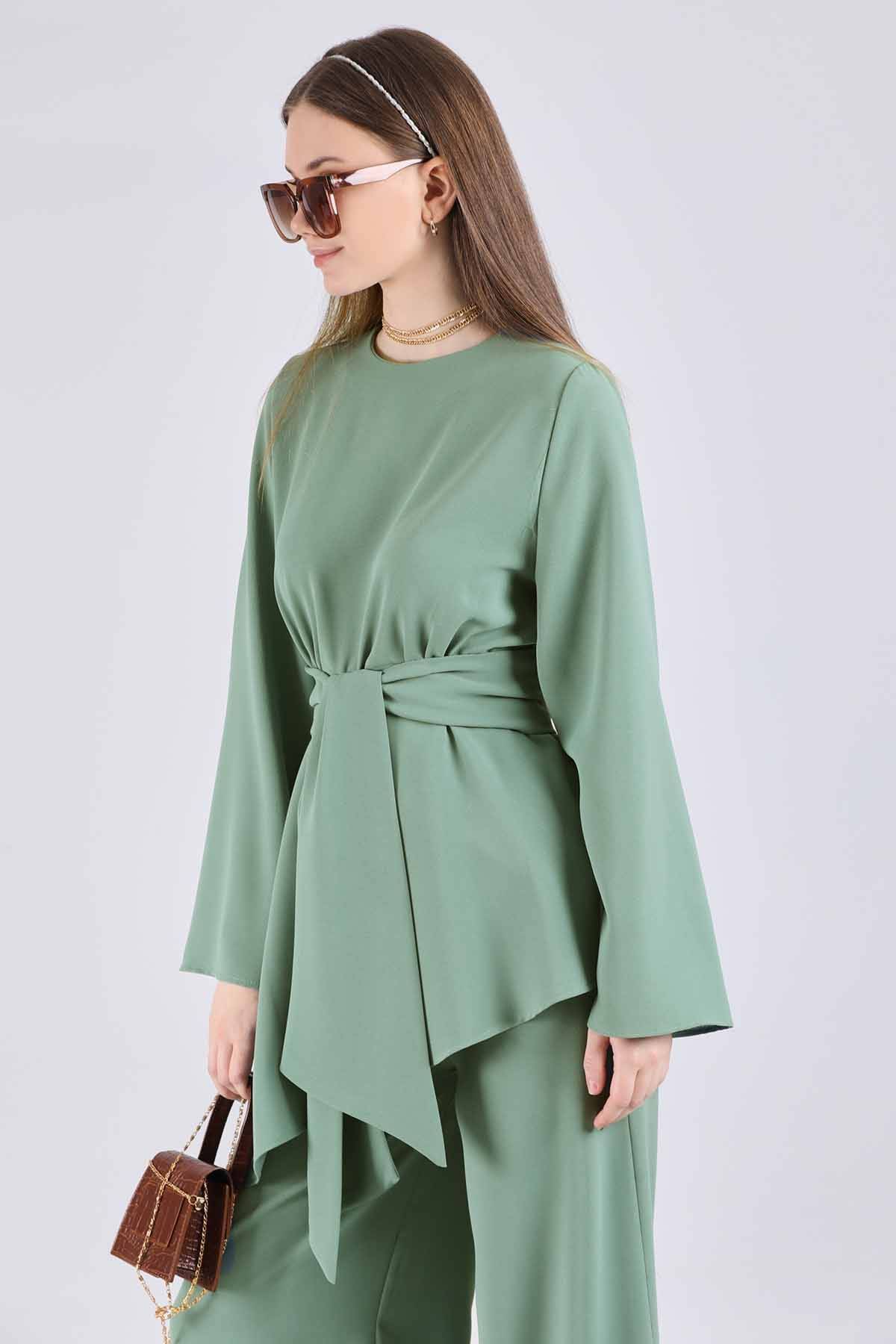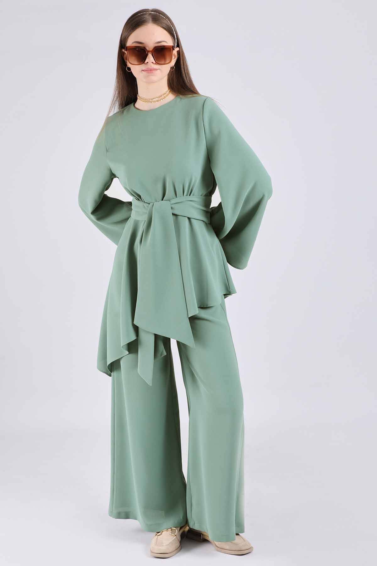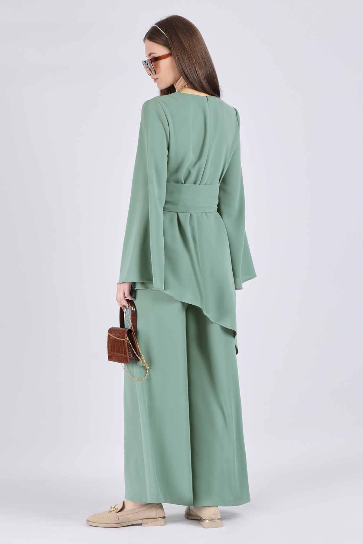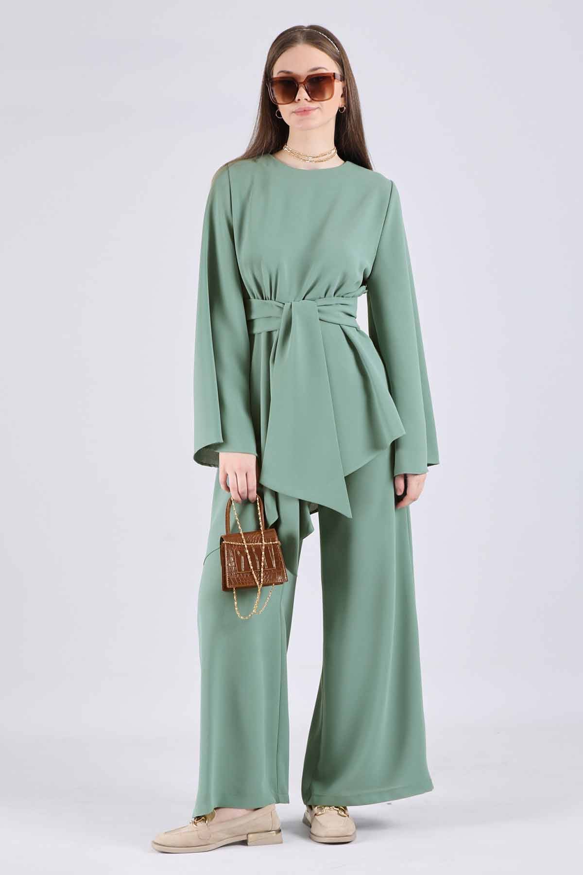 Asimetrik Kuşaklı Tunik Takım Mint, cepleri aktiftir, Kuşaklıdır . yandan ceplidir. Tam kalıptır.