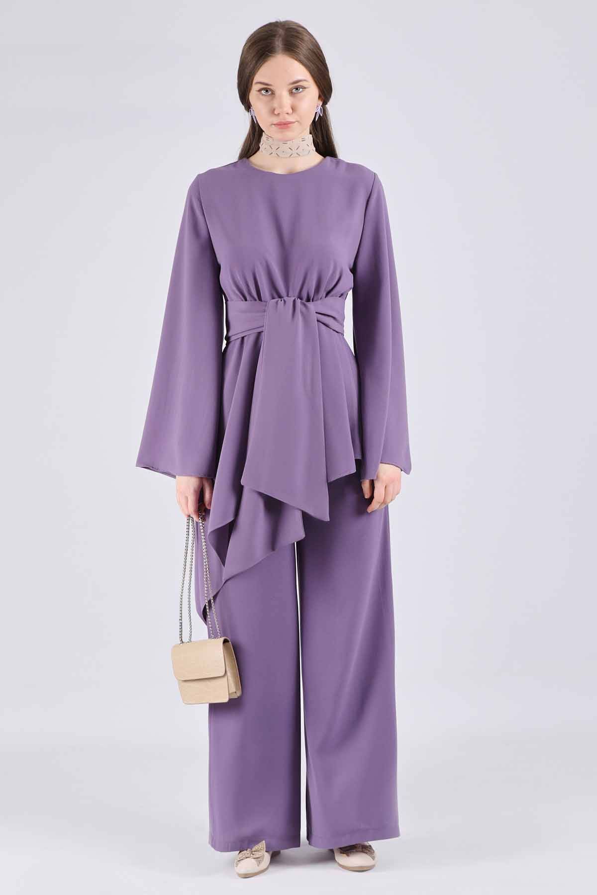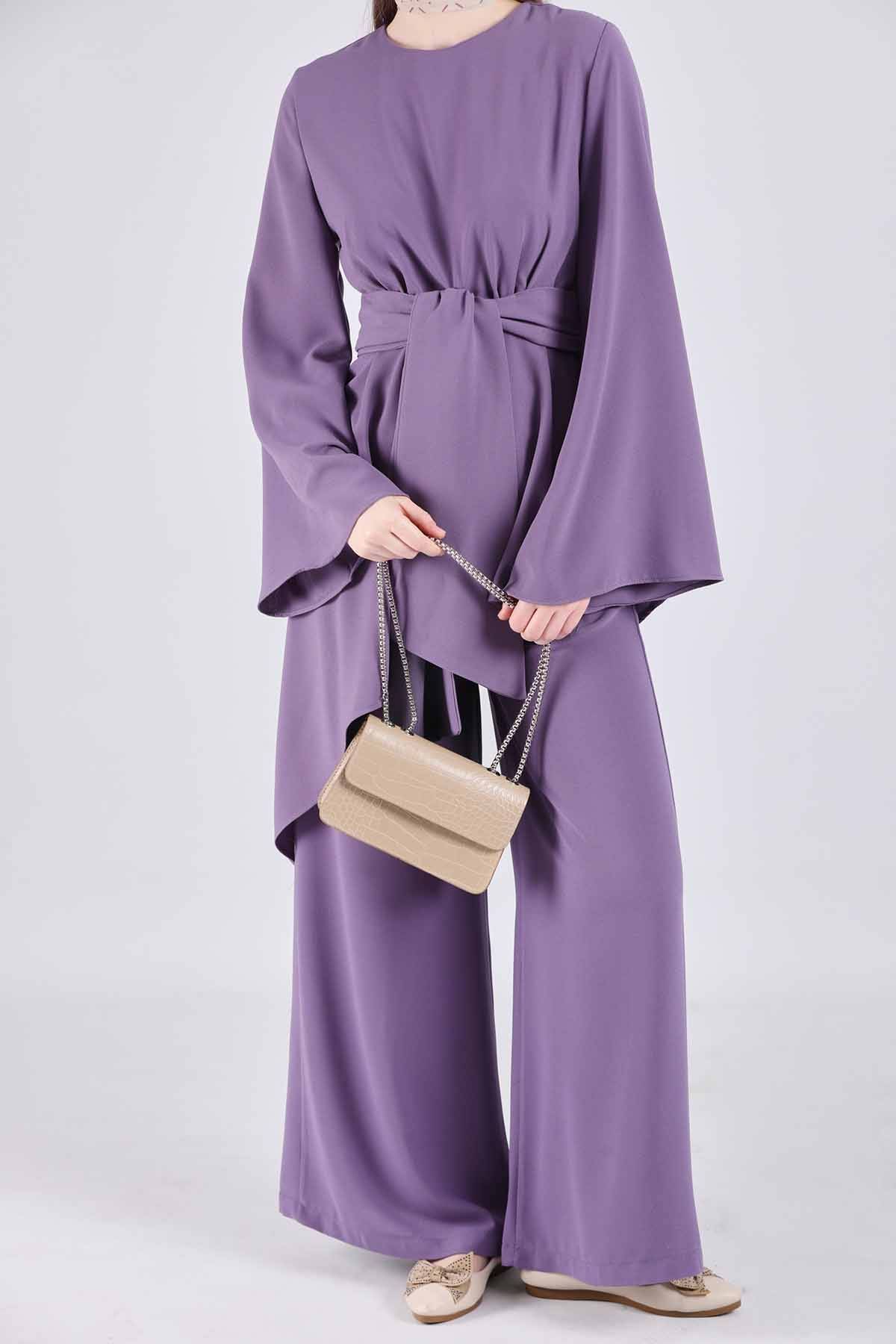 Asimetrik Kuşaklı Tunik Takım Lila