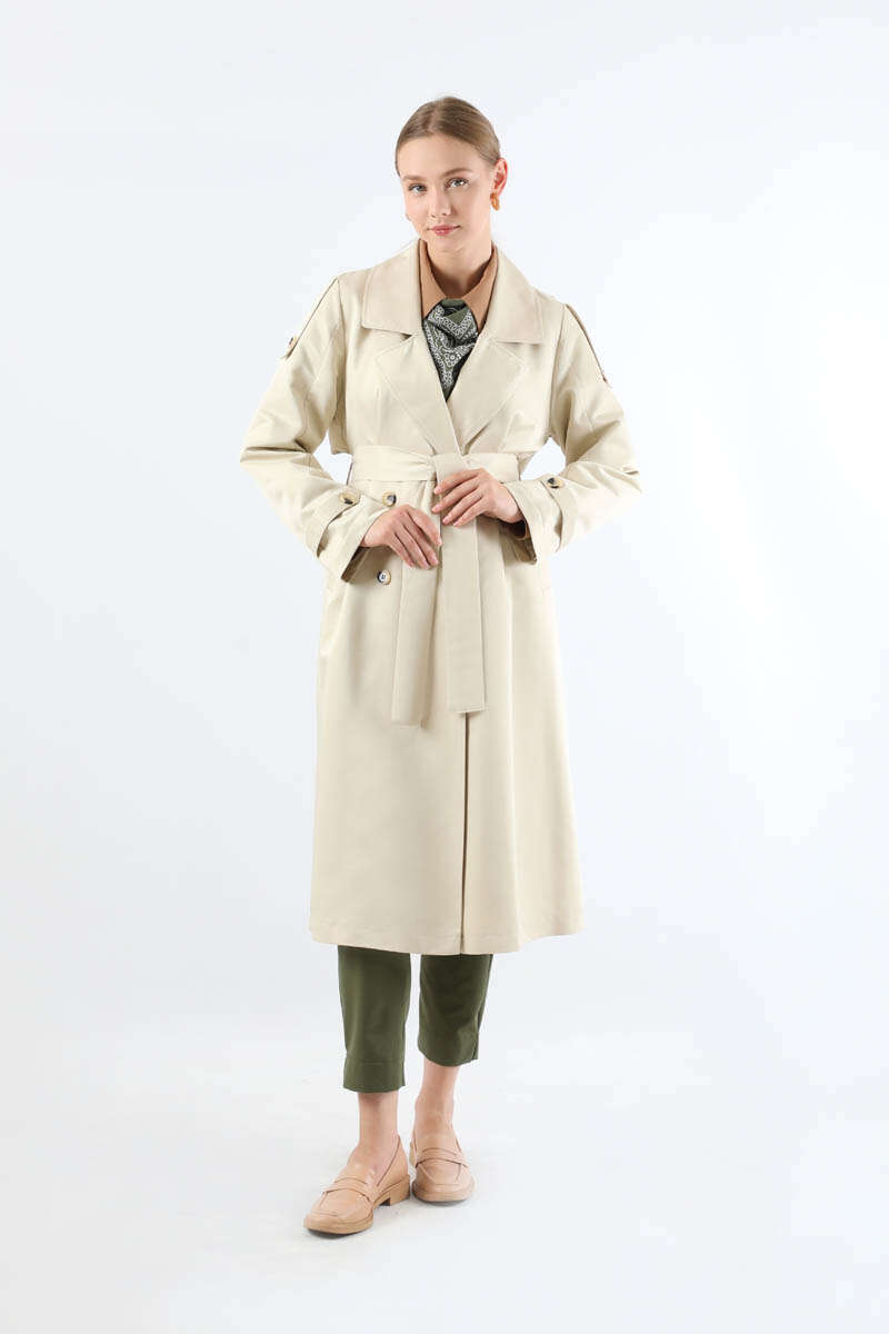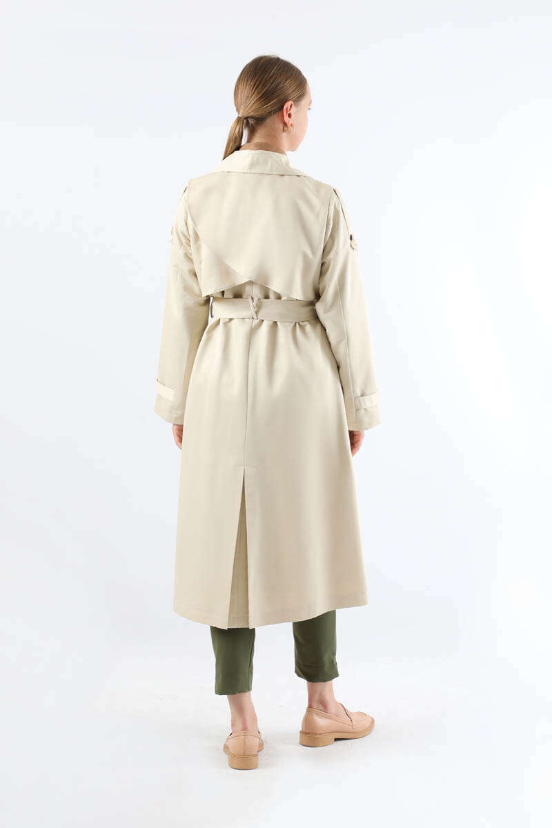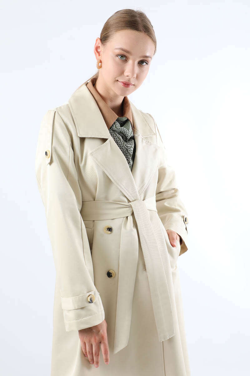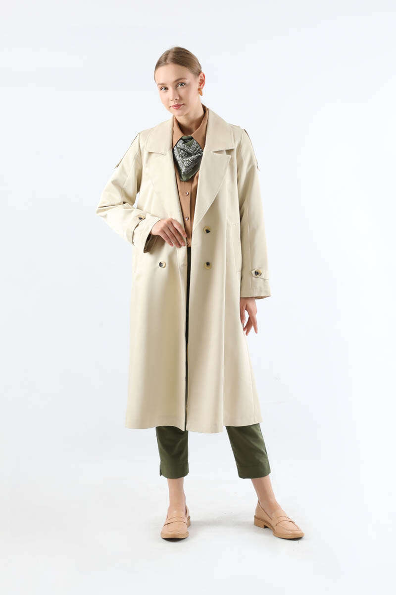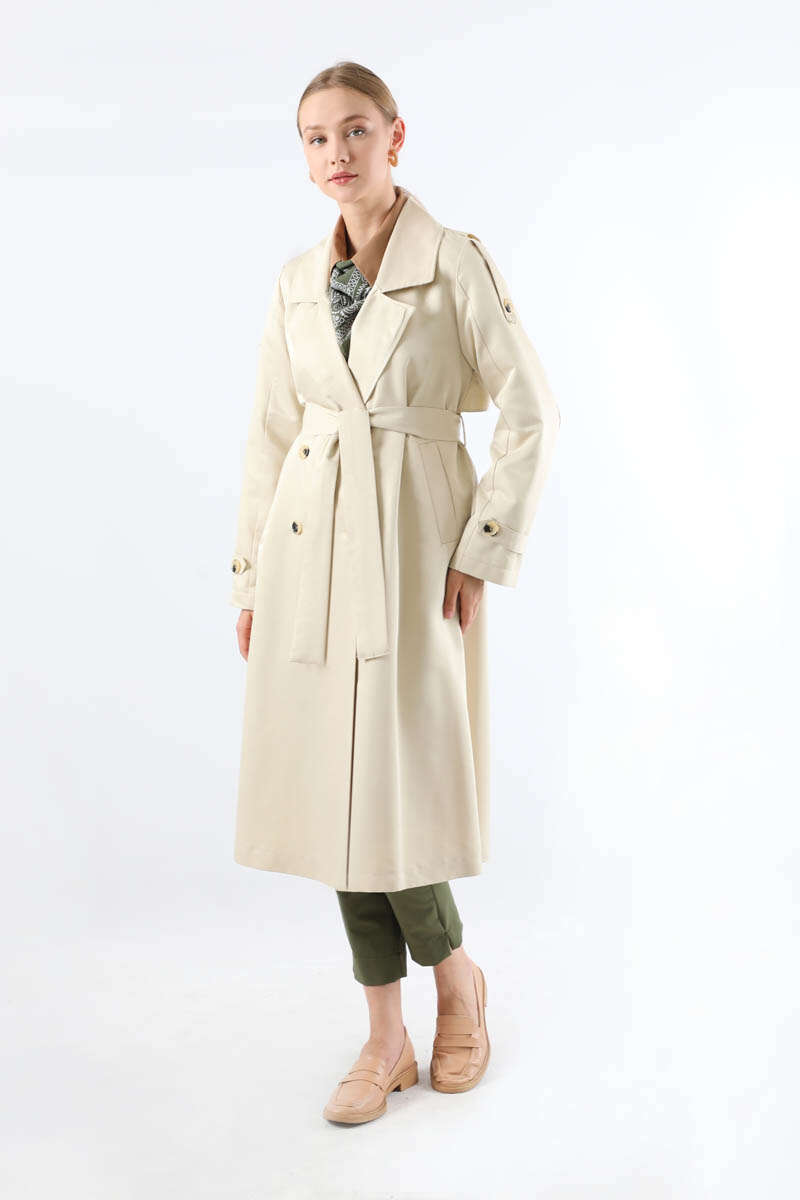 Asimetrik Rüzgarlıklı Düğmeli Trençkot Ekru