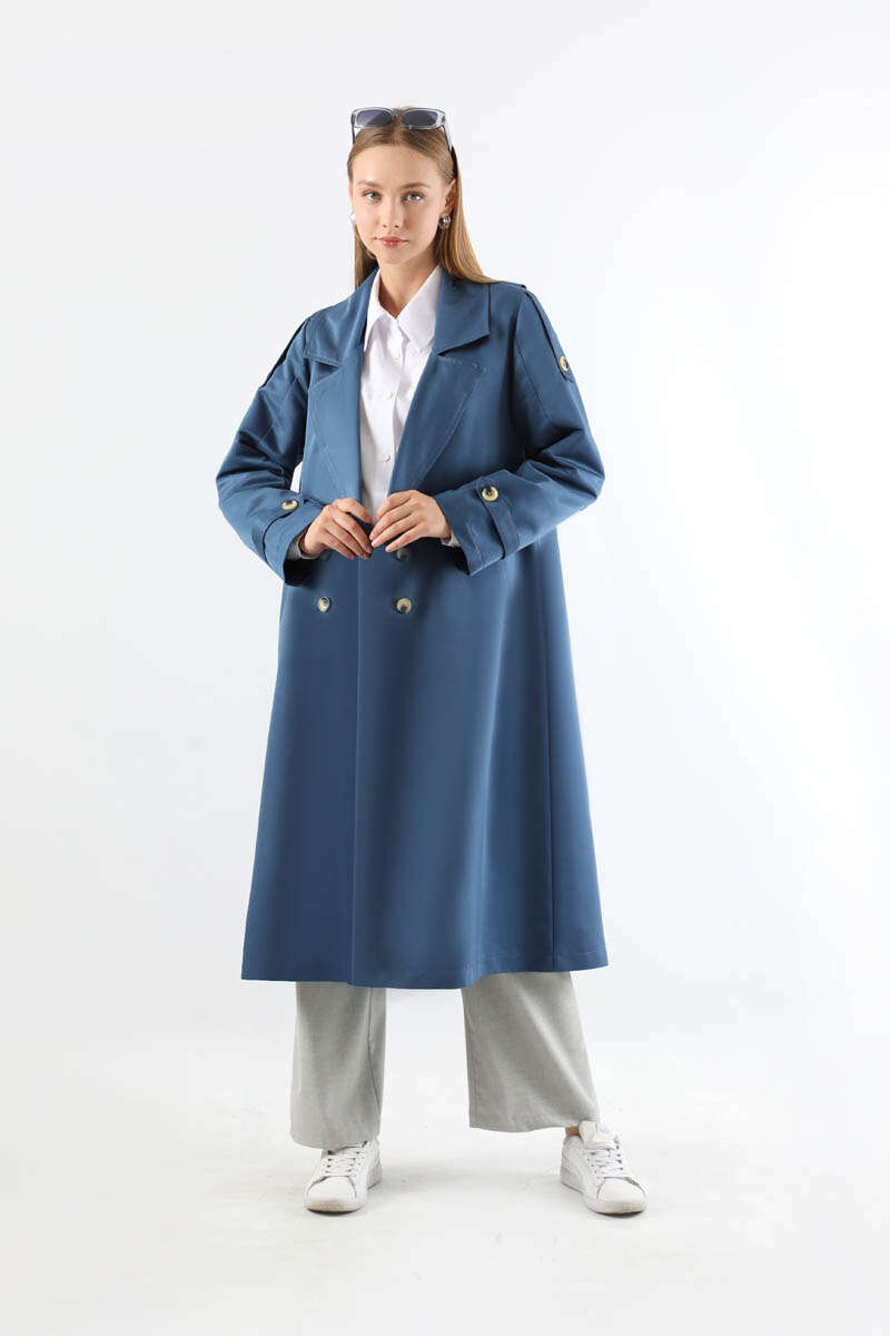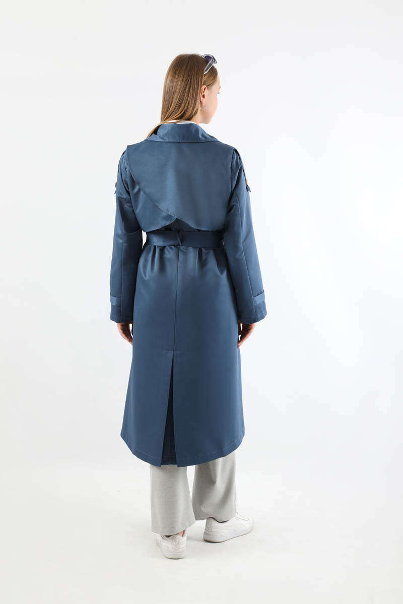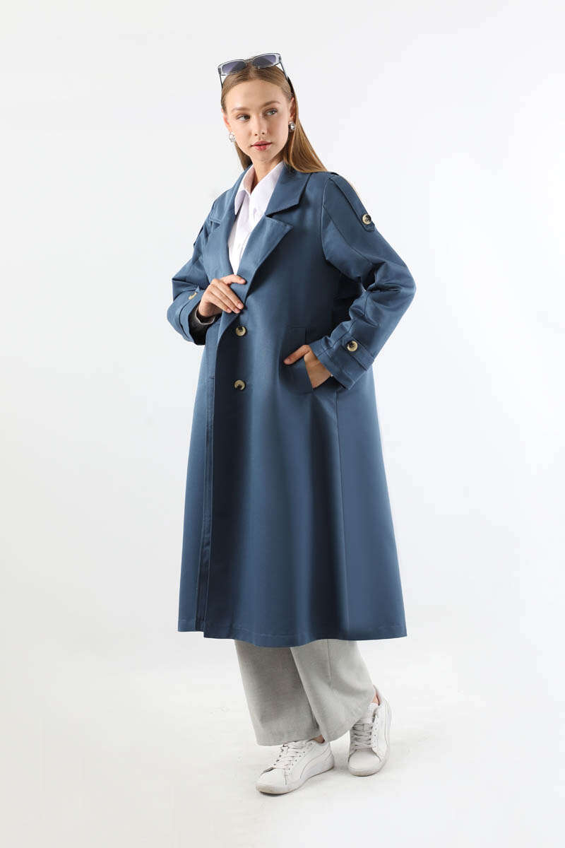 Asimetrik Rüzgarlıklı Düğmeli Trençkot İndigo