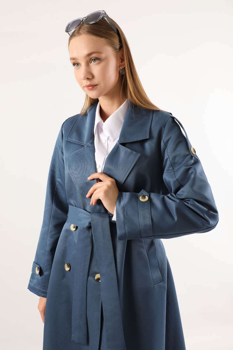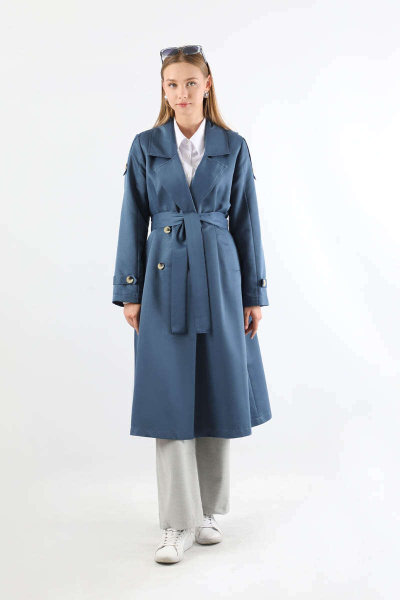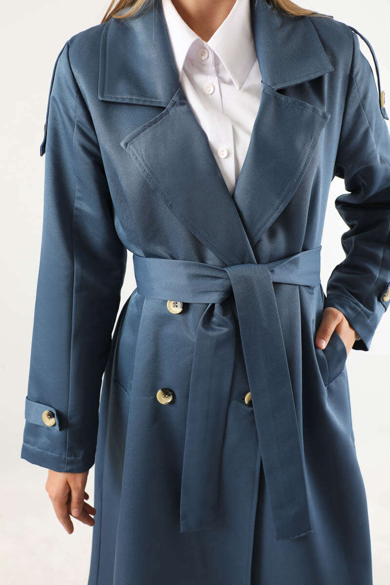 Asimetrik Rüzgarlıklı Düğmeli Trençkot İndigo. Arkadan asimetrik rüzgarlık detaylıdır. Omzunda ve kollarında apolet detayı mevcuttur. Kruvaze kapamalıdır. Etek ucundan kapalı A pilelidir. Kuşaklıdır. Ceplidir. Günlük kullanım ve özel günlerinizde tercih edebilirsiniz.