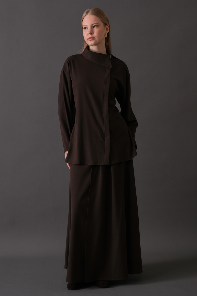 Asimetrik Yaka Gömlek Acı Kahve, modern ve minimal çizgileri sevenler için tasarlandı. Asimetrik yakasıyla klasik gömlek formuna yenilikçi bir dokunuş katan model, dökümlü yapısıyla gün boyu konfor sunar. Gizli pat kapaması sayesinde temiz ve sade bir görünüm oluştururken, rahat kalıbı hem ofis hem günlük stil için çok yönlü bir kullanım sağlar.