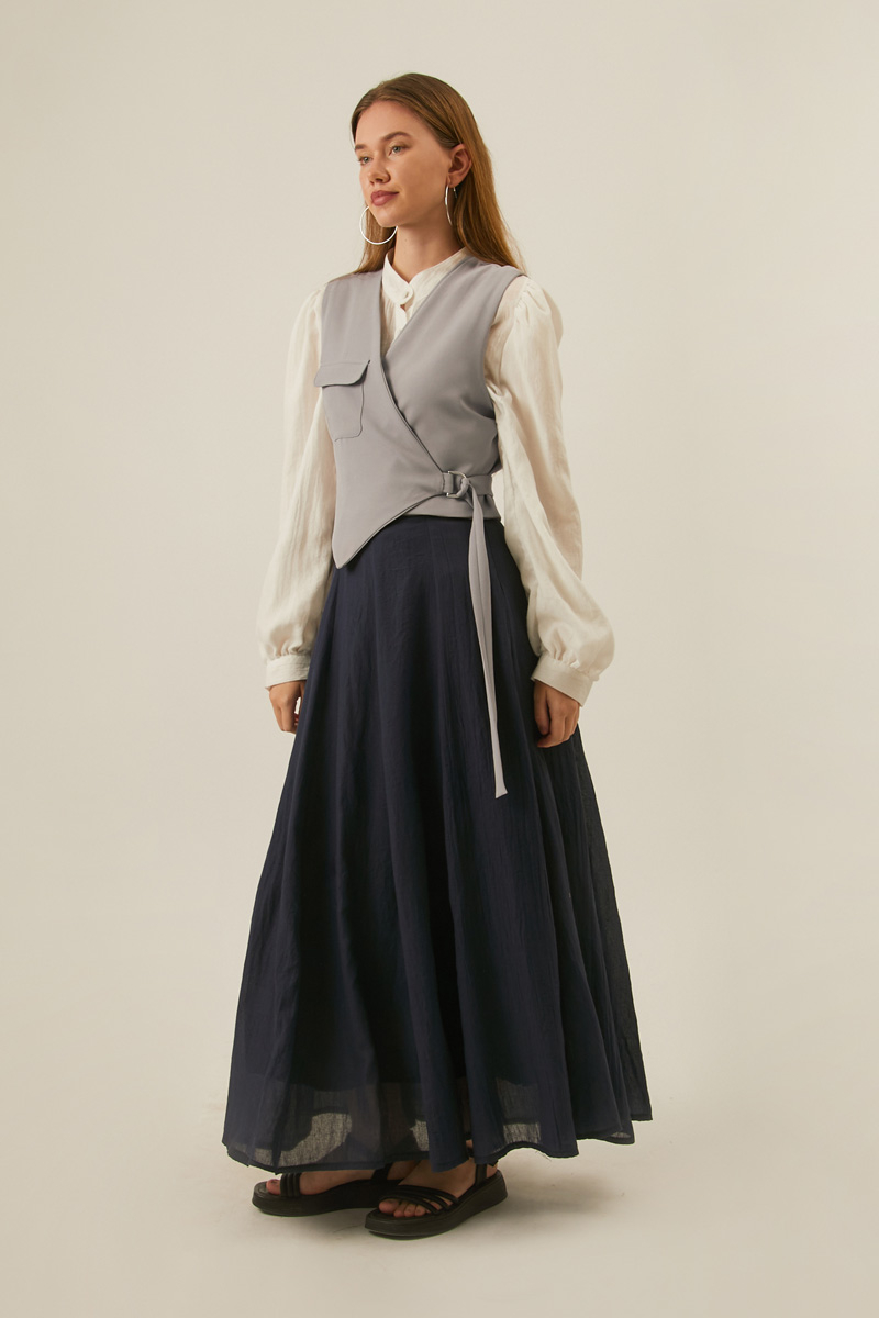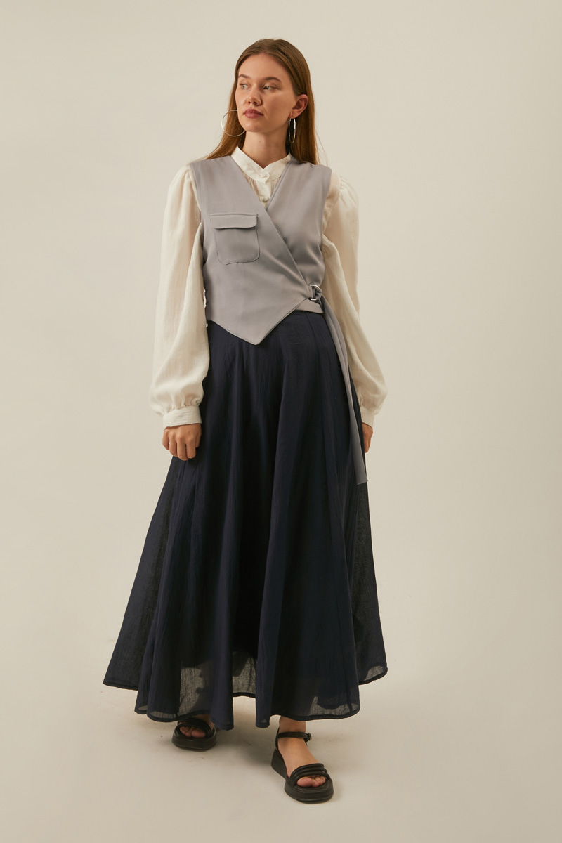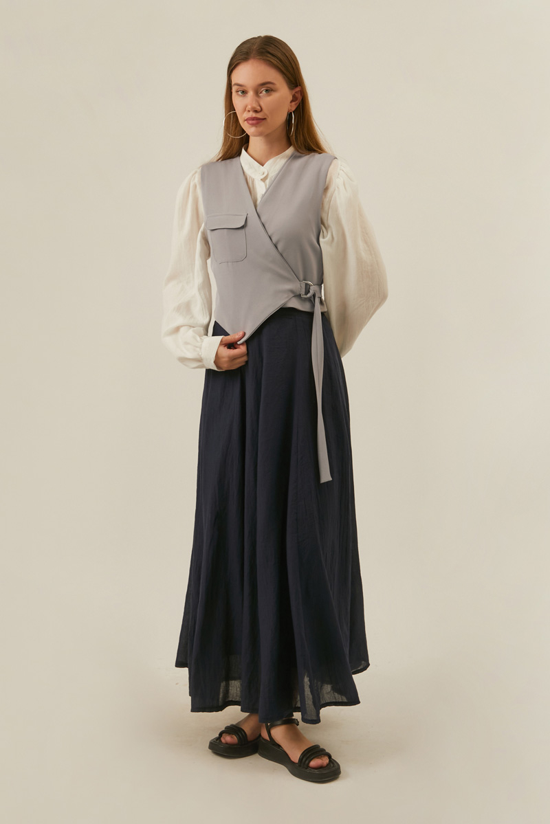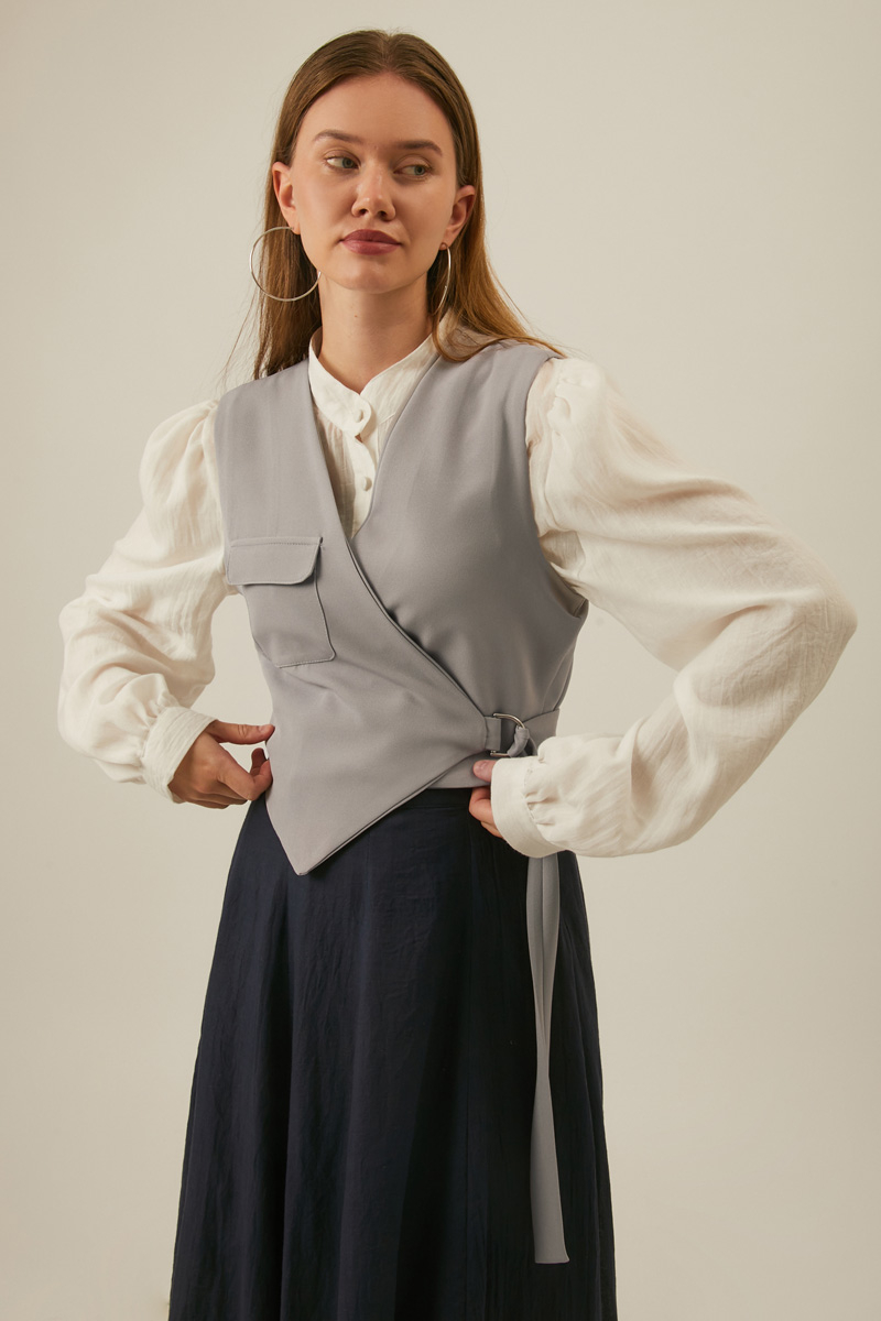 Asimetrik Yelek Gri. Kruvaze bağlamalıdır. Kuşak kısmı yandan D toka ile bağlamalıdır. Önden kapaklı cep detayı mevcuttur. Astarlıdır. Önü asimetriktir. Elbise ve etek kombinlerinizde tercih edebilirsiniz. Mevsimlik üründür.