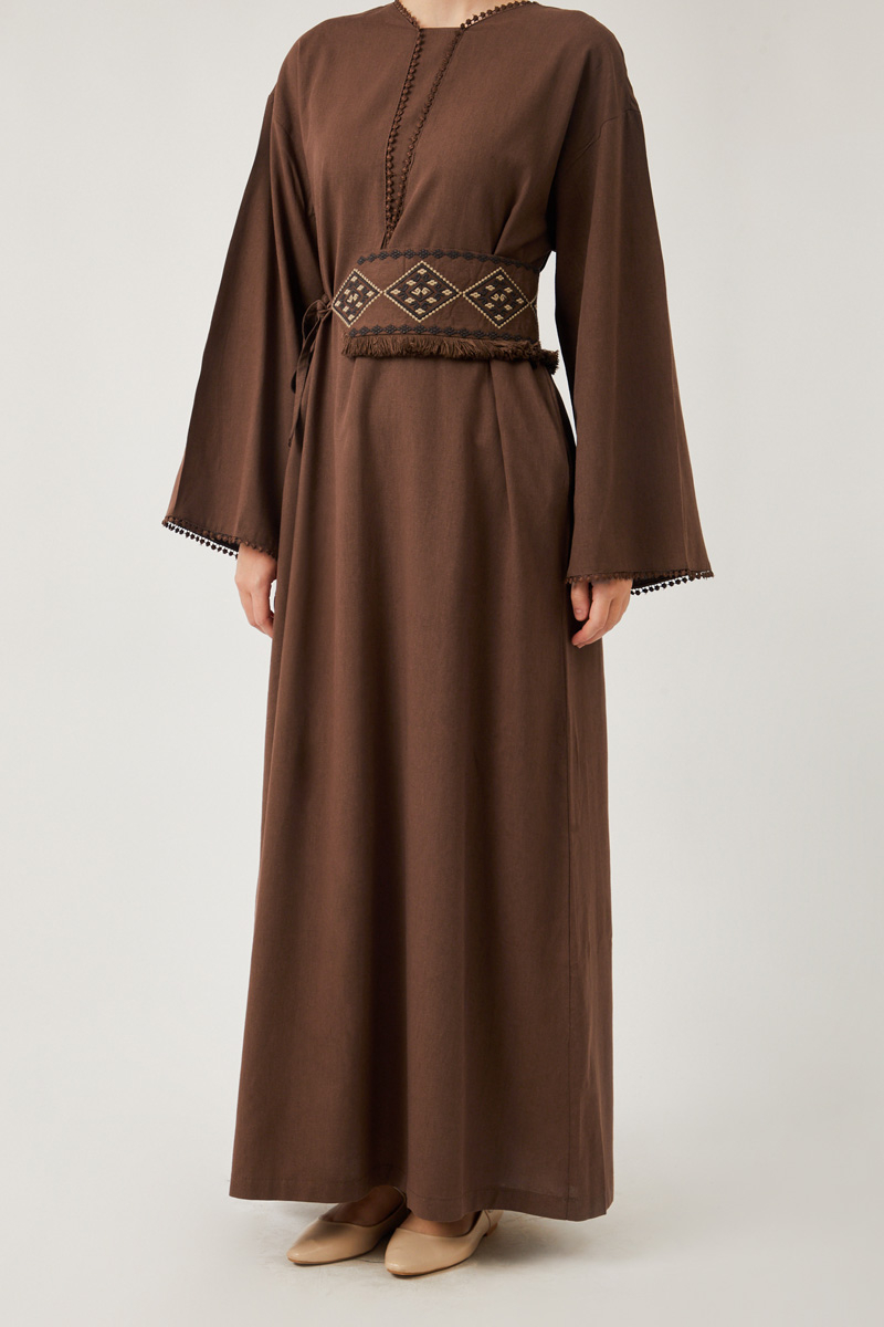 Featuring a crew neckline, front V-shaped cut, and side pockets, this dress offers both comfort and style. The dropped shoulders give it a relaxed silhouette, while the ethnic-patterned, embroidered belt with tassels adds a unique touch. Designed without lining, it is suitable for both daily wear and special occasions.