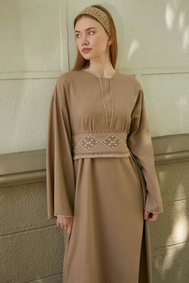 Asrın Elbise Camel. Bisiklet yakadır, önden v yandan ceplidir, düşük kolludur, yandan ceplidir, kemeri nakışlı ve püskülü etnik desenlidir, astarsızdır, Günlük kullanım ve özel günlerinizde tercih edebilirsiniz.