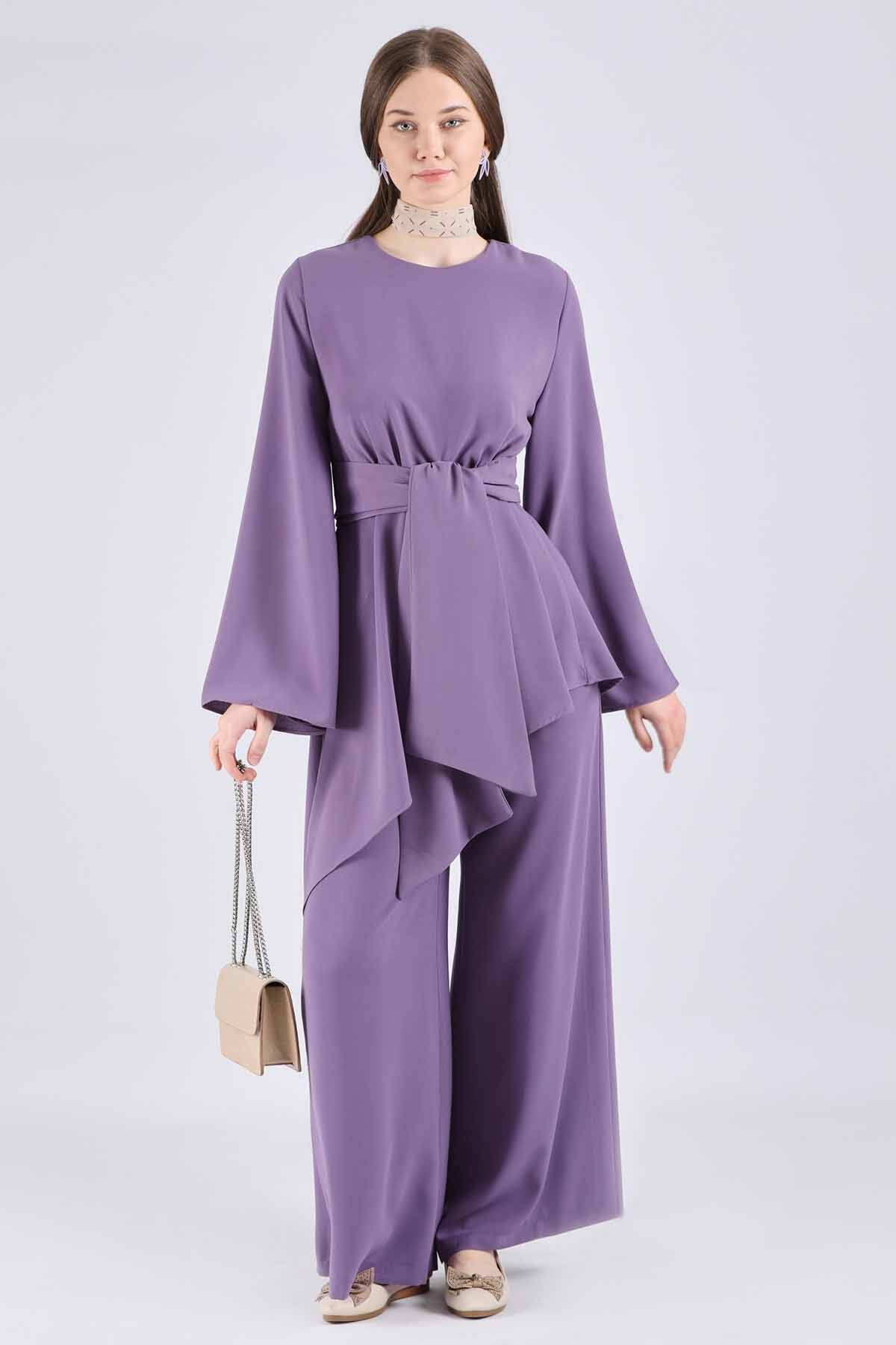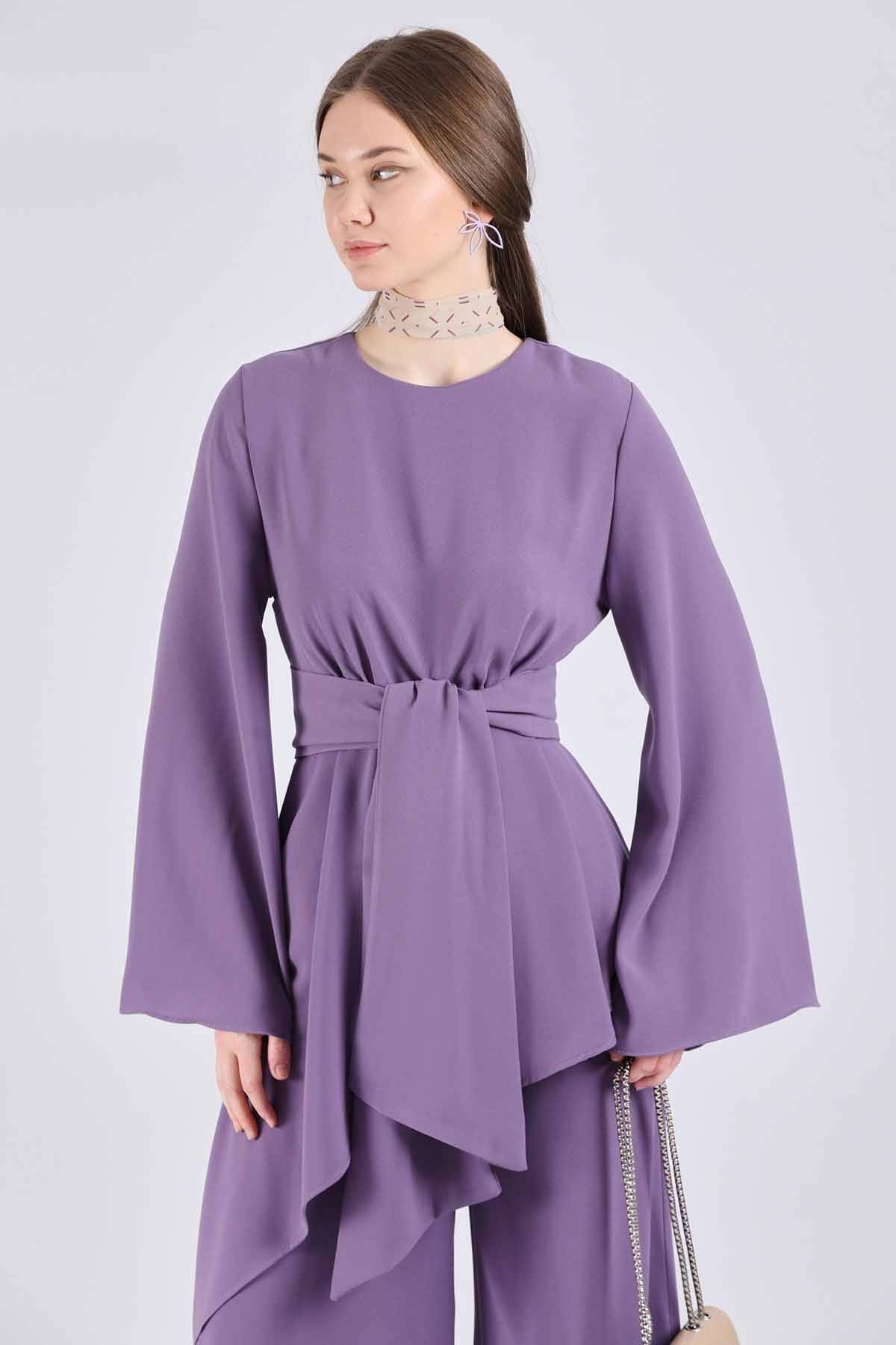 Asymmetrical Belted Tunic Suit Purple, active pockets, Belted. It has side pockets. It is full mold.