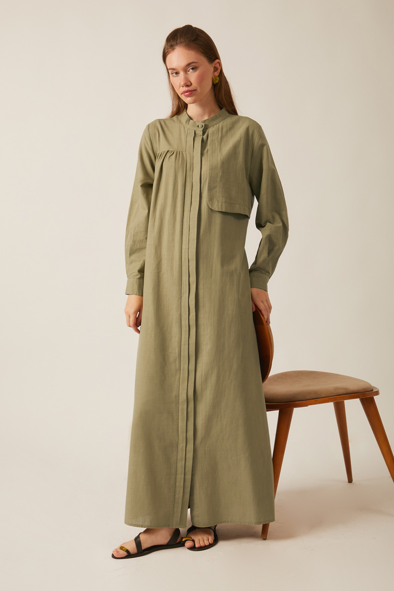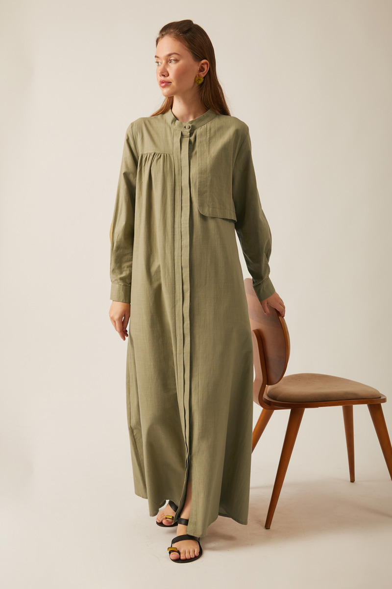 Hidden button placket with gathered waist detail