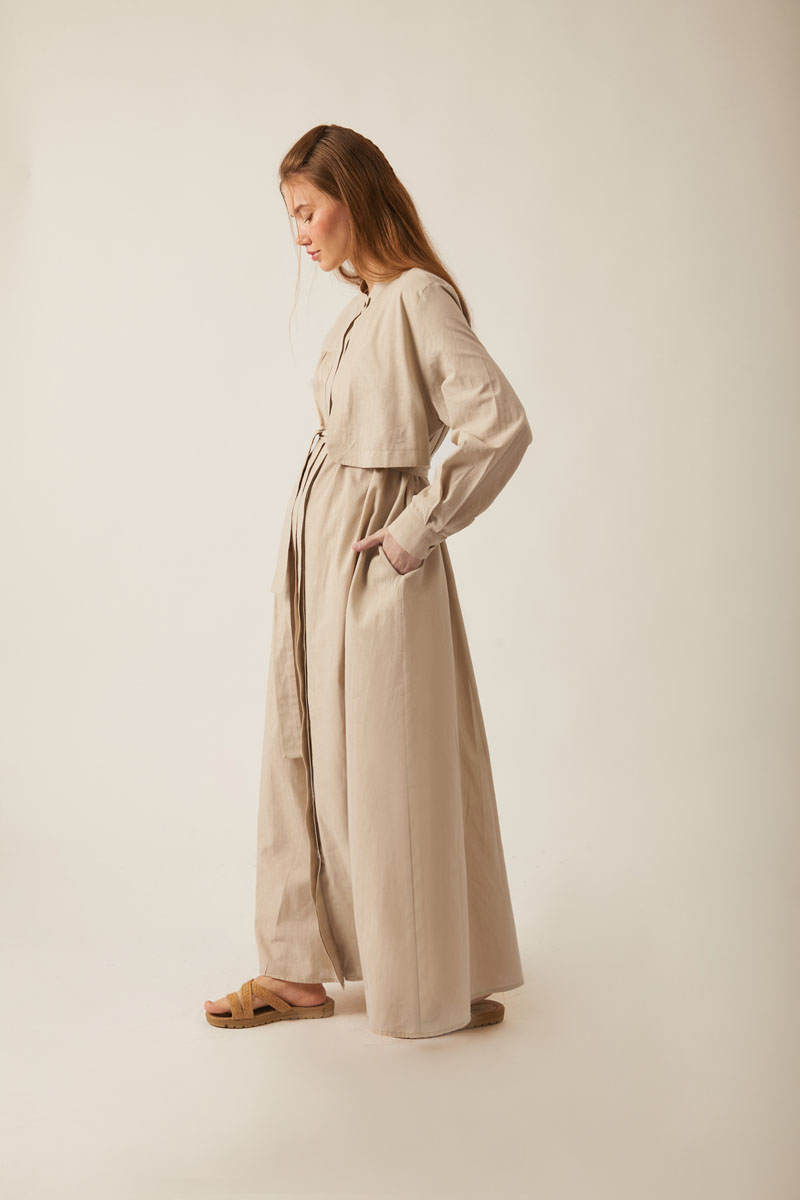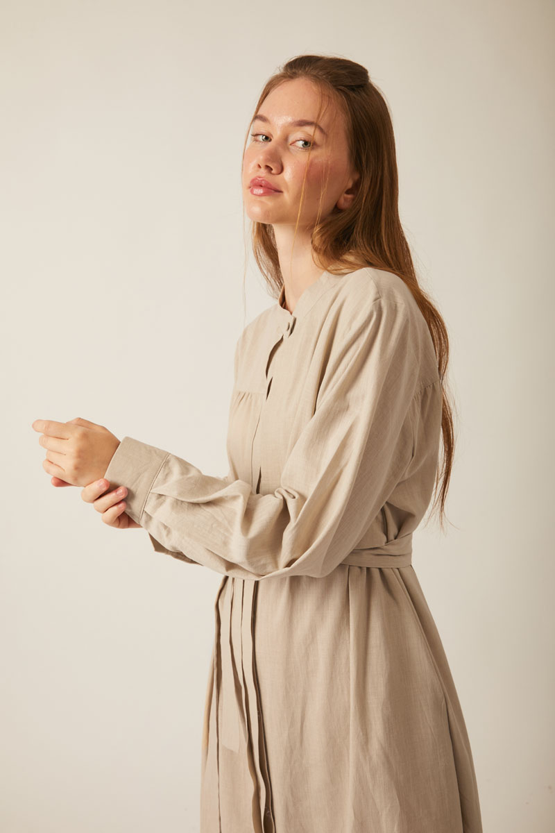 Feel the freshness of natural textures with this slub linen dress that brings together elegance and comfort. It blends an authentic look with a modern design, offering all-day ease of wear. Its relaxed fit provides freedom of movement, while the self-fabric belt allows you to cinch the waist for a graceful silhouette.