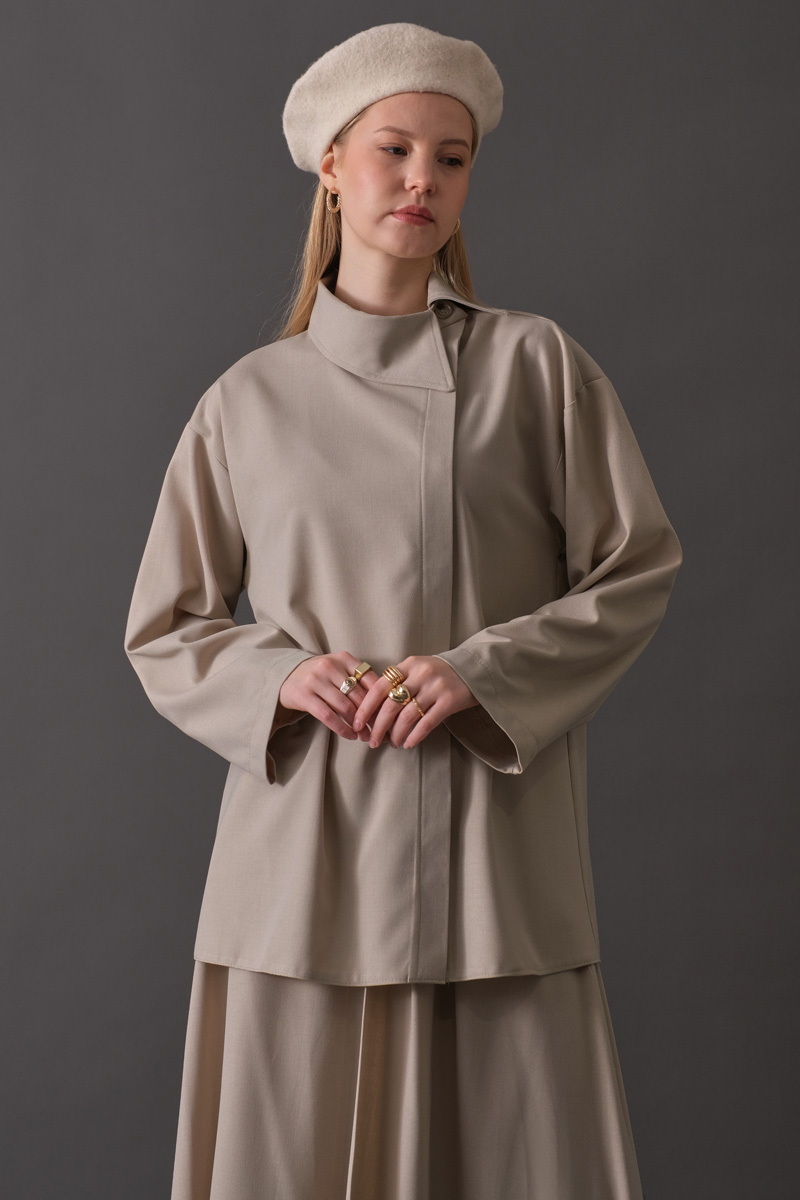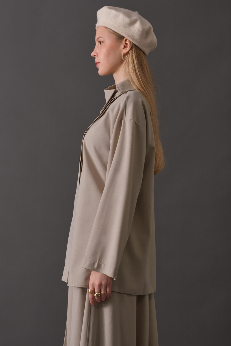 Asimetrik Yaka Gömlek Koyu Taş, modern ve minimal çizgileri sevenler için tasarlandı. Asimetrik yakasıyla klasik gömlek formuna yenilikçi bir dokunuş katan model, dökümlü yapısıyla gün boyu konfor sunar. Gizli pat kapaması sayesinde temiz ve sade bir görünüm oluştururken, rahat kalıbı hem ofis hem günlük stil için çok yönlü bir kullanım sağlar.