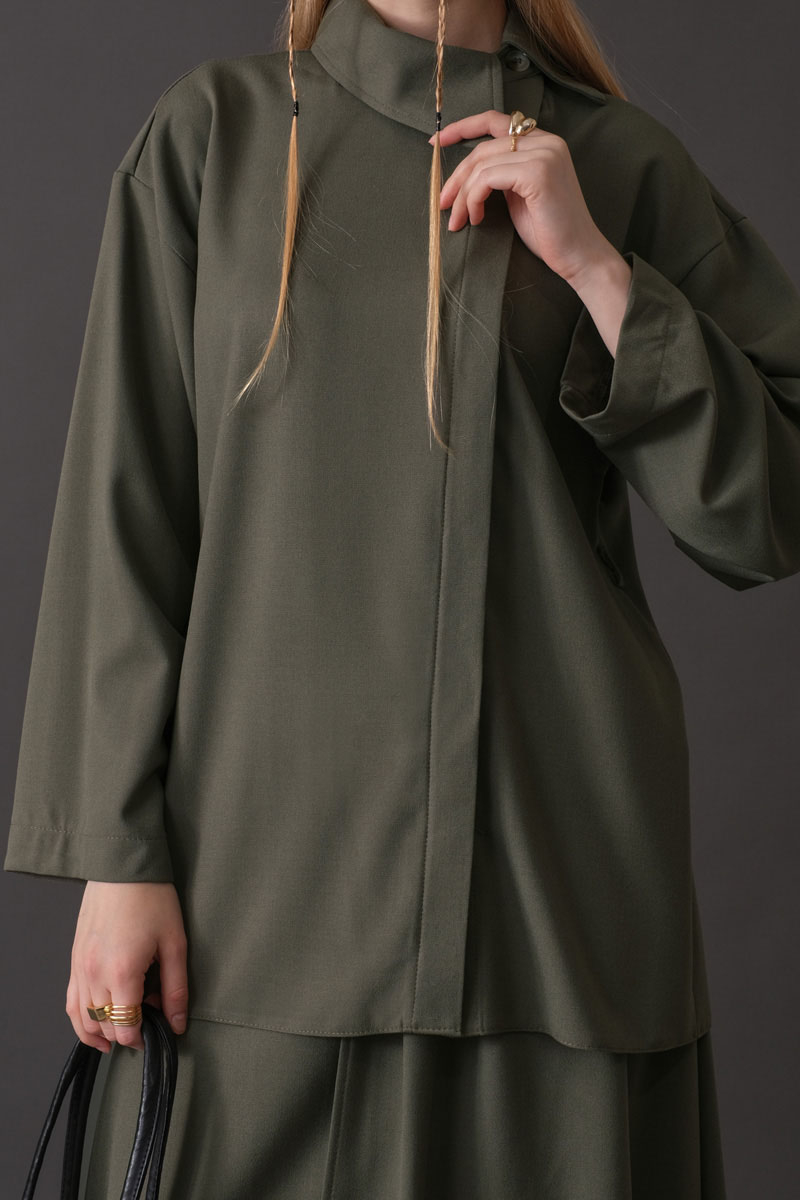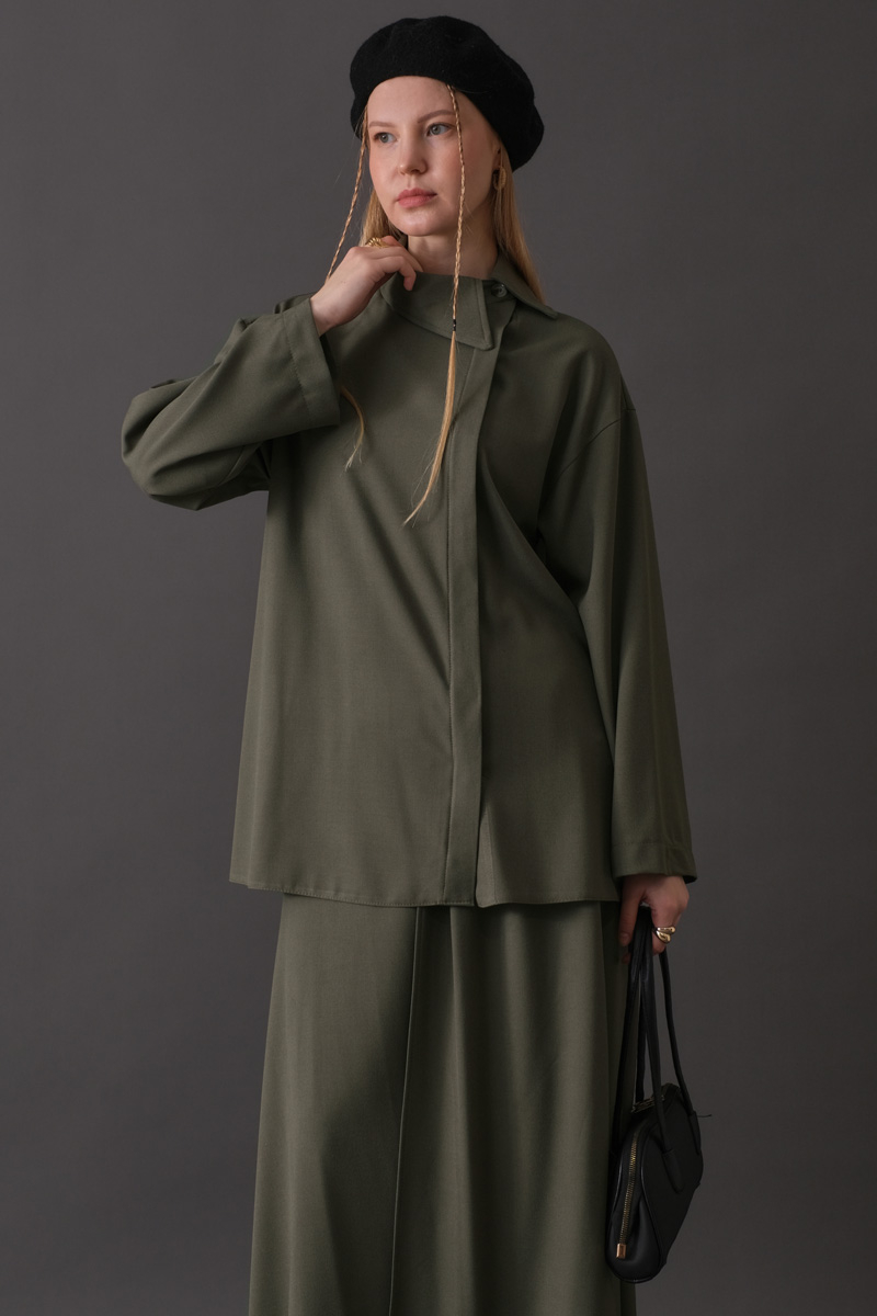 The Asymmetric Collar Shirt in Khaki is designed for those who appreciate modern and minimal lines. With its asymmetric neckline, it adds a contemporary twist to the classic shirt form, while the draped structure provides all-day comfort. The concealed placket creates a clean and refined look, and the relaxed fit makes it a versatile choice for both office and everyday style.