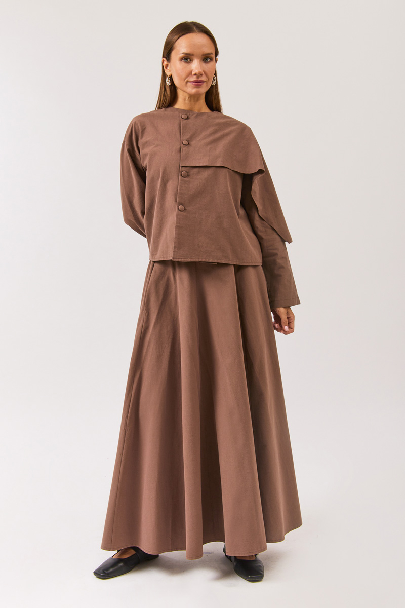 Asymmetric Panel Shirt Brown, Perfect for those seeking a simple yet striking silhouette, this shirt combines minimal button details with an asymmetric hem to reflect a sophisticated urban style. Its clean and contemporary form makes it a versatile piece that can be worn both for office days and special occasions.